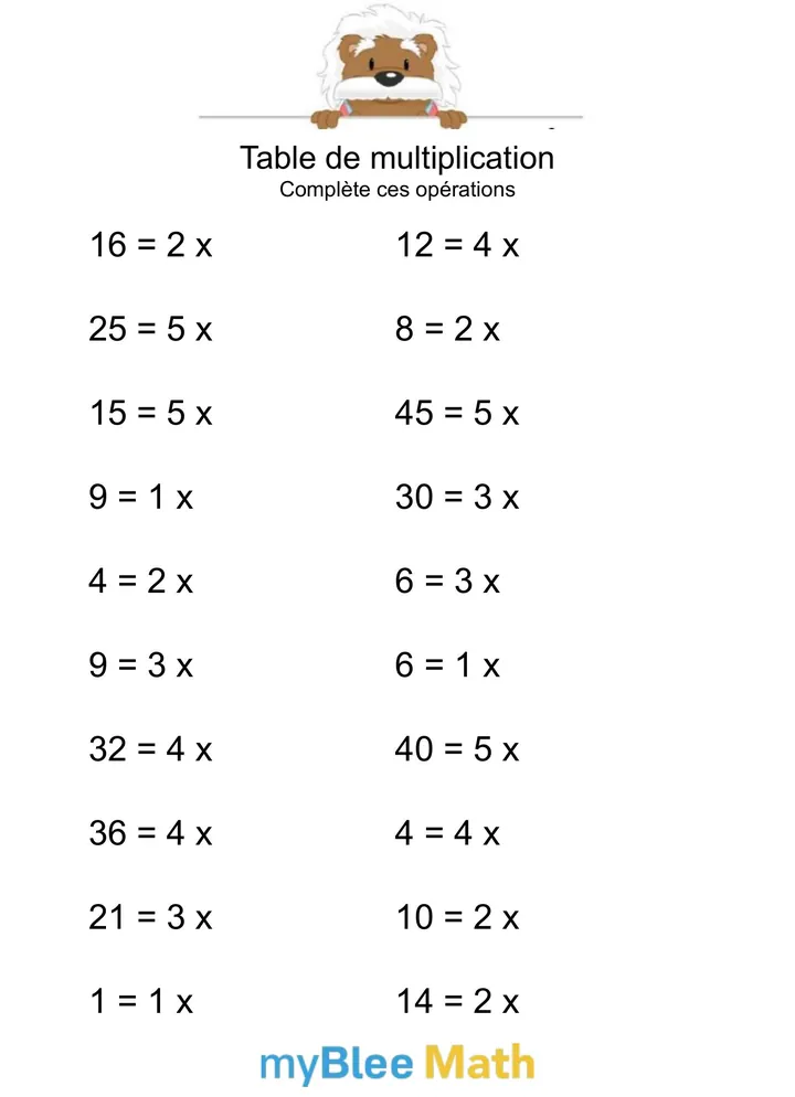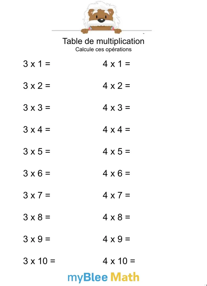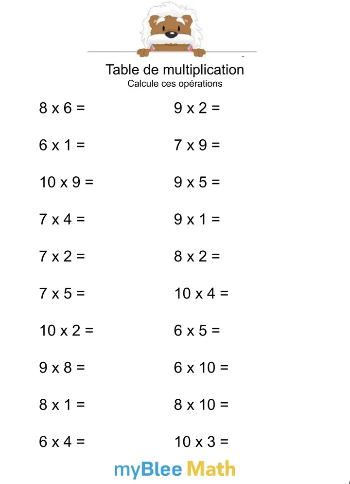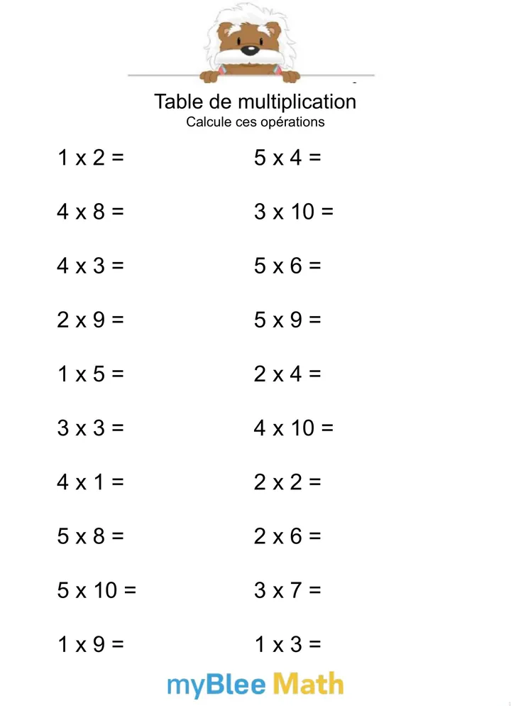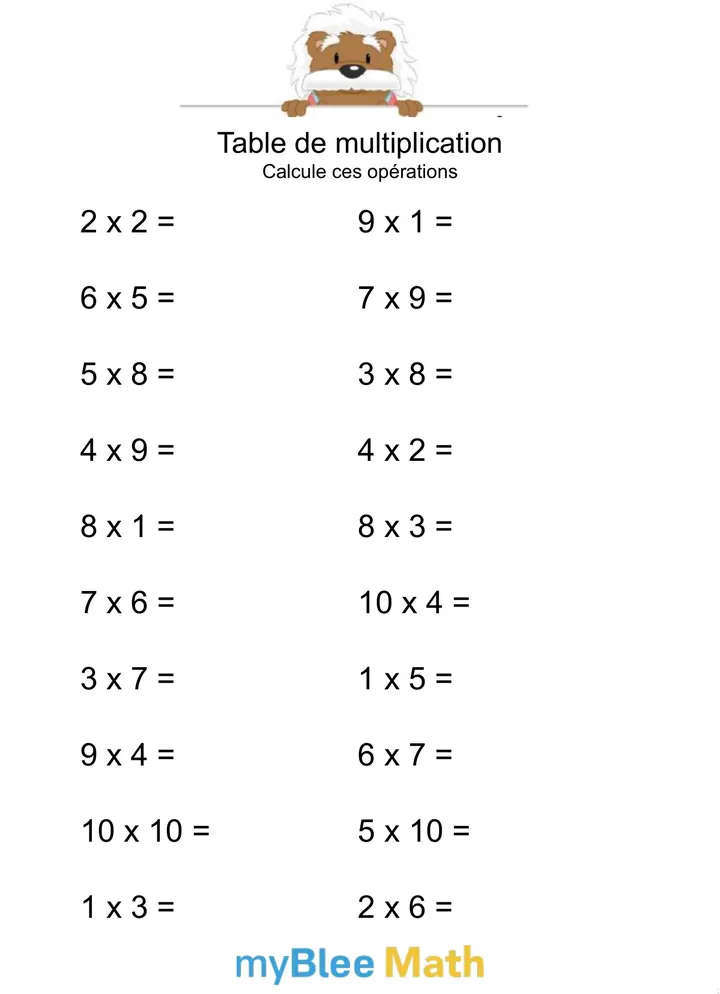 Pour aider les enfants à apprendre facilement les tables de multiplication, l’application MyBlee Math est aussi un excellent complément aux exercices papier. Conçue pour les élèves du primaire à la 6ème, elle propose des exercices interactifs adaptés au niveau de chacun, avec des activités ludiques pour apprendre en jouant. Les enfants peuvent s’exercer à leur rythme, réviser les tables de 2 à 10, et recevoir un retour immédiat sur leurs réponses.