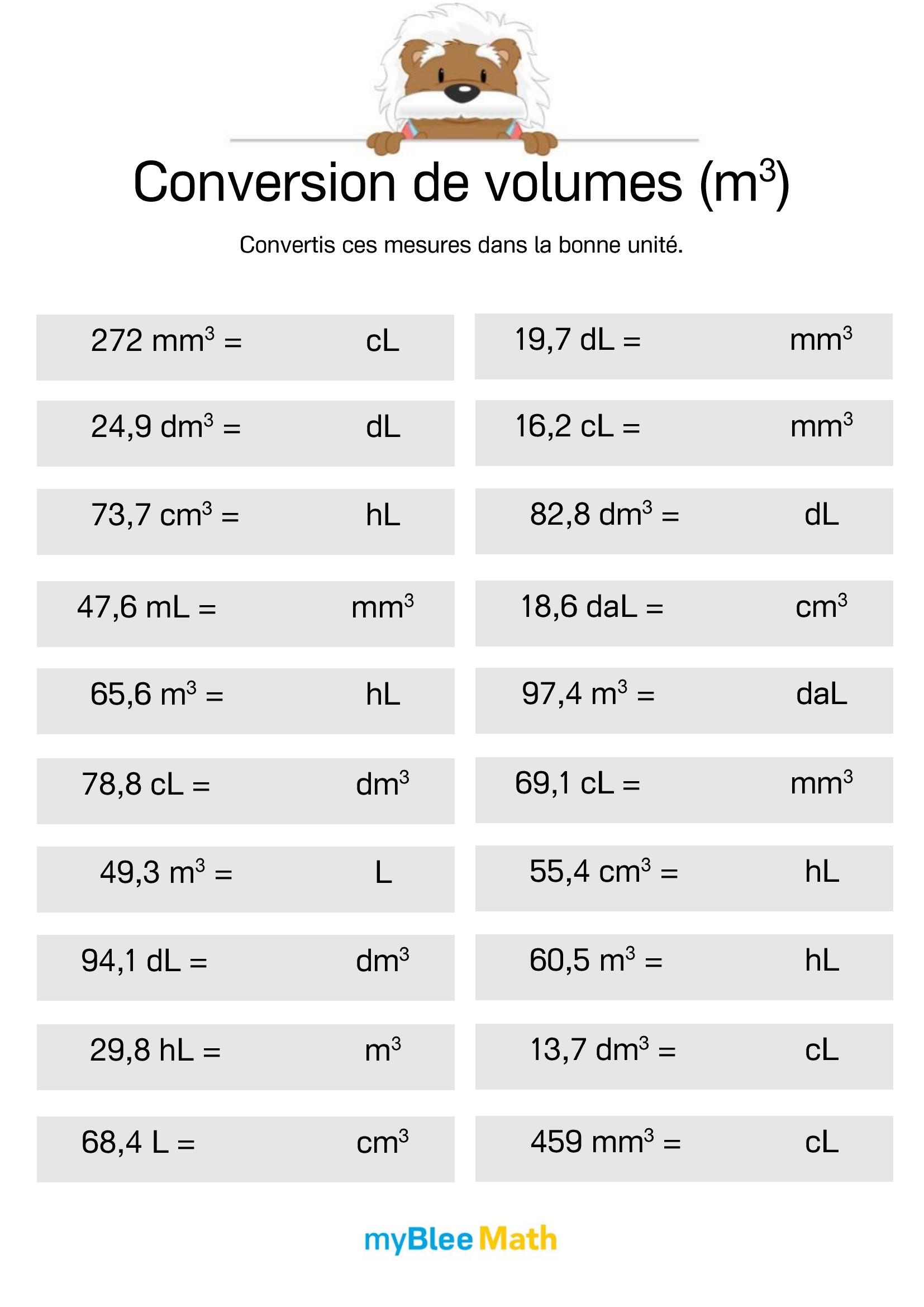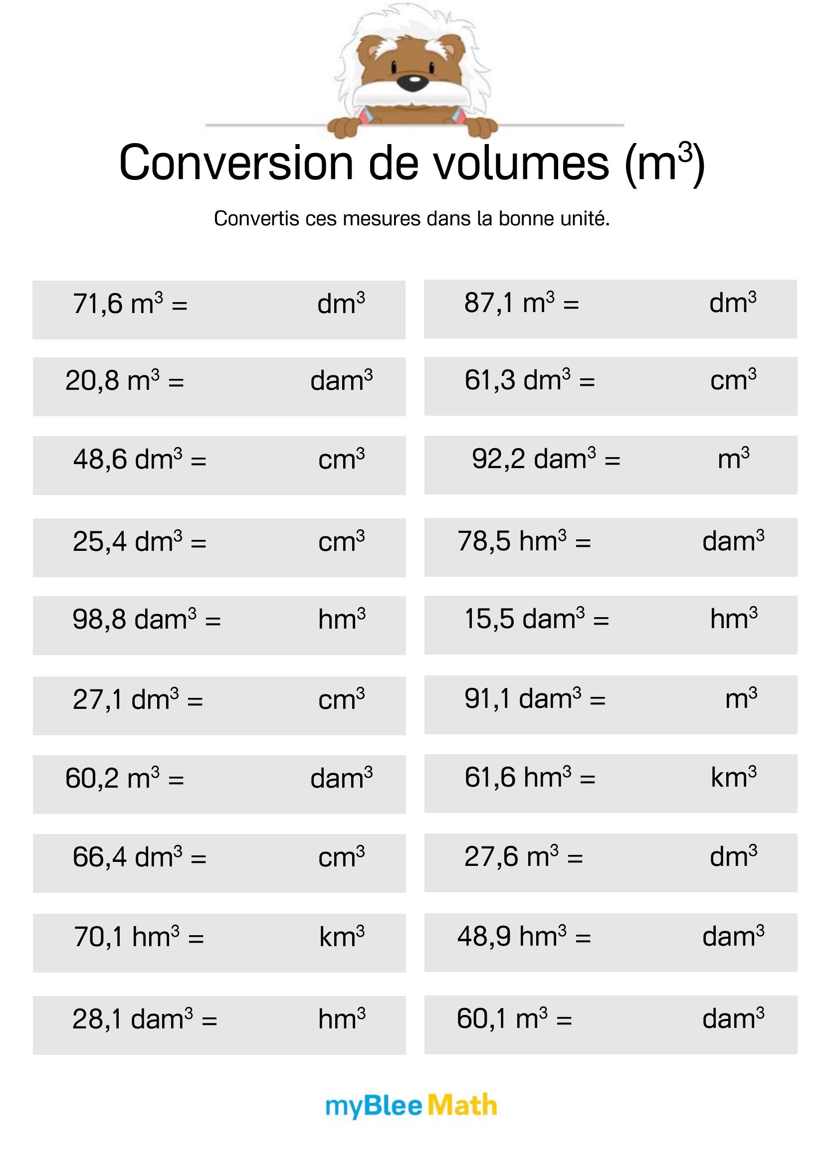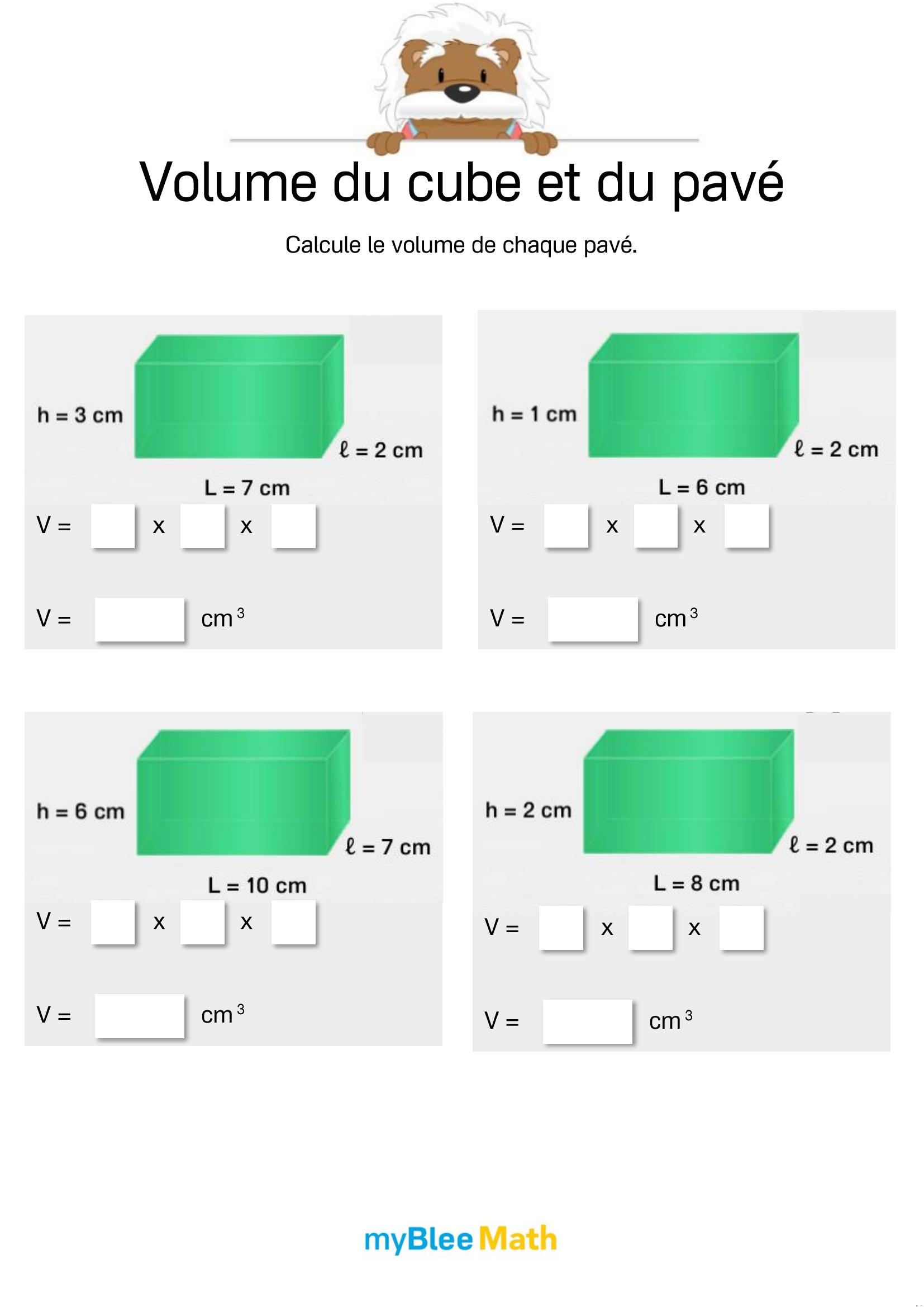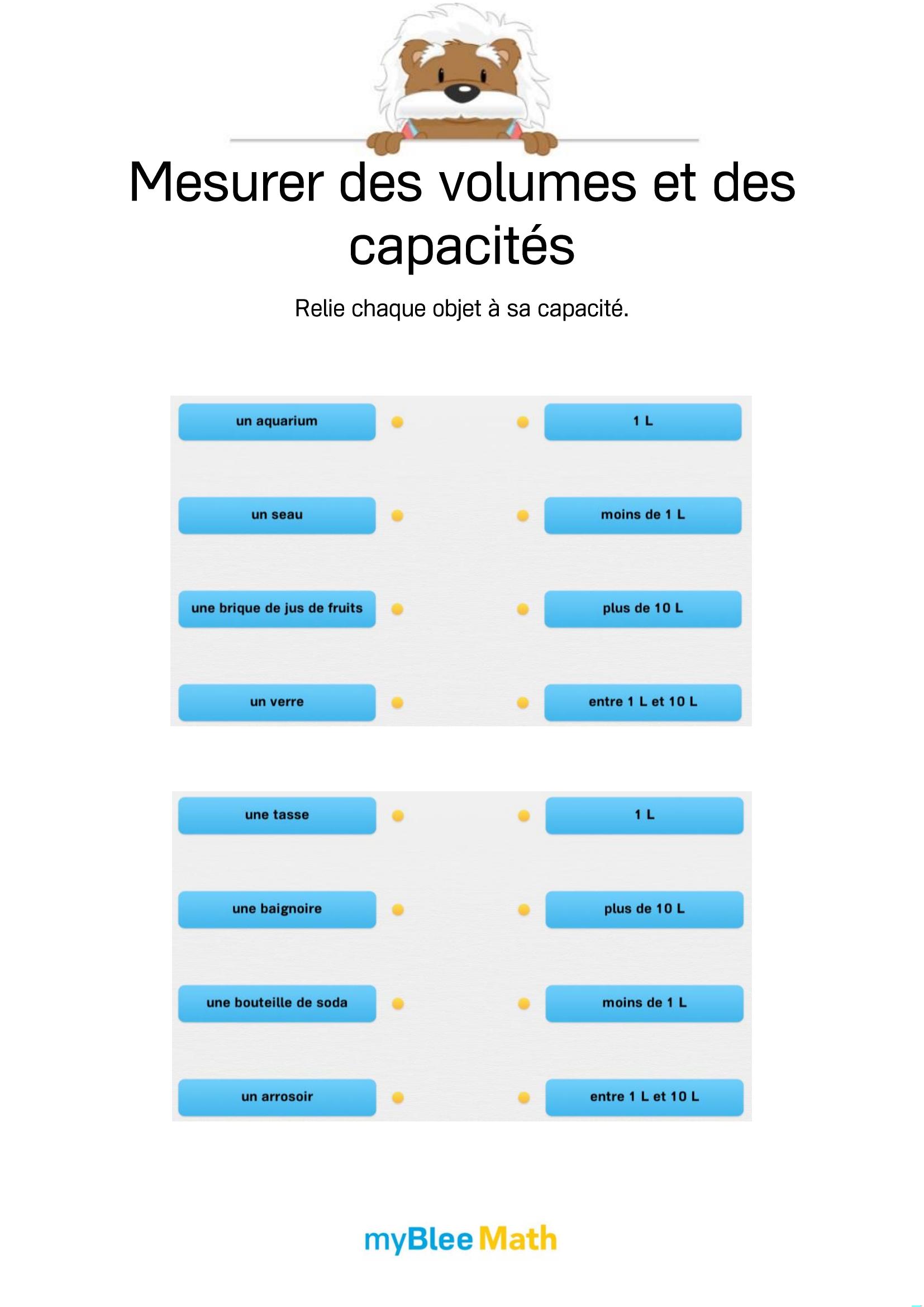 Exercez-vous au calcul du volume et de la masse avec myBlee Math. Des fiches à imprimer et des activités interactives pour comprendre ces notions clés dès l’école primaire.