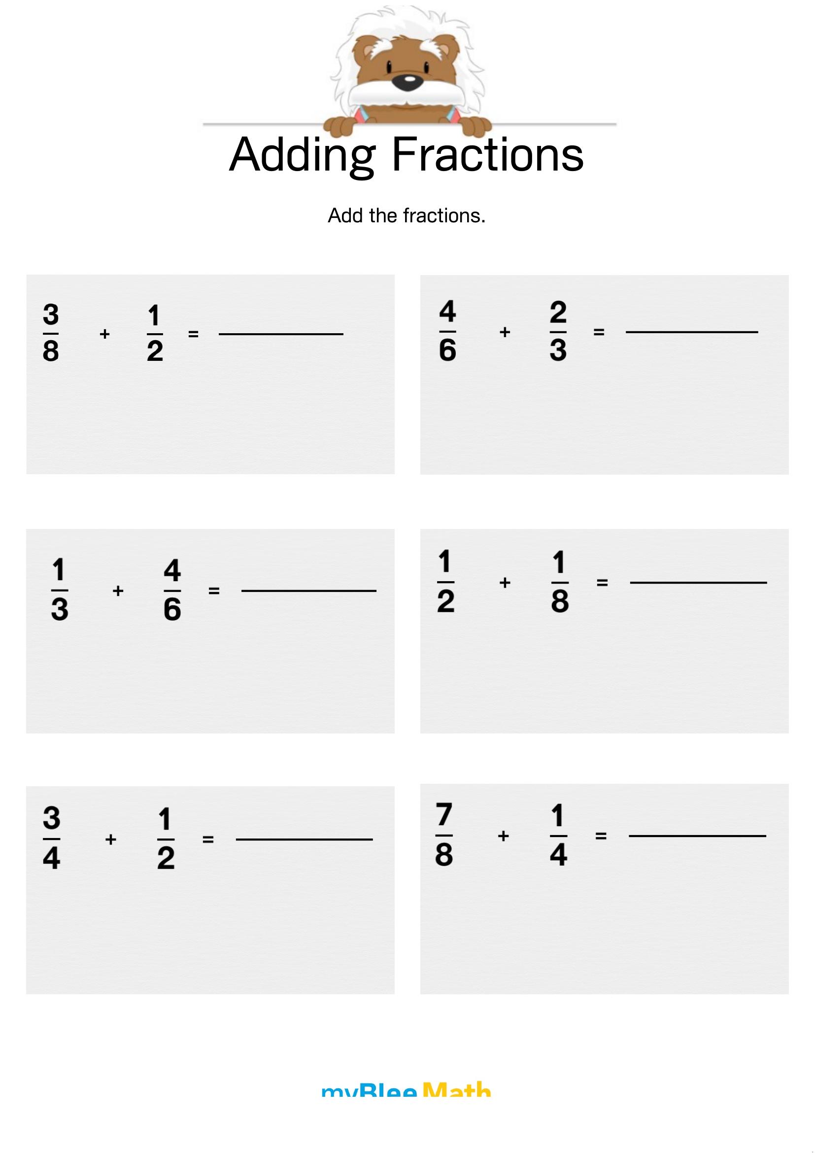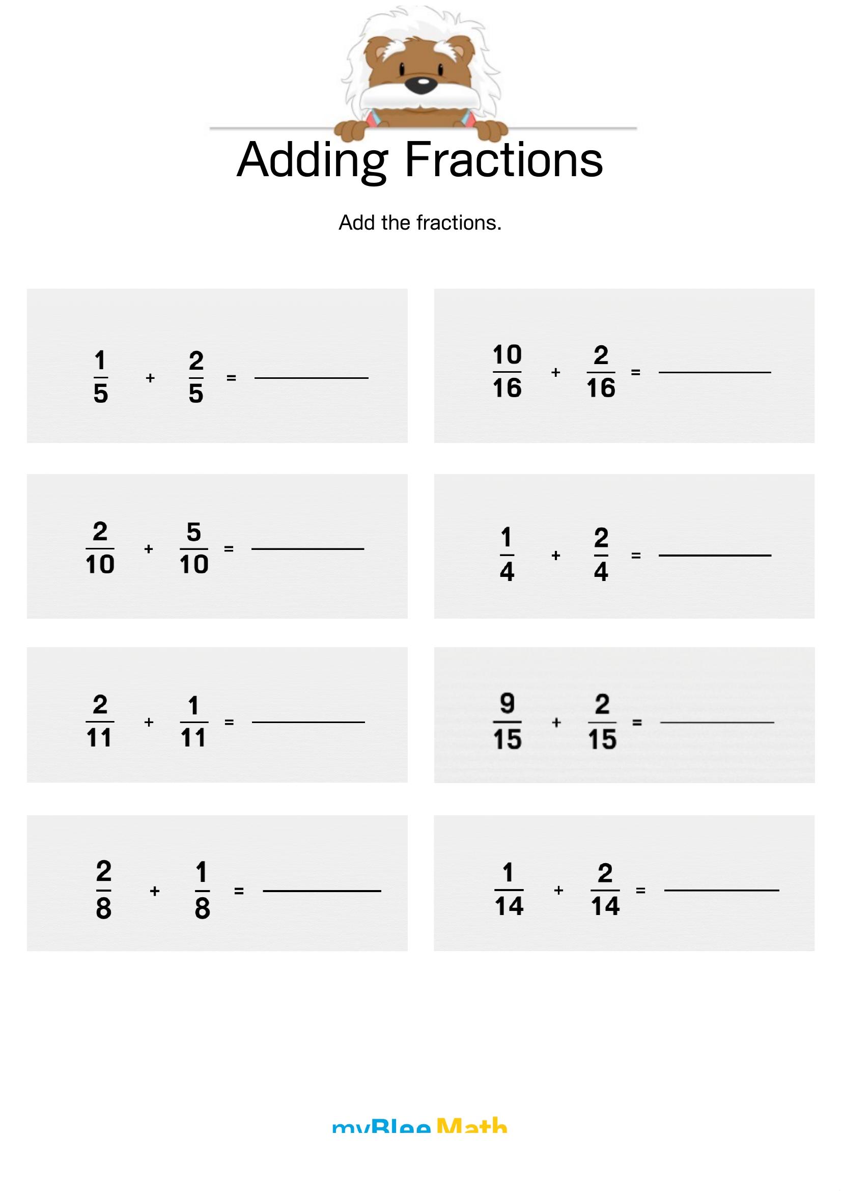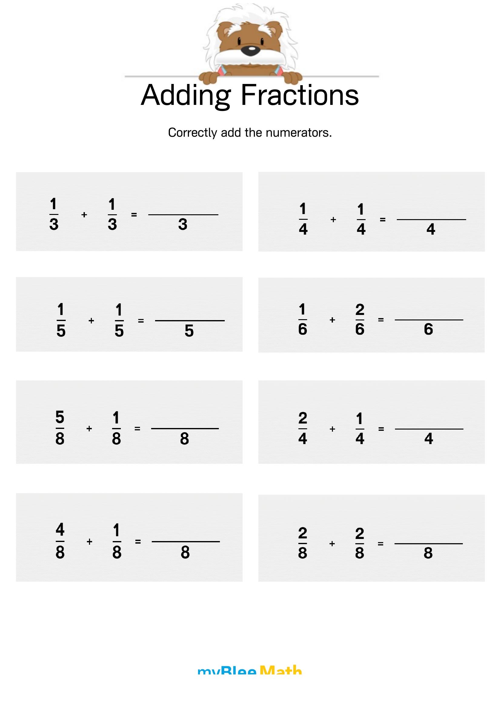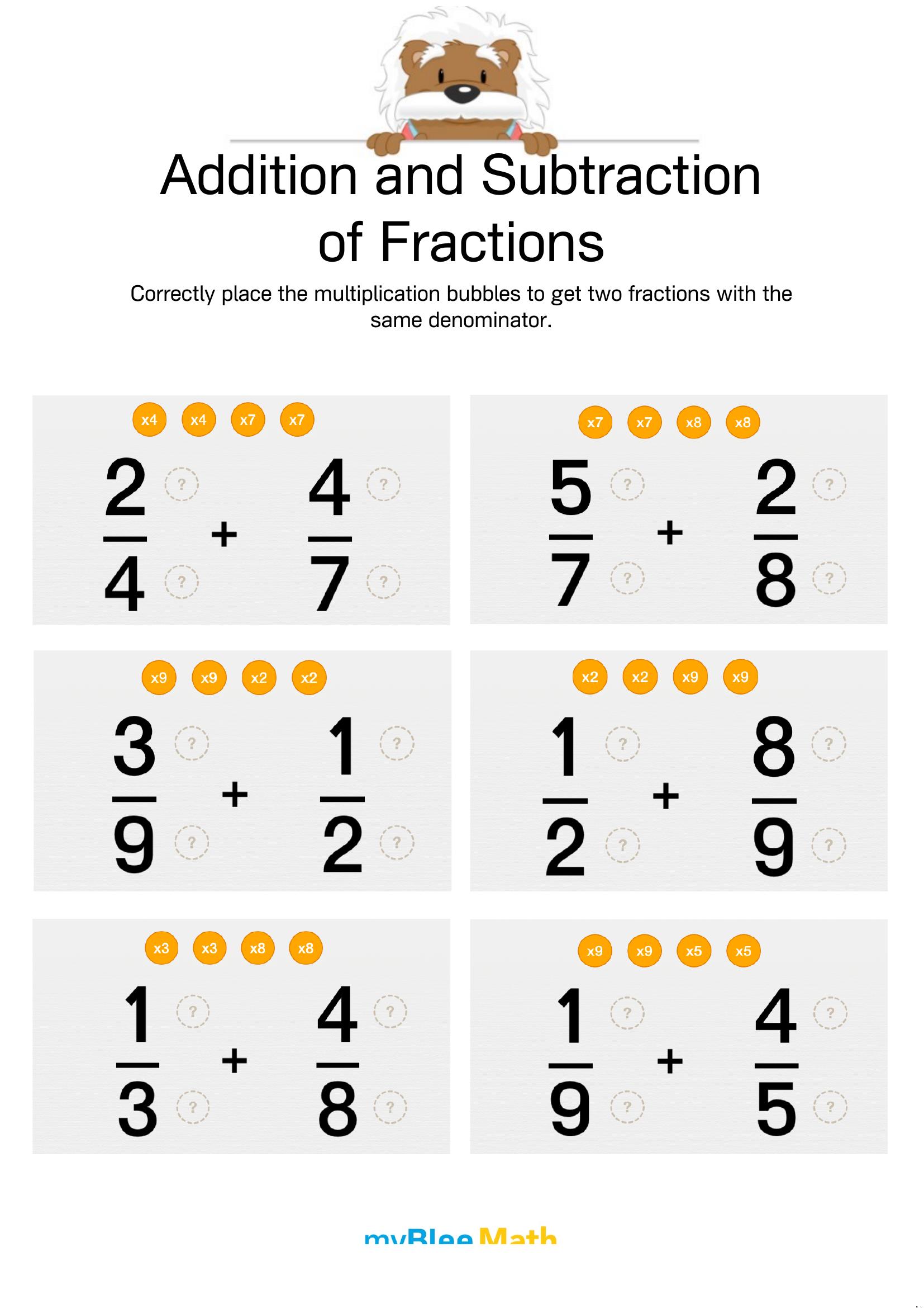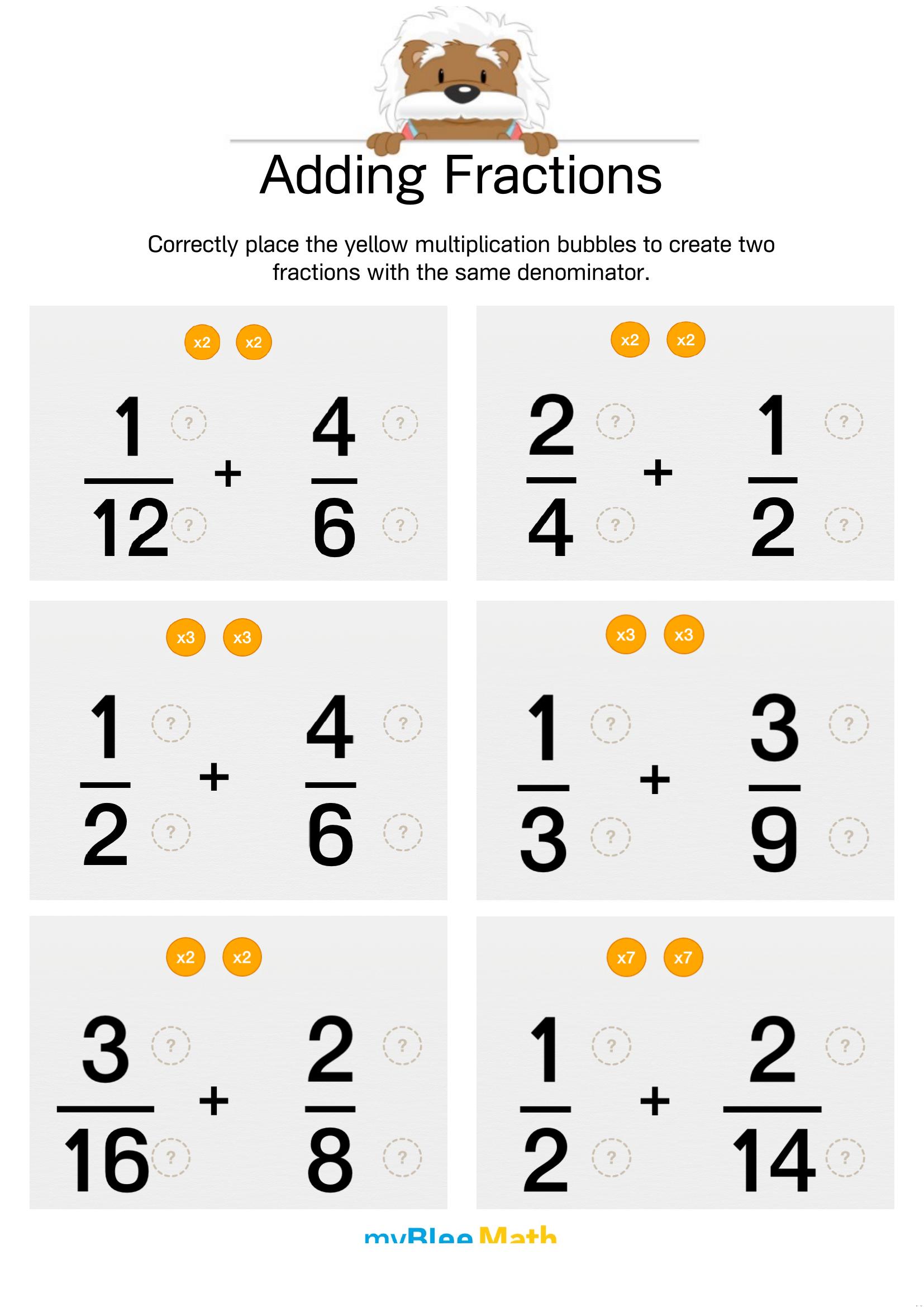 Fraction addition exercises teach how to combine parts to form a larger quantity. Your child discovers how to find a common denominator and add fractions simply, at their own pace.