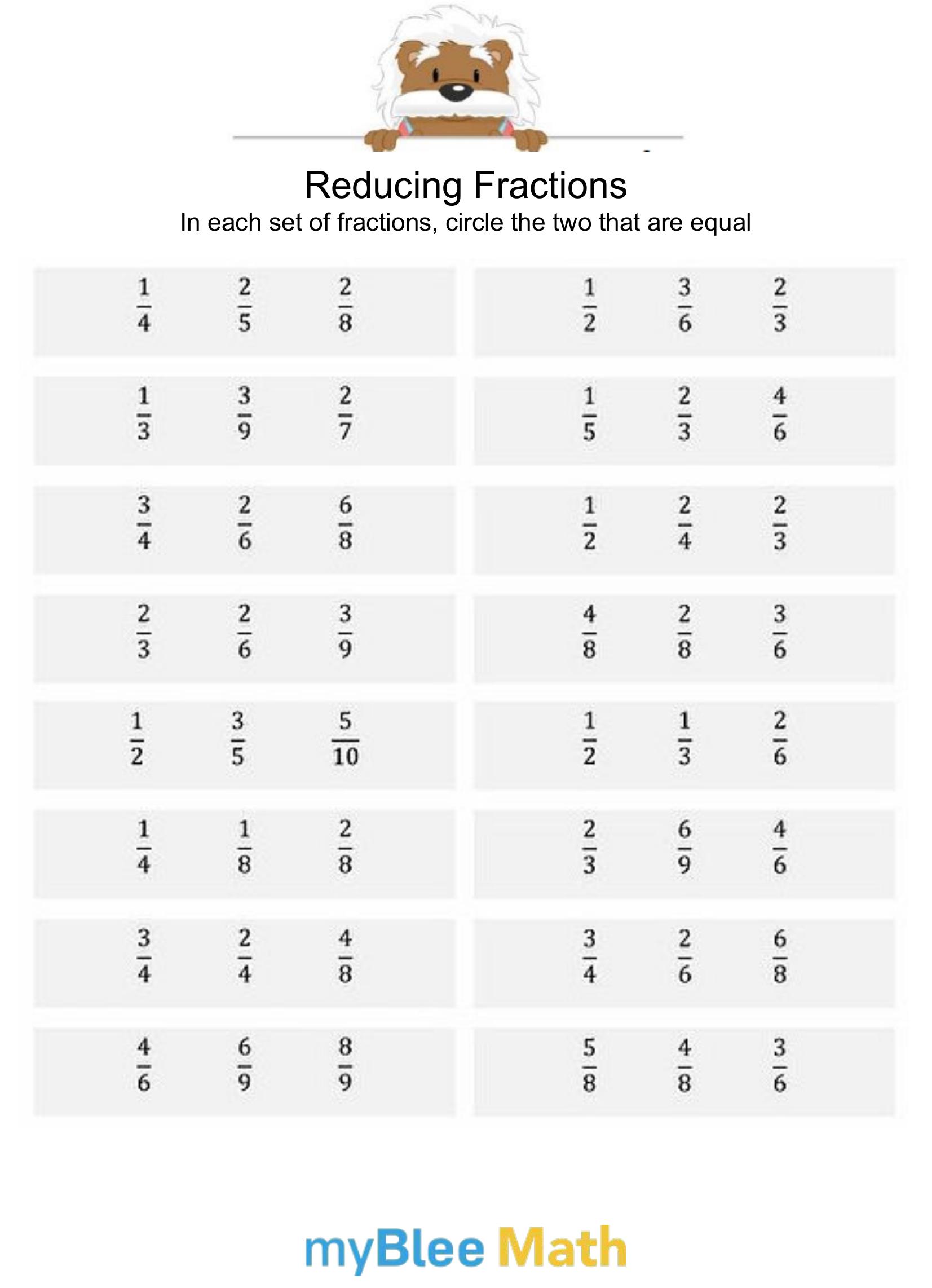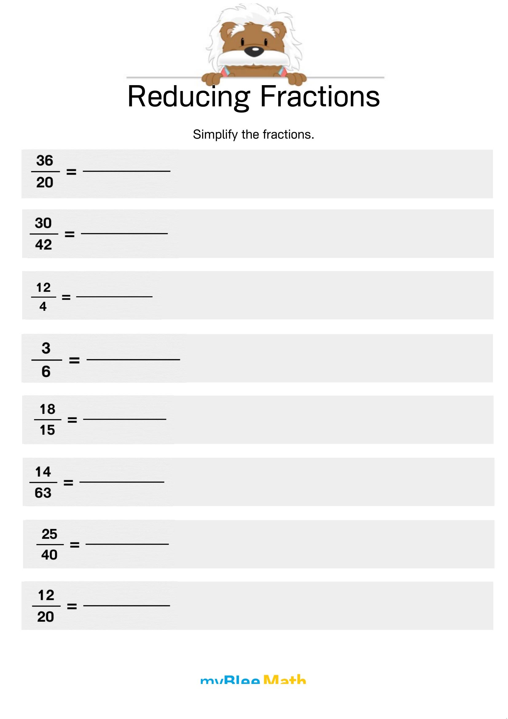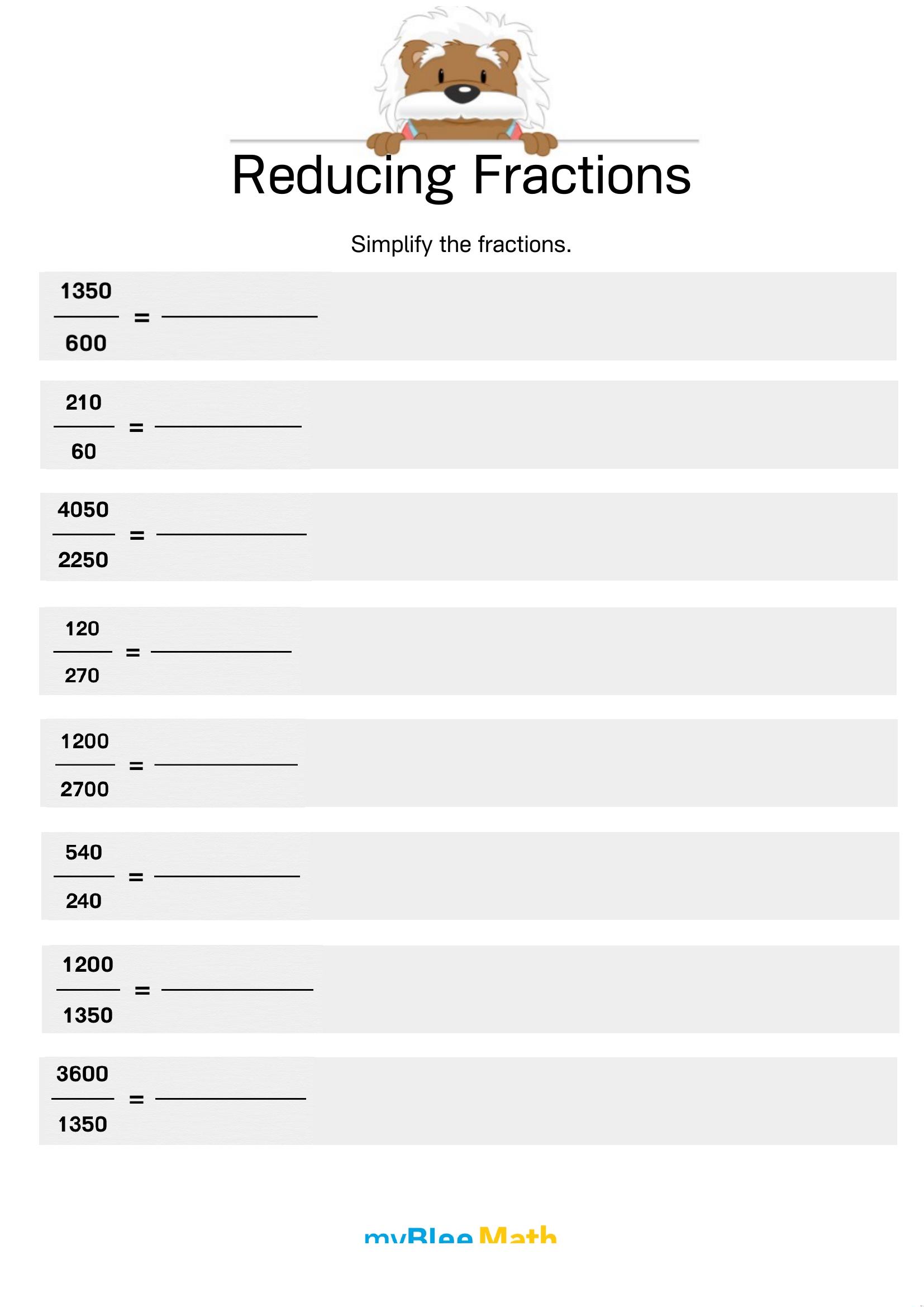 Simplification exercises show how to reduce a fraction by dividing the numerator and denominator by the same number. Your child learns to identify common numbers to obtain a simpler, more readable form.