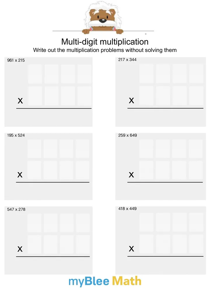 The goal of the exercise is to correctly set up the proposed multiplications, with units under units, tens under tens, etc. Boxes are drawn to guide the student.