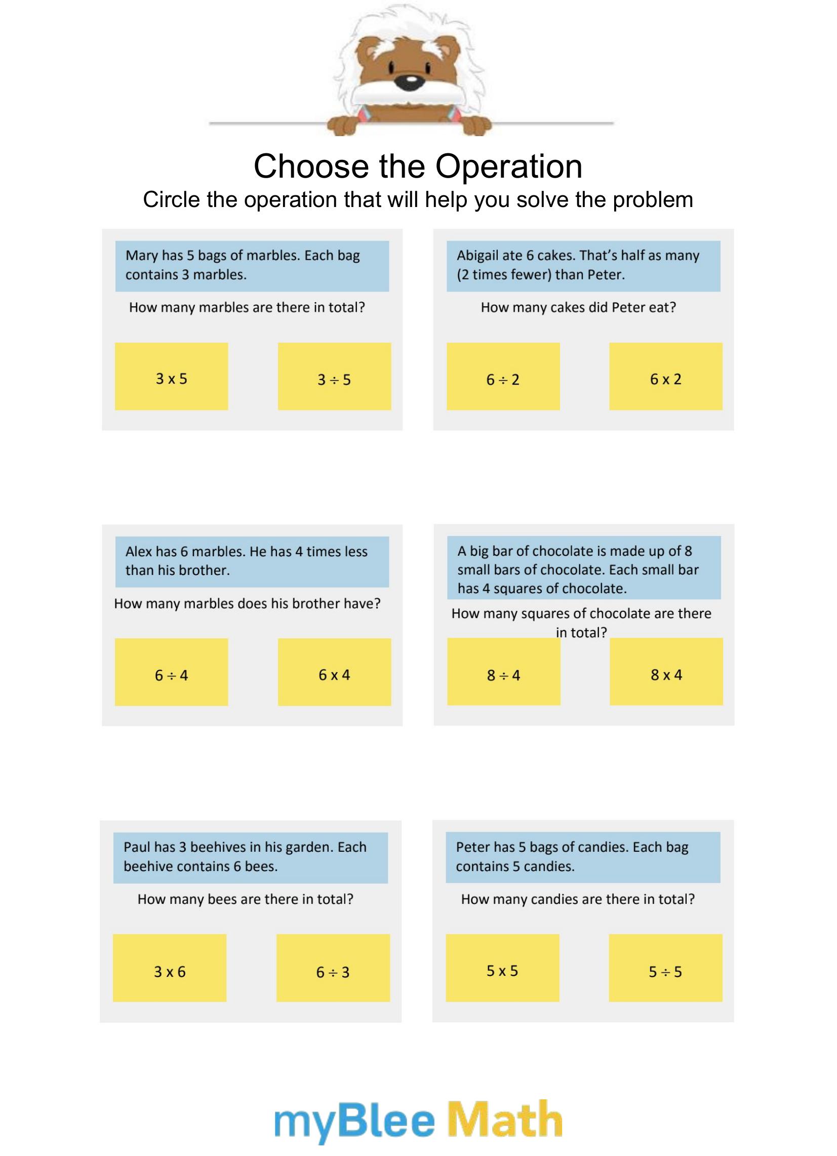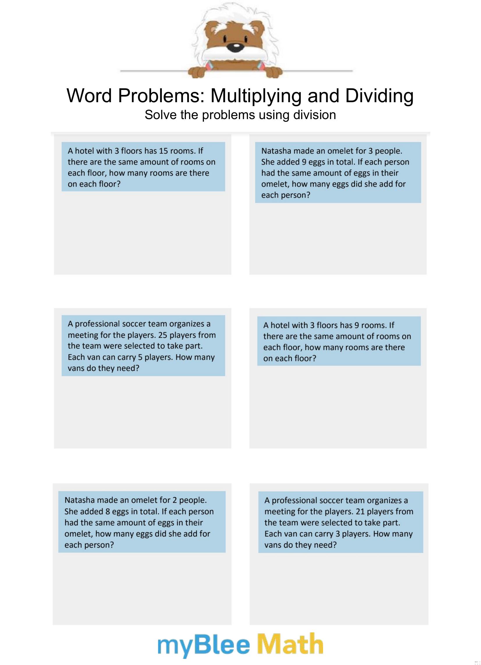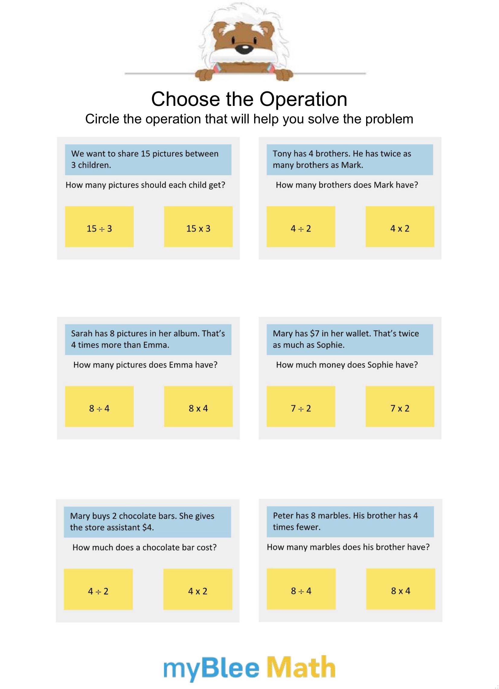 Problems using multiplications and divisions teach how to understand grouping, sharing or enlarging a quantity. The following exercises will help quickly recognize when to multiply or divide. They train students to structure reasoning and apply the correct operation methodically and accurately.