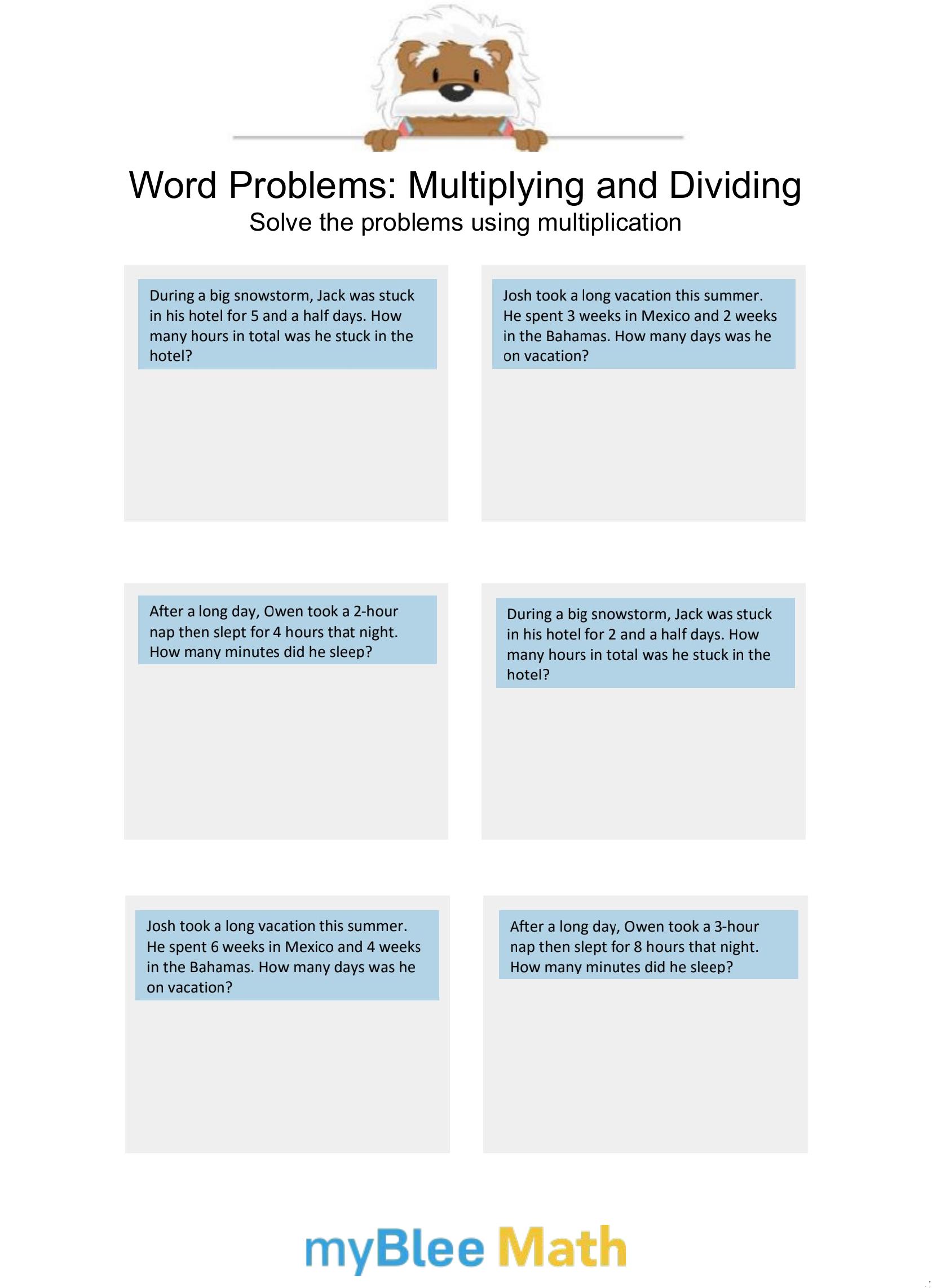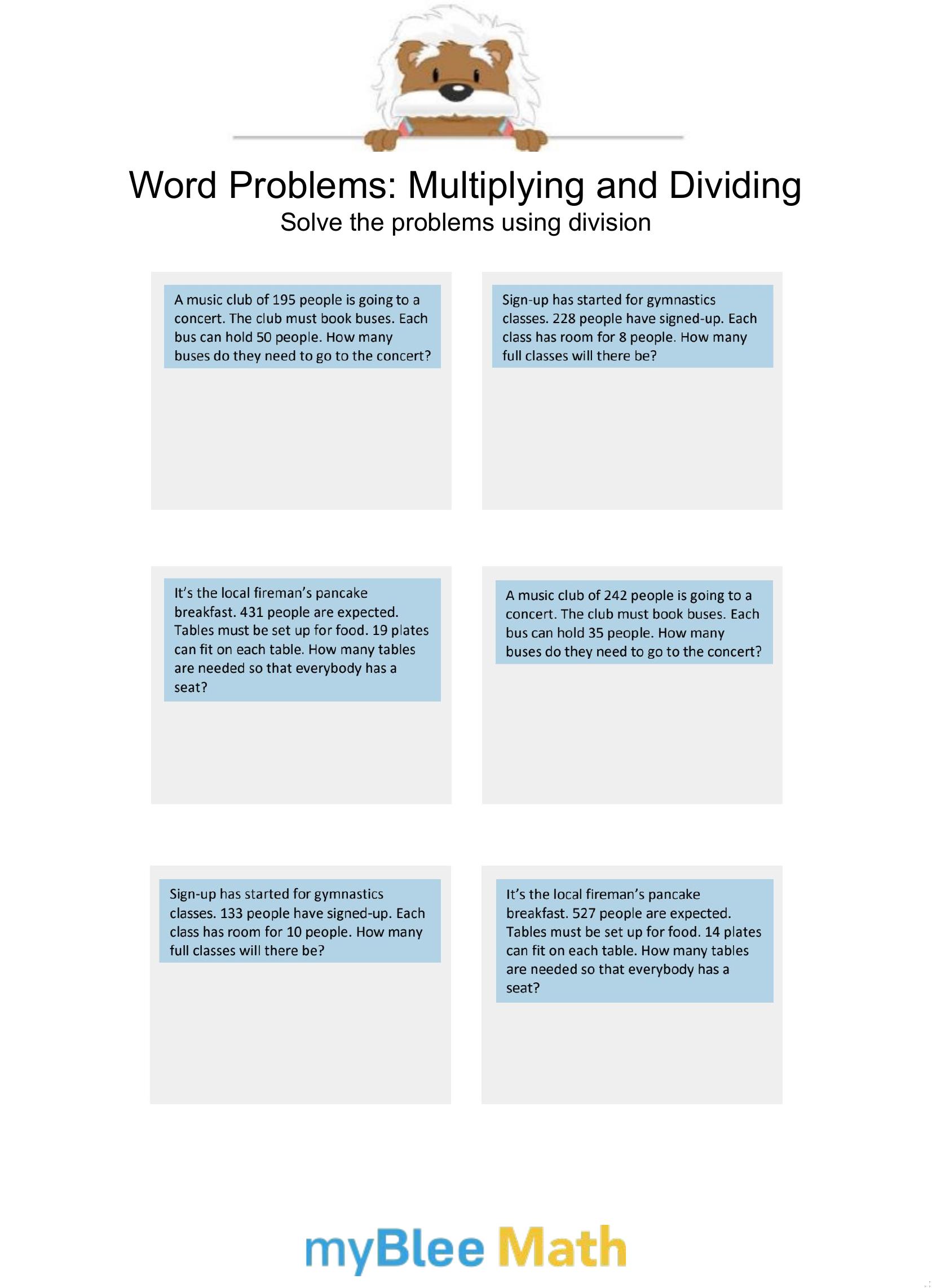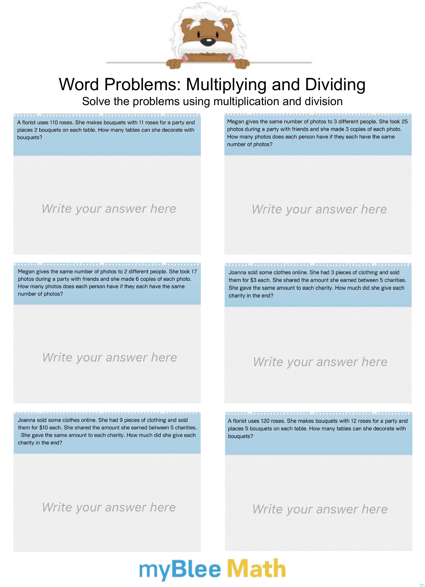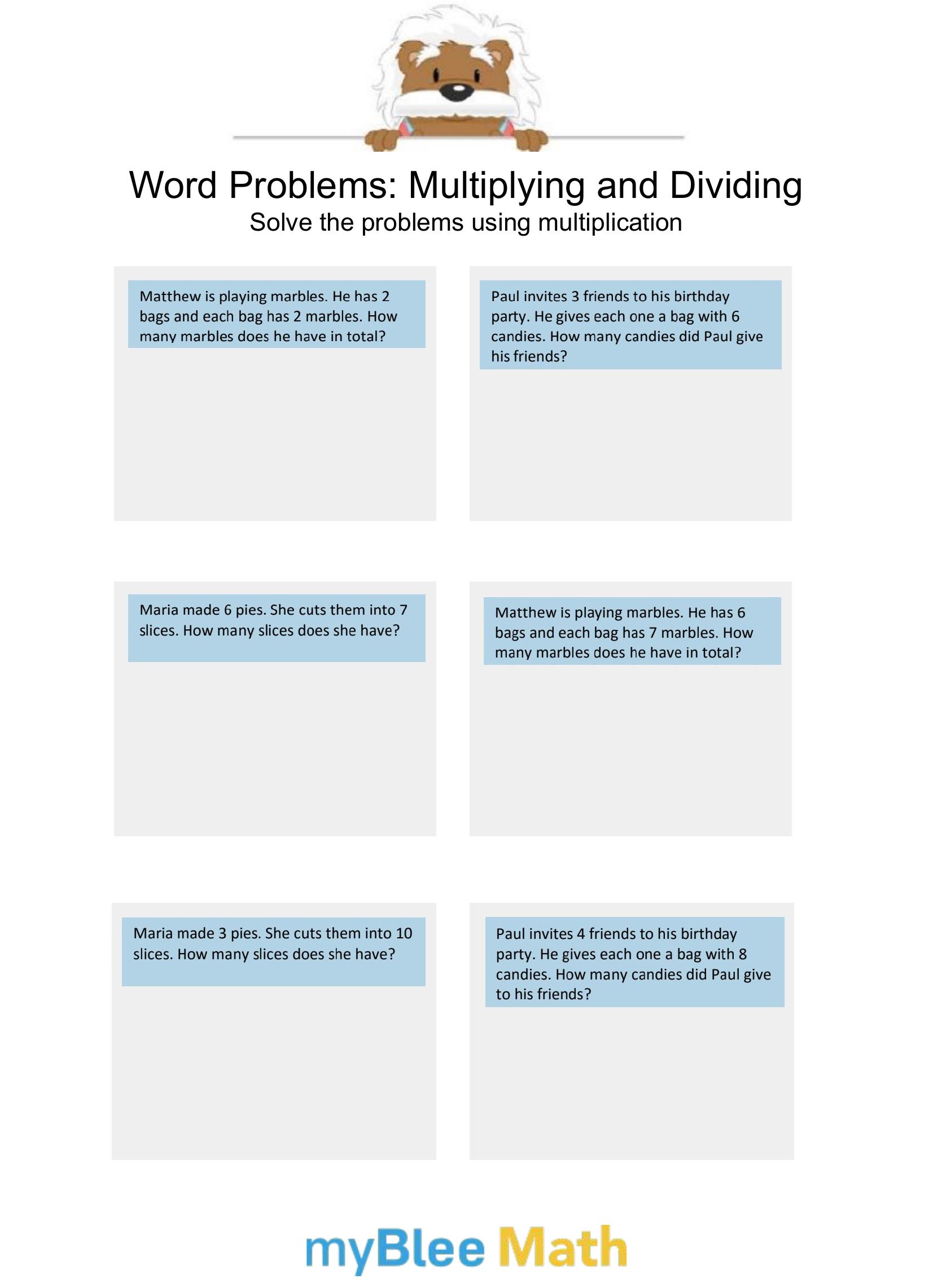 Problems using multiplications and divisions teach how to understand grouping, sharing or enlarging a quantity. The following exercises will help quickly recognize when to multiply or divide. They train students to structure reasoning and apply the correct operation methodically and accurately.