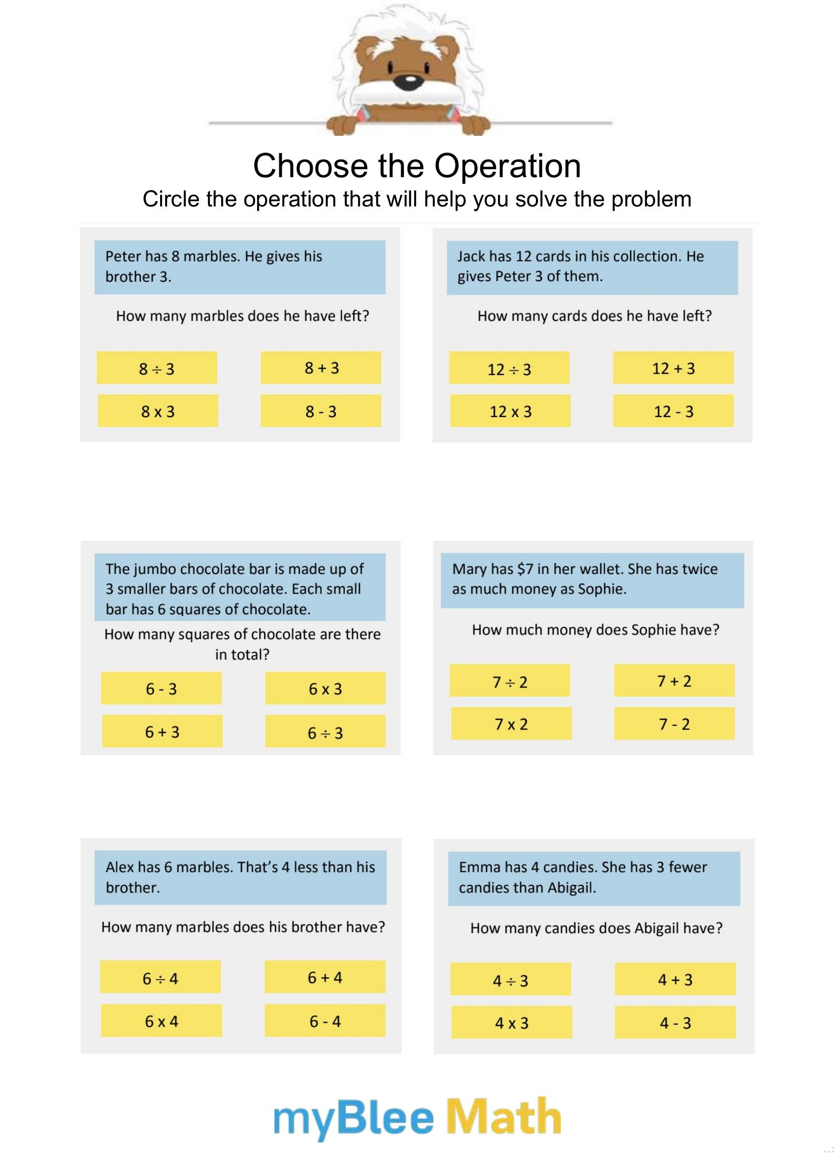 Knowing how to choose the right operation is essential to solve a problem effectively. The following exercises will train students to recognize situations that require adding, subtracting, multiplying or dividing. They help match each type of wording with the right calculation strategy and gain confidence in reasoning.