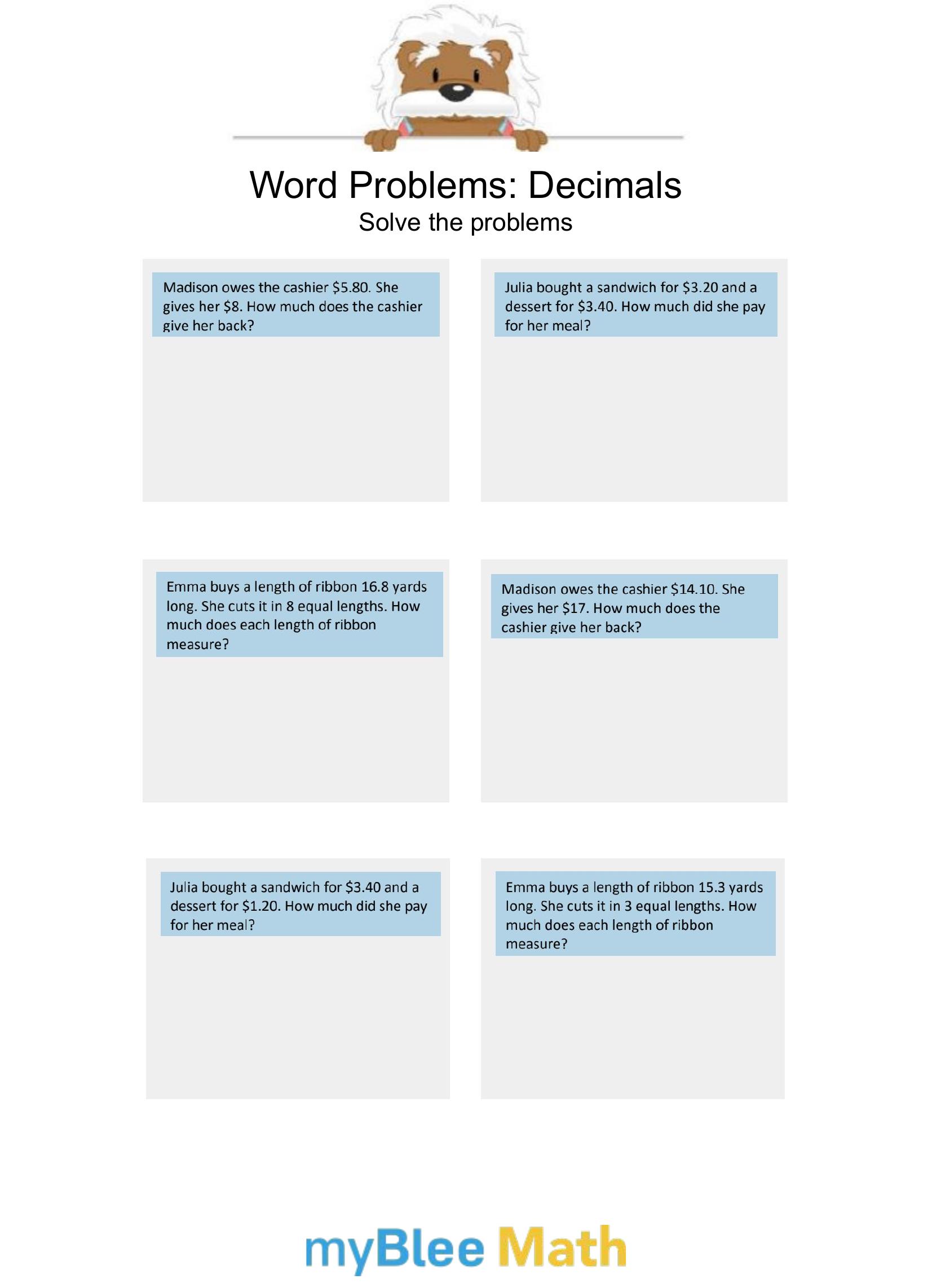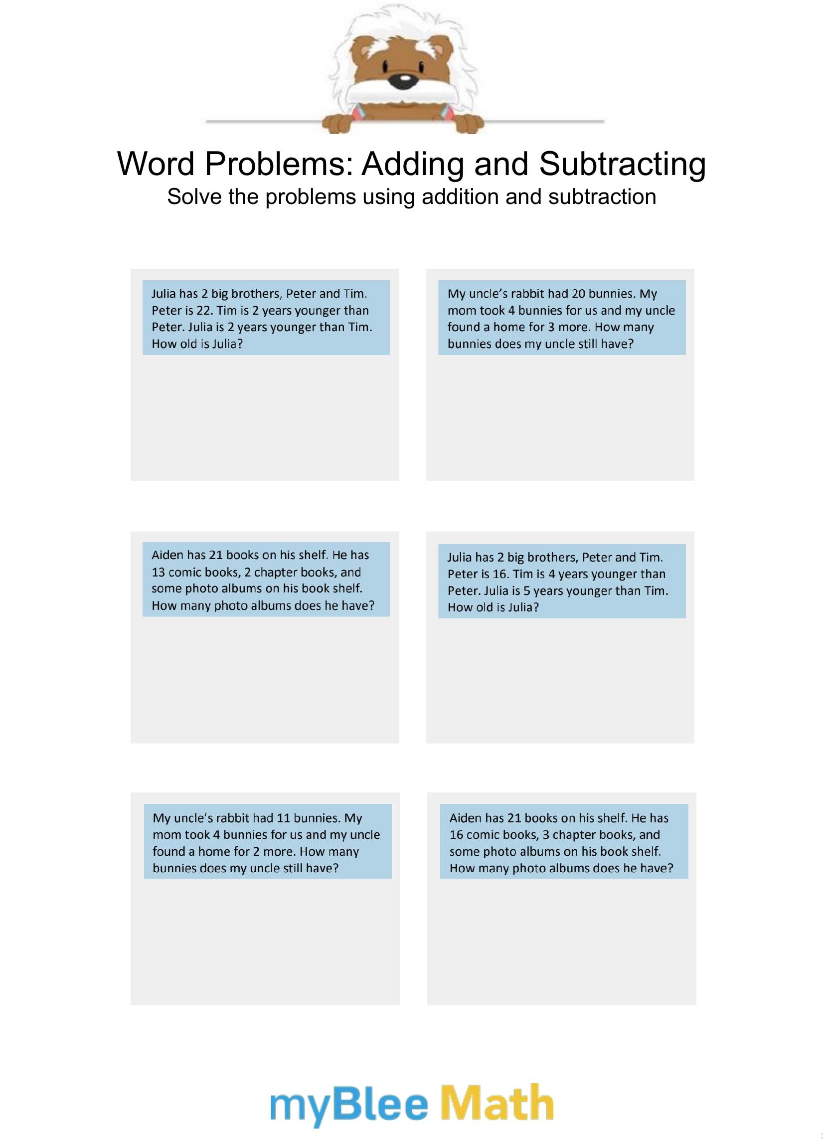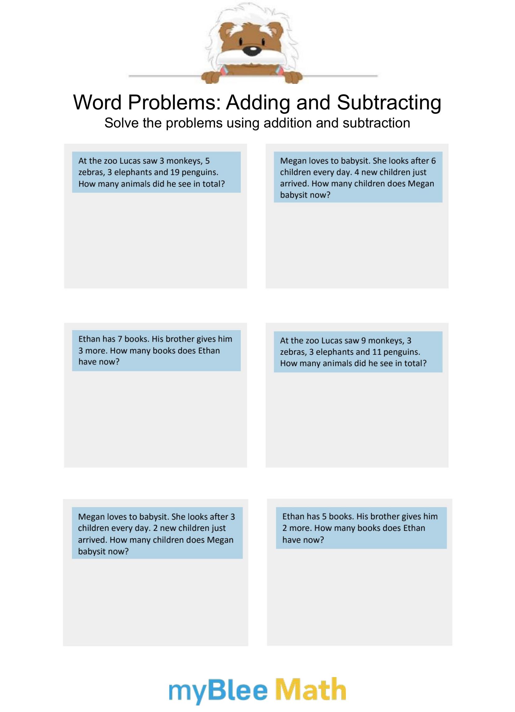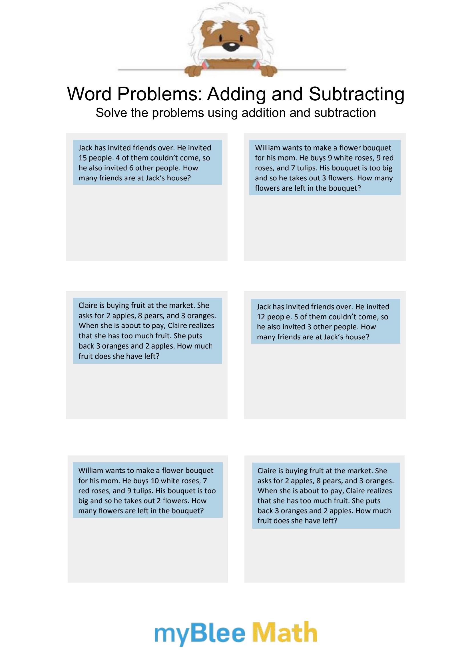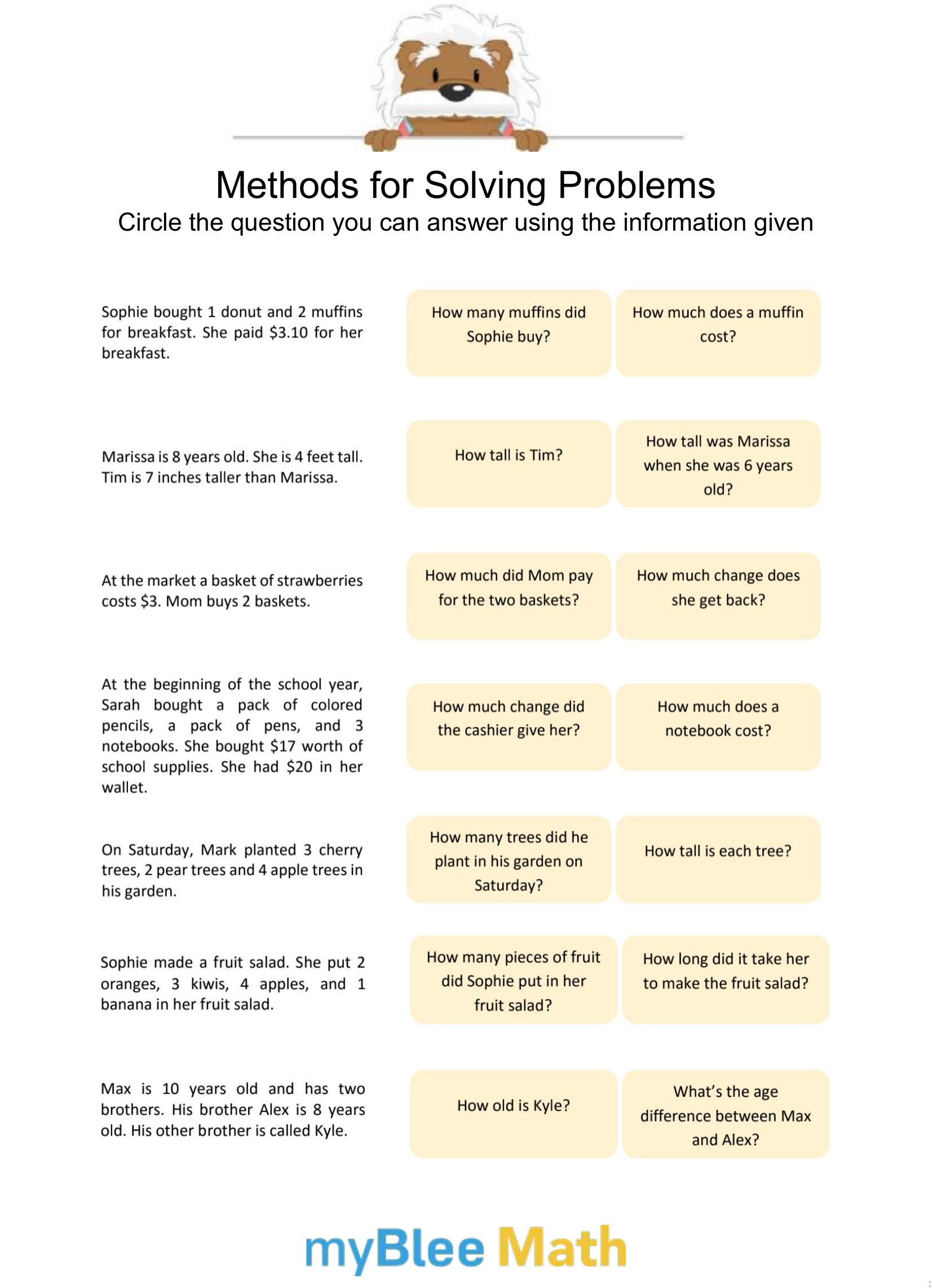 math problems require understanding a wording, identifying useful information and choosing the correct operation. To support this progression, we offer problem worksheets adapted to all grade levels.