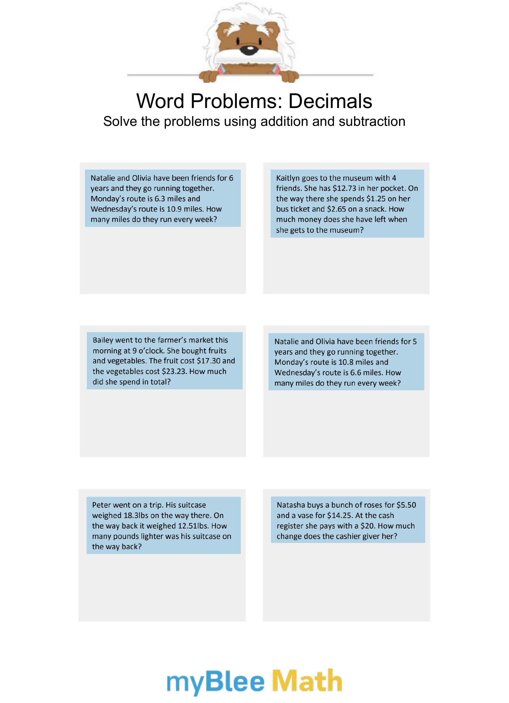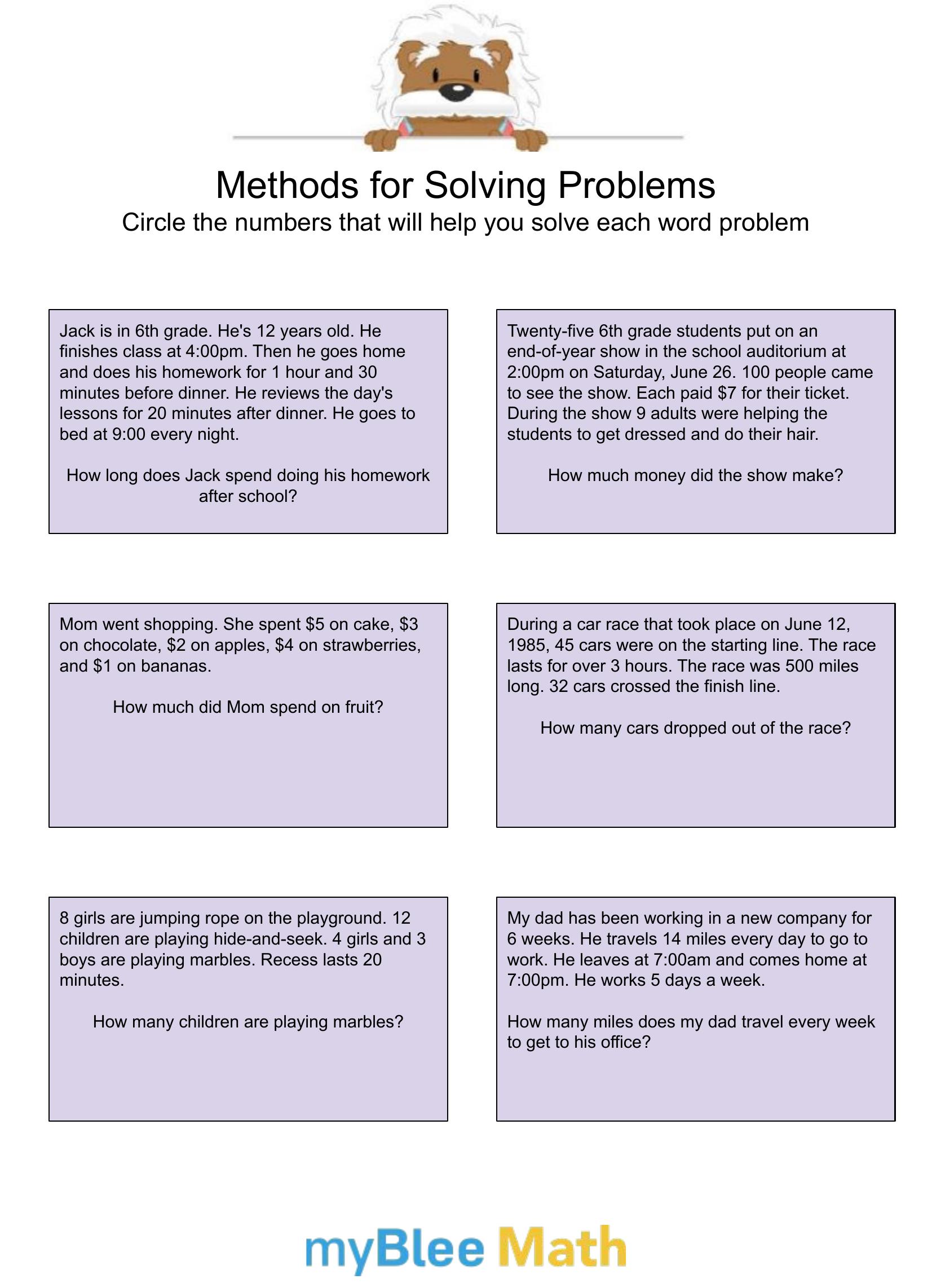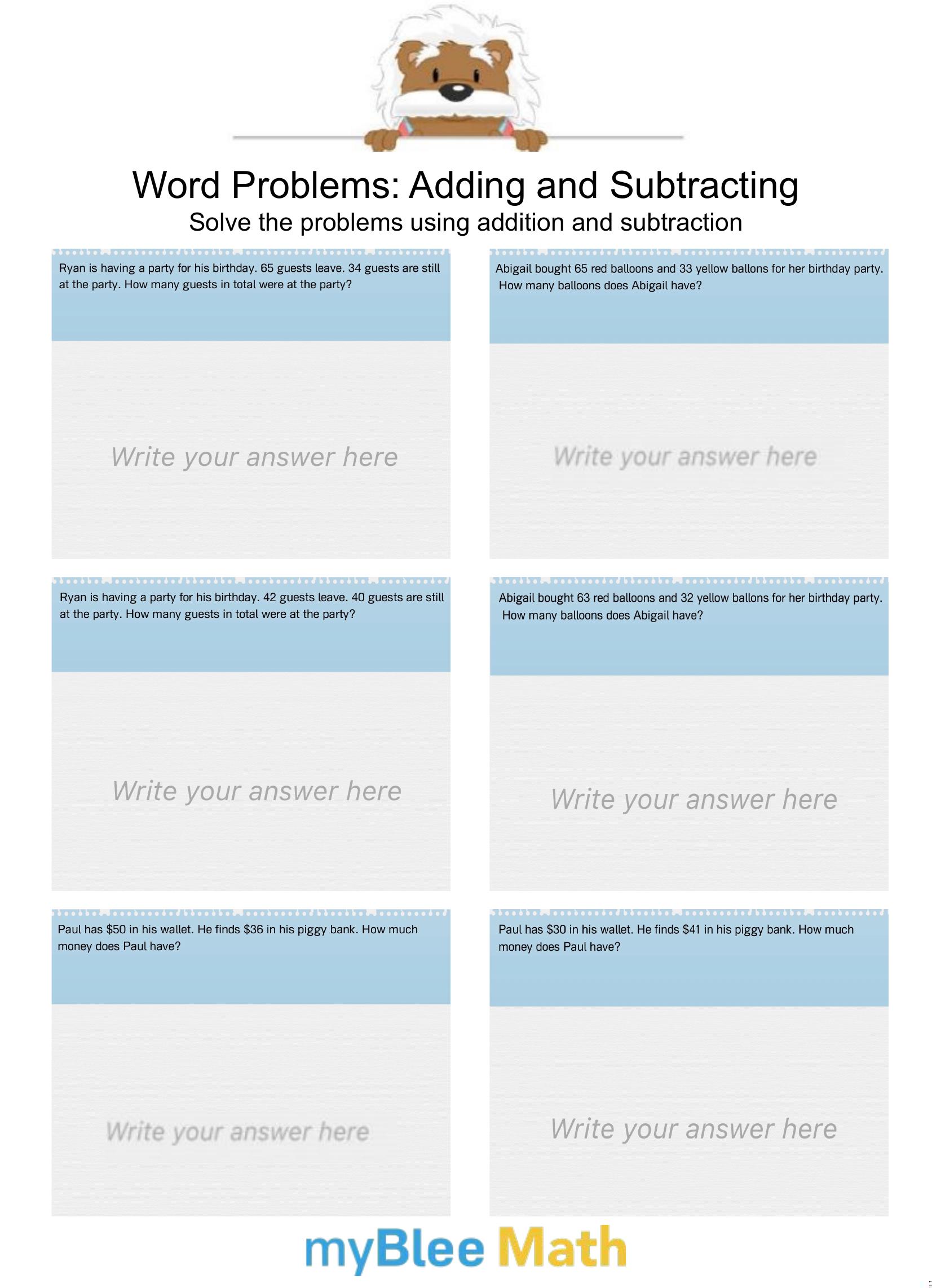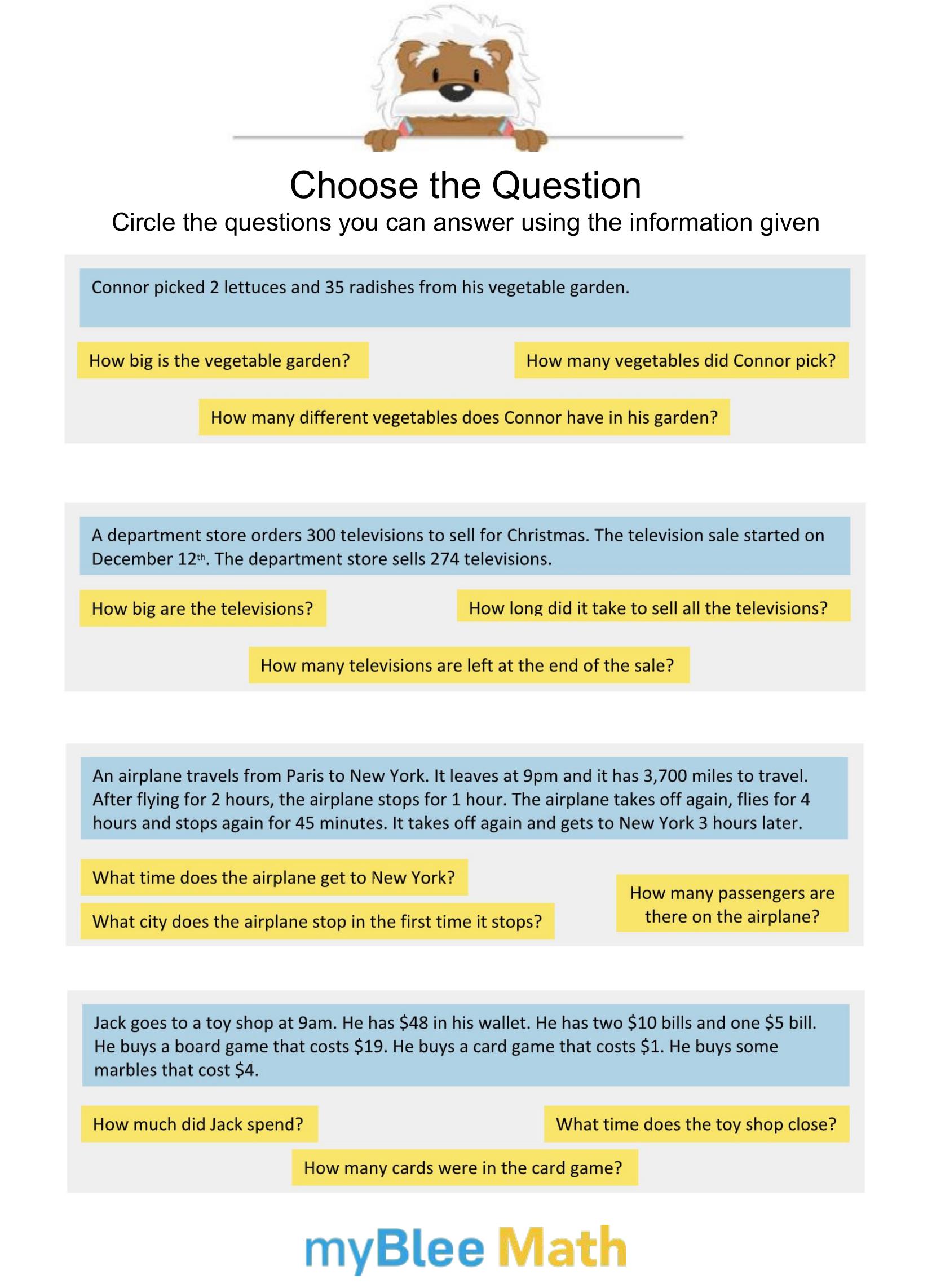 math problems require understanding a wording, identifying useful information and choosing the correct operation. To support this progression, we offer problem worksheets adapted to all grade levels.