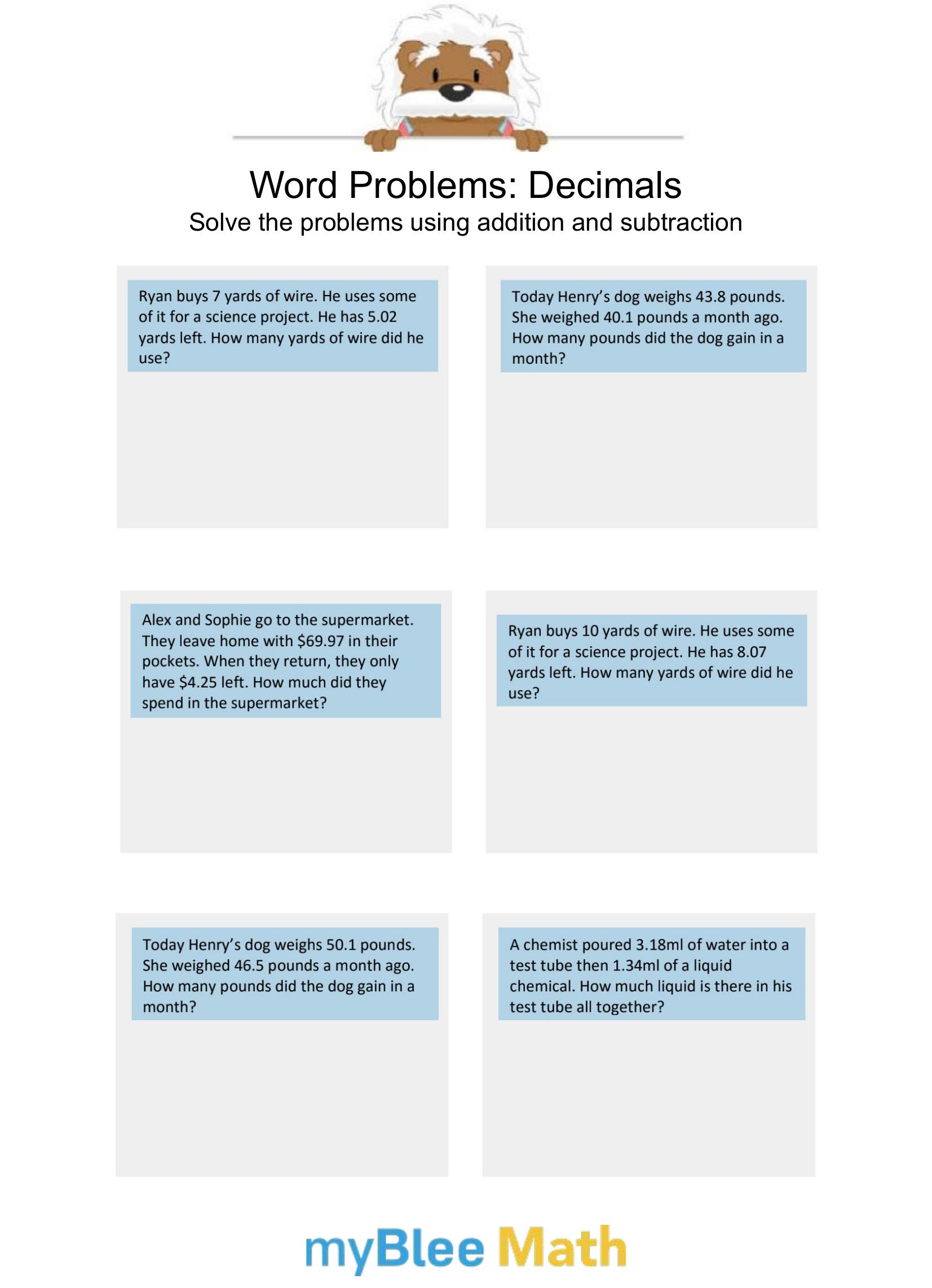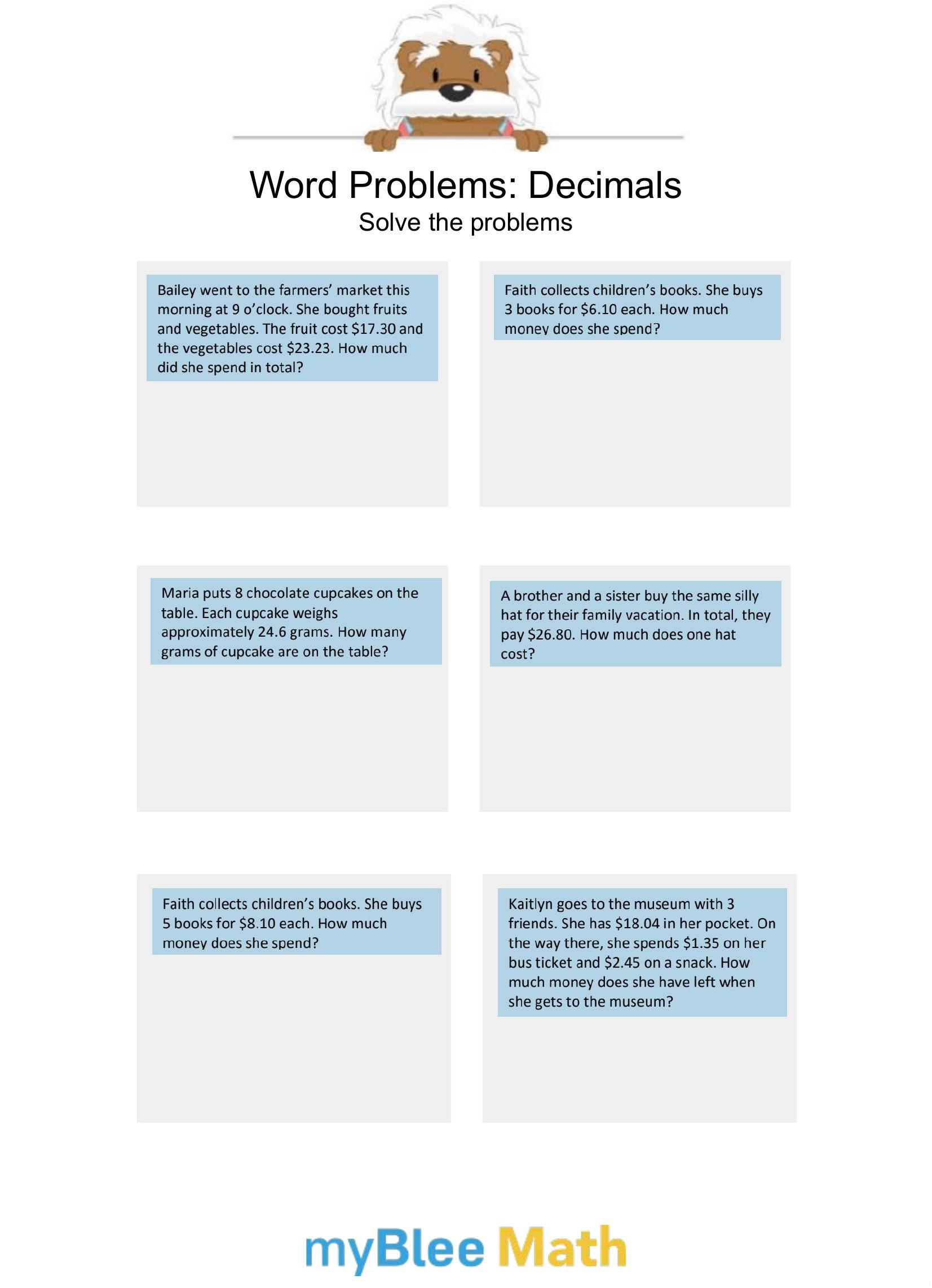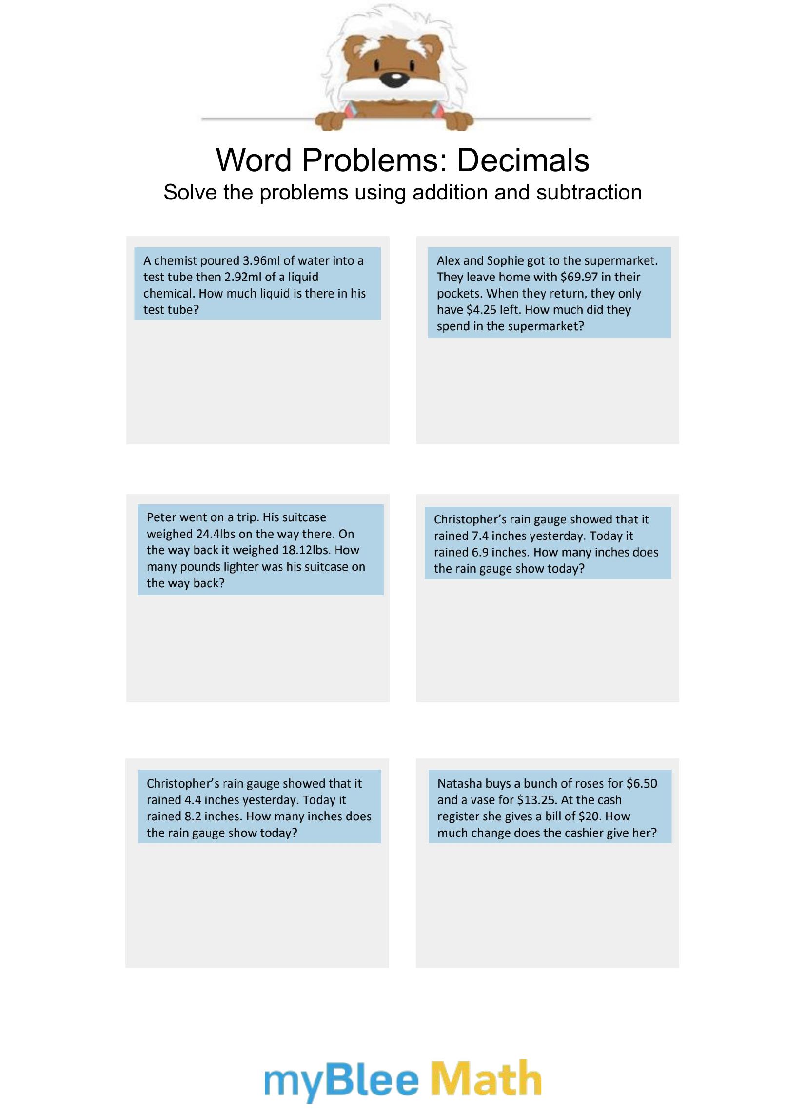Problems with decimals train students to handle situations involving measurements, prices, distances or durations. The following exercises help set out calculations correctly, compare decimal values and choose the right operation. They strengthen precision and ease in working with numbers with decimals.
