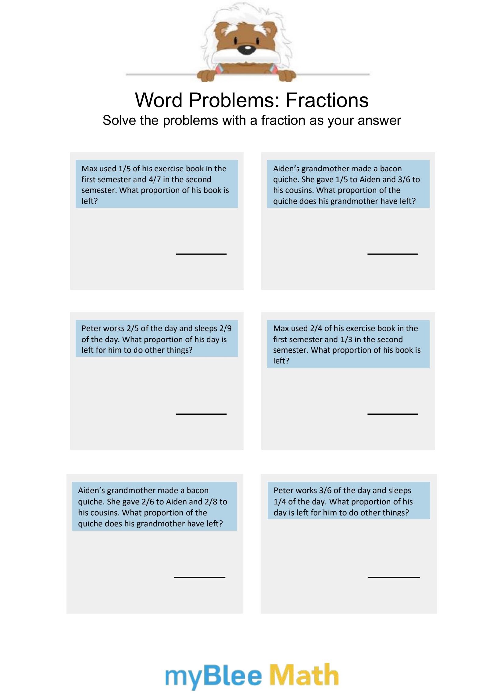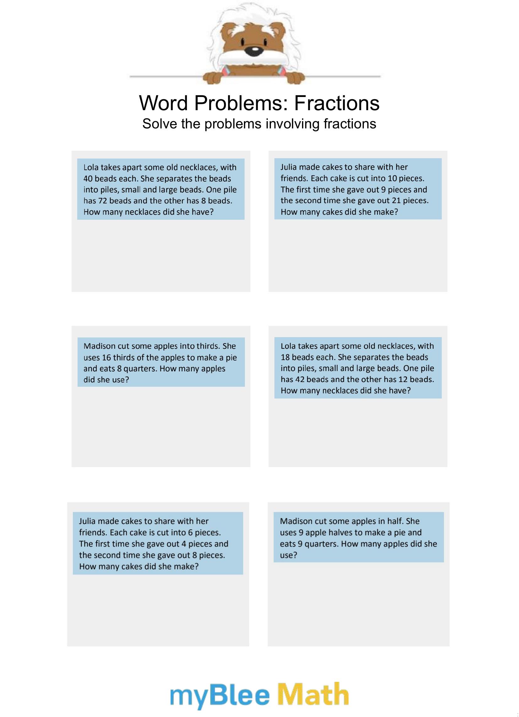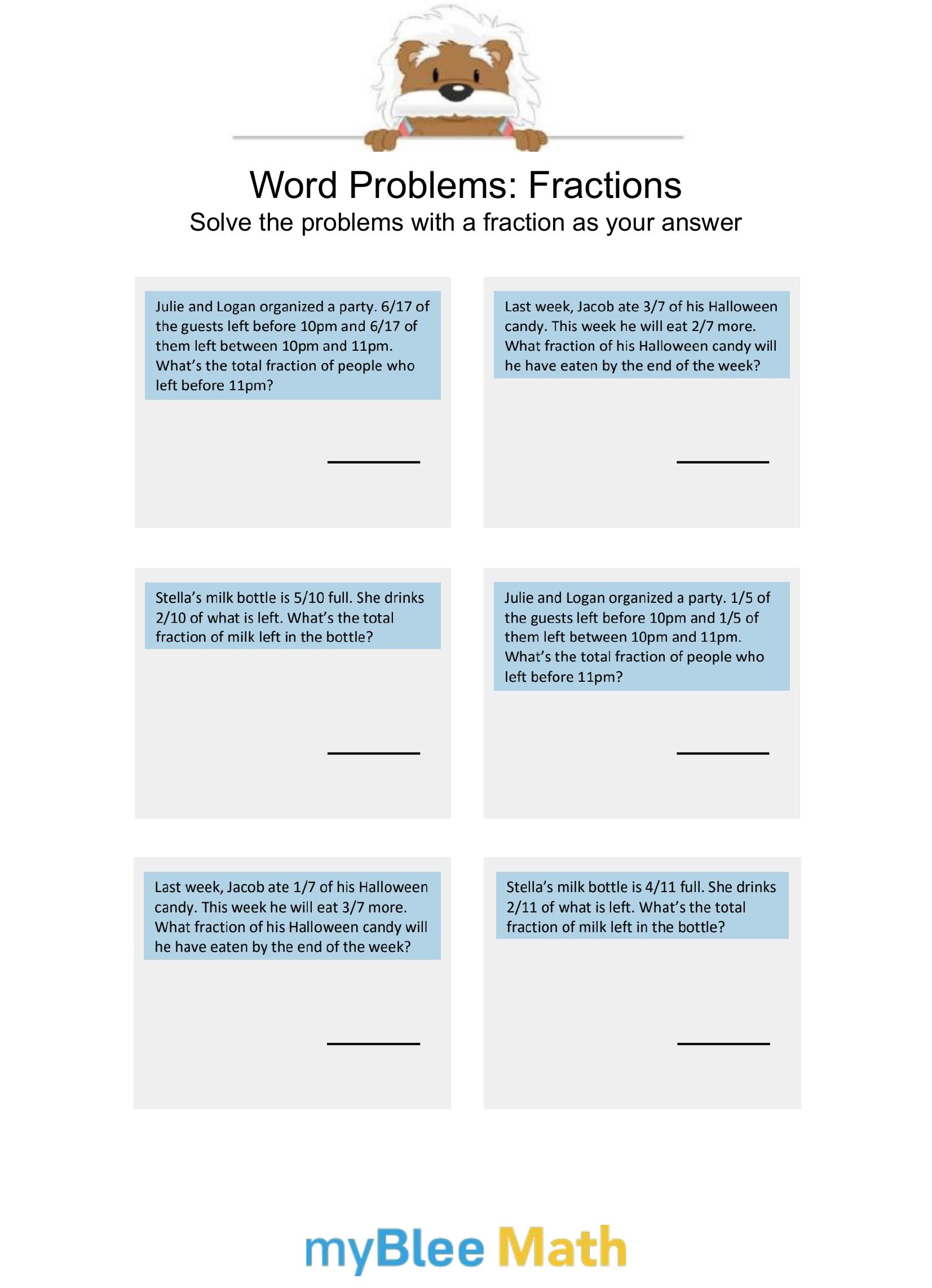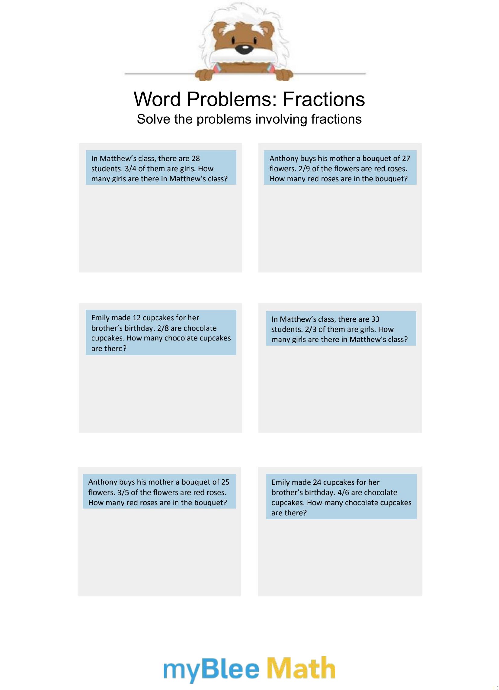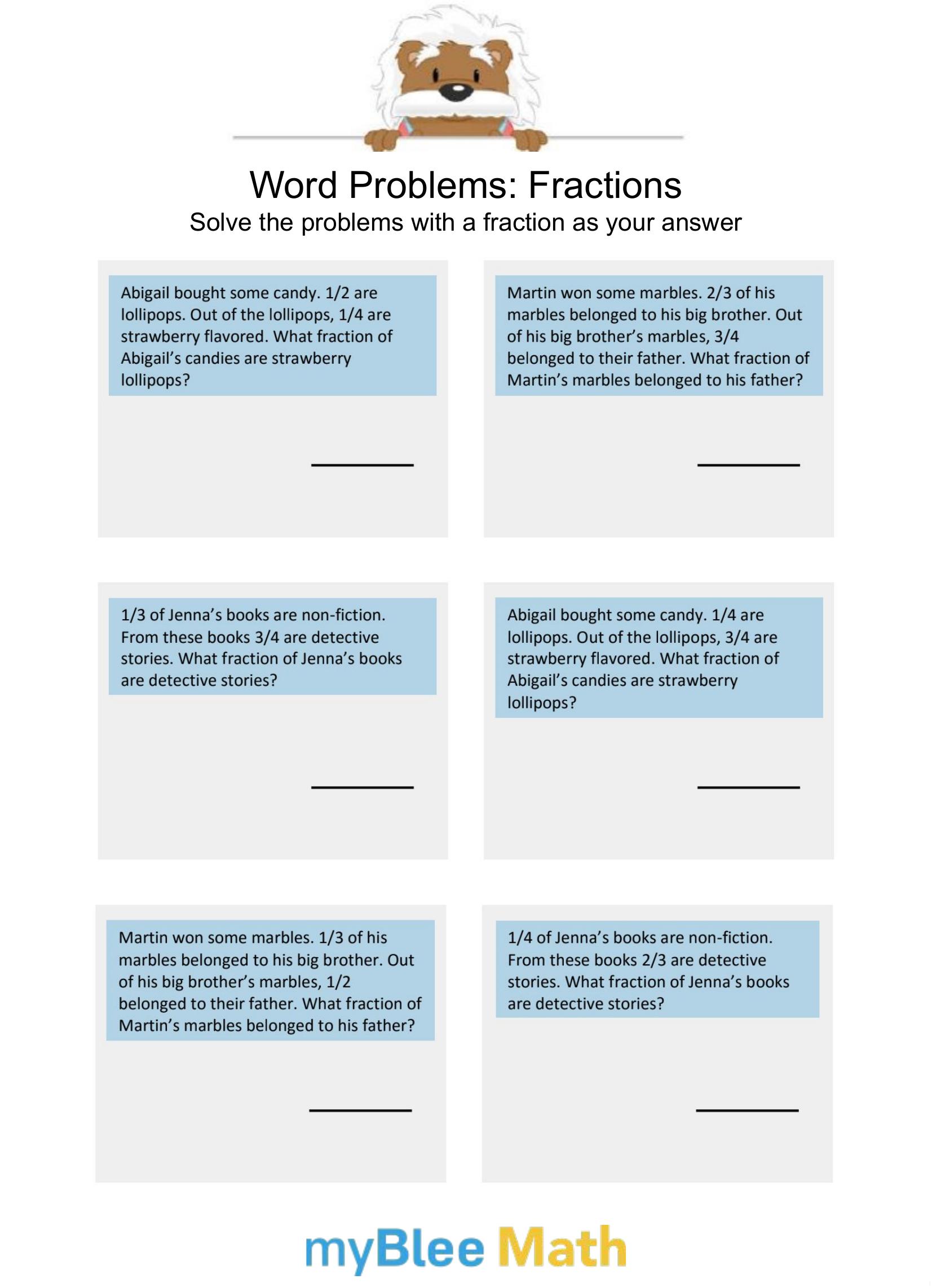 Problems with fractions teach how to handle parts of units and understand situations where quantities are not whole. The following exercises will help compare, add or share fractions in real contexts. They help visualize relationships between parts and develop strong mastery of these numbers.