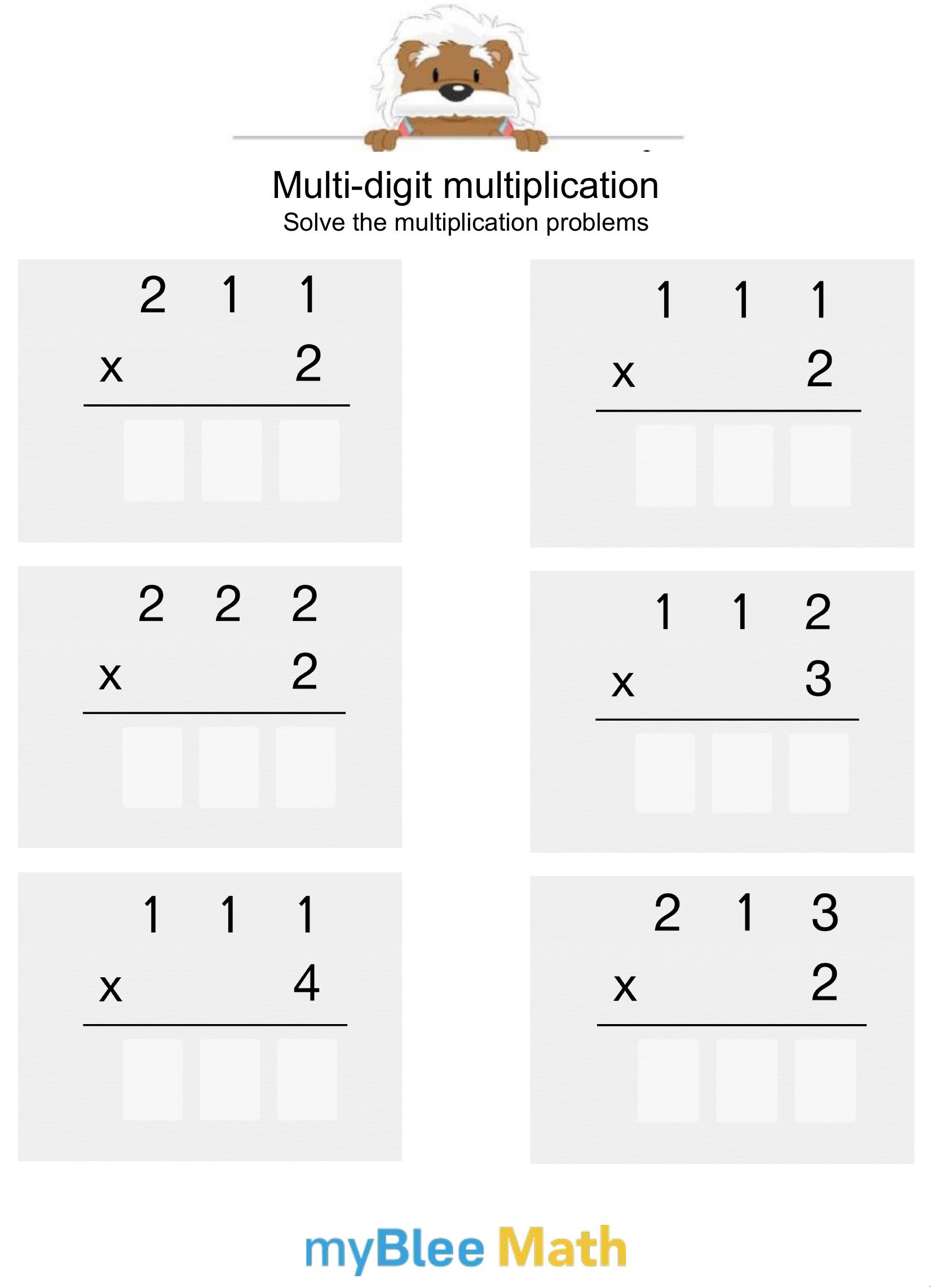 These exercises explain how to perform multiplication in columns, step by step. You learn how to multiply the units, manage carrying, then work with tens and hundreds.