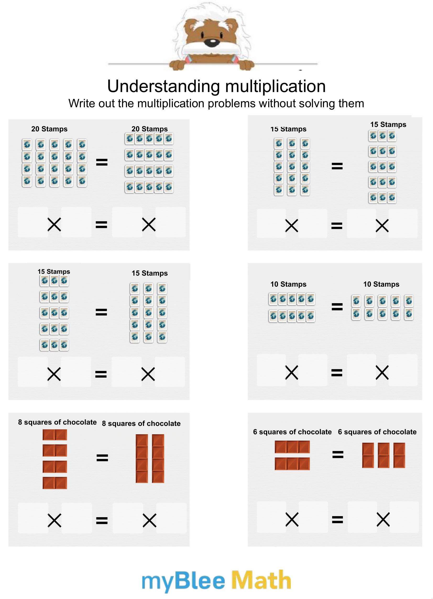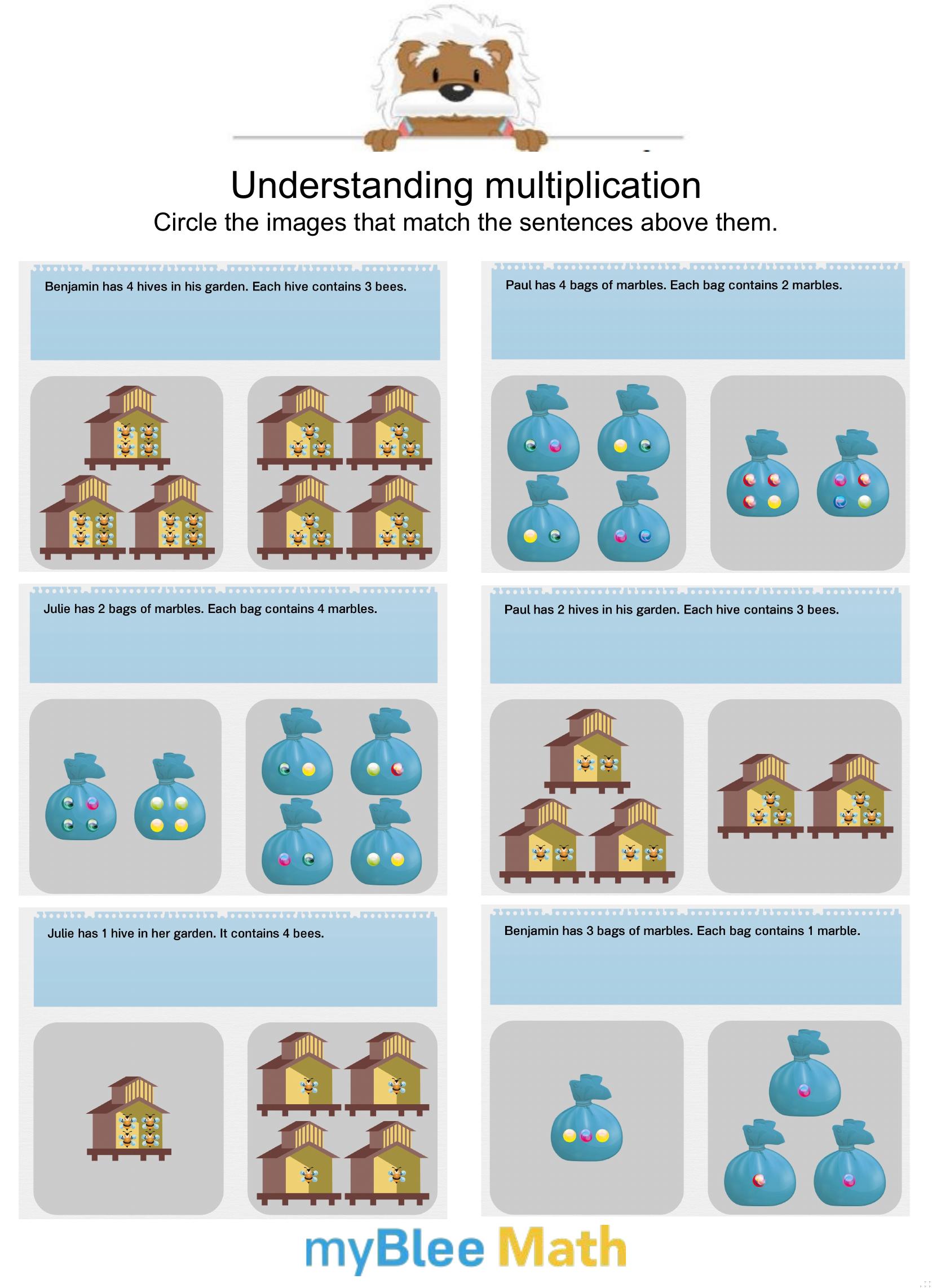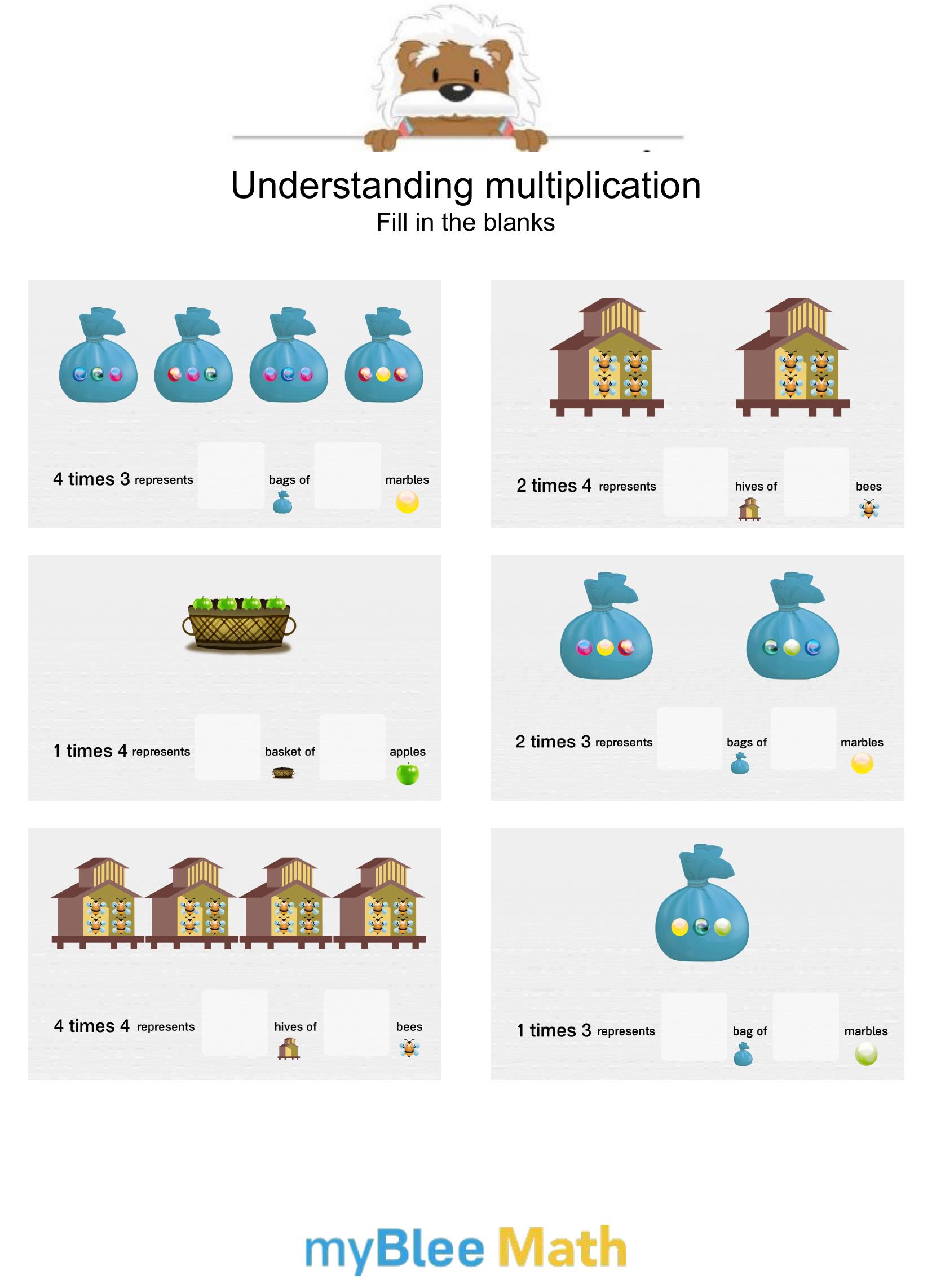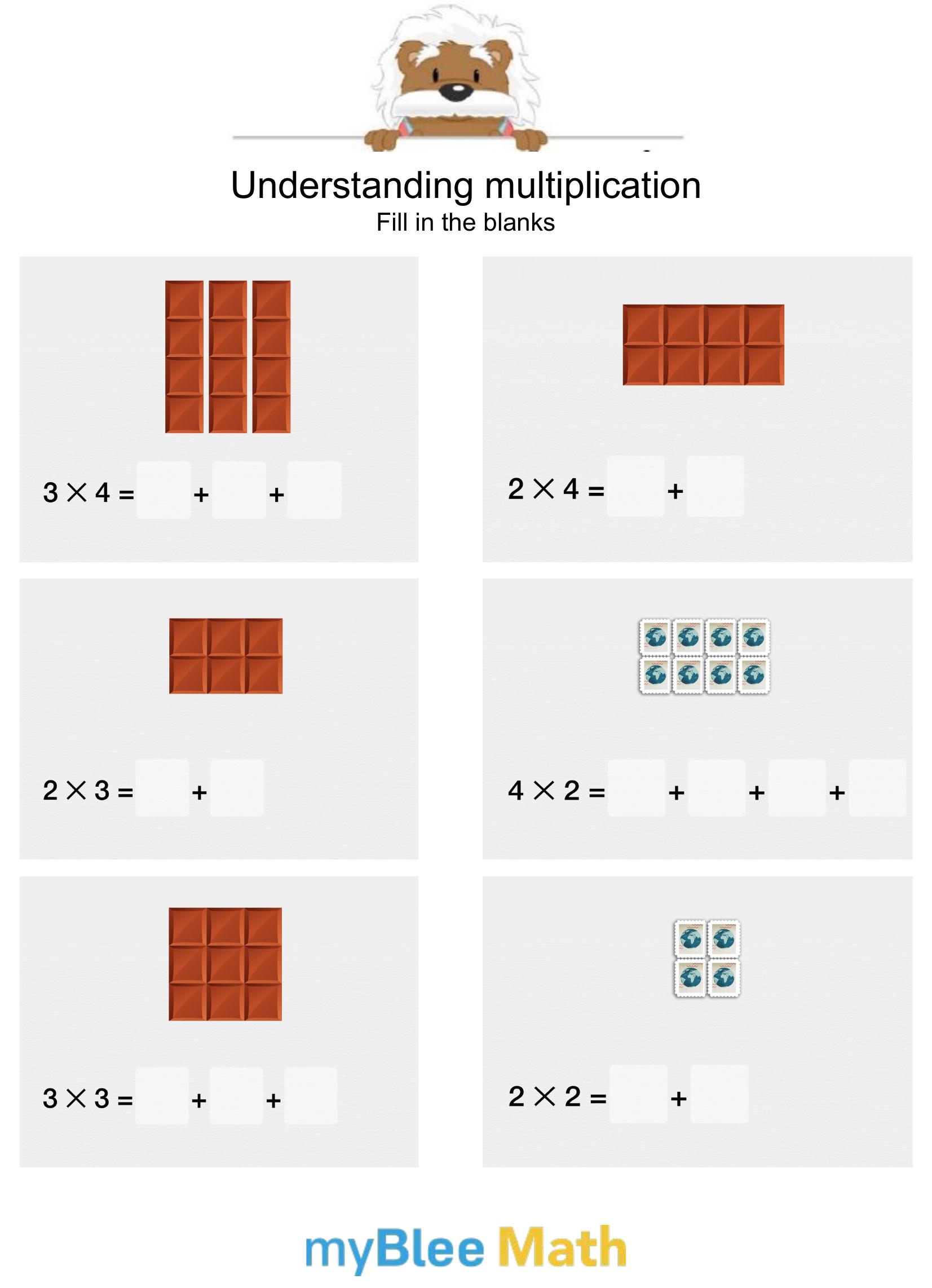 The first exercises help understand the very idea of multiplication: repeating the same quantity, forming groups and representing the same number multiple times.