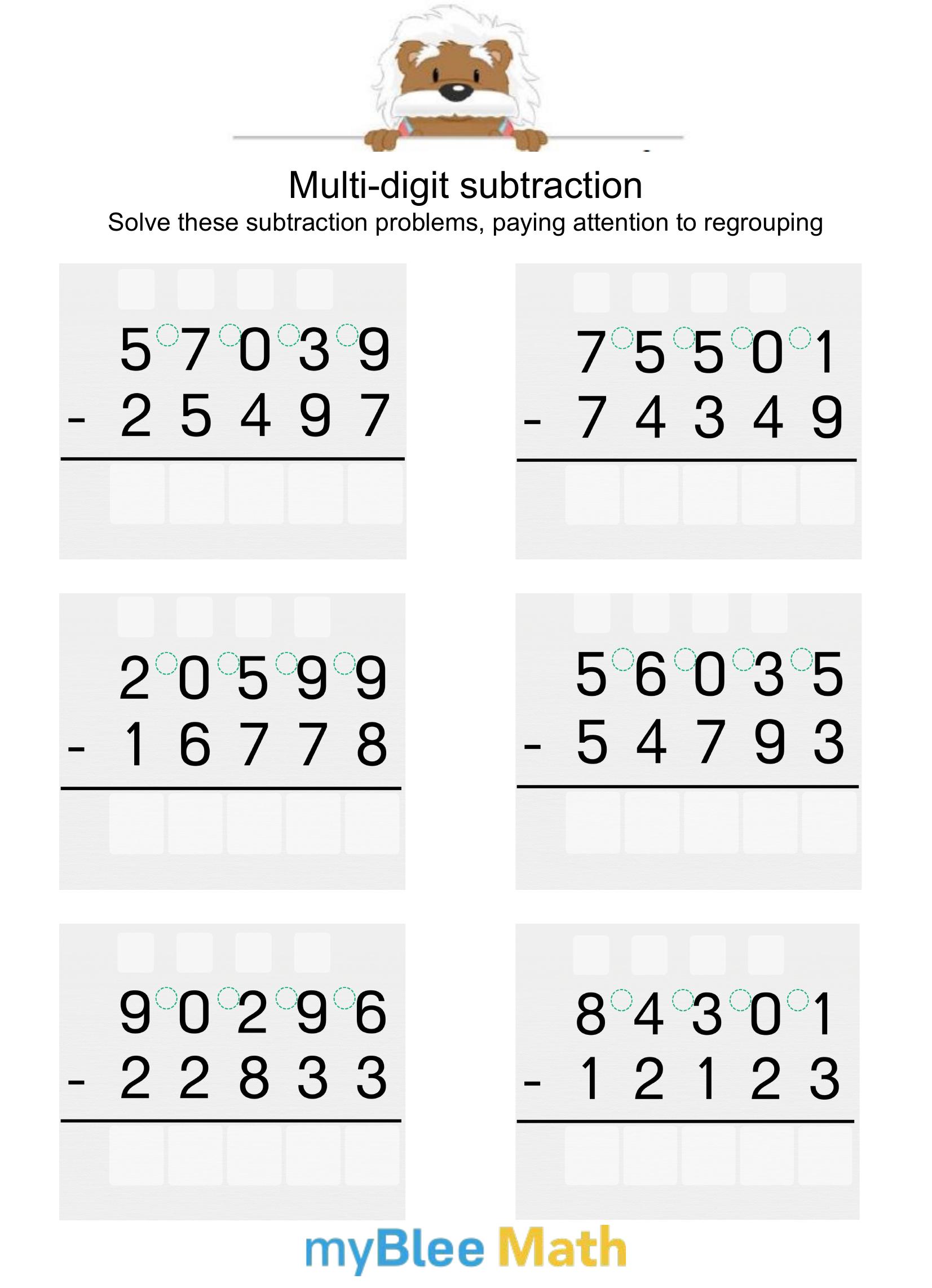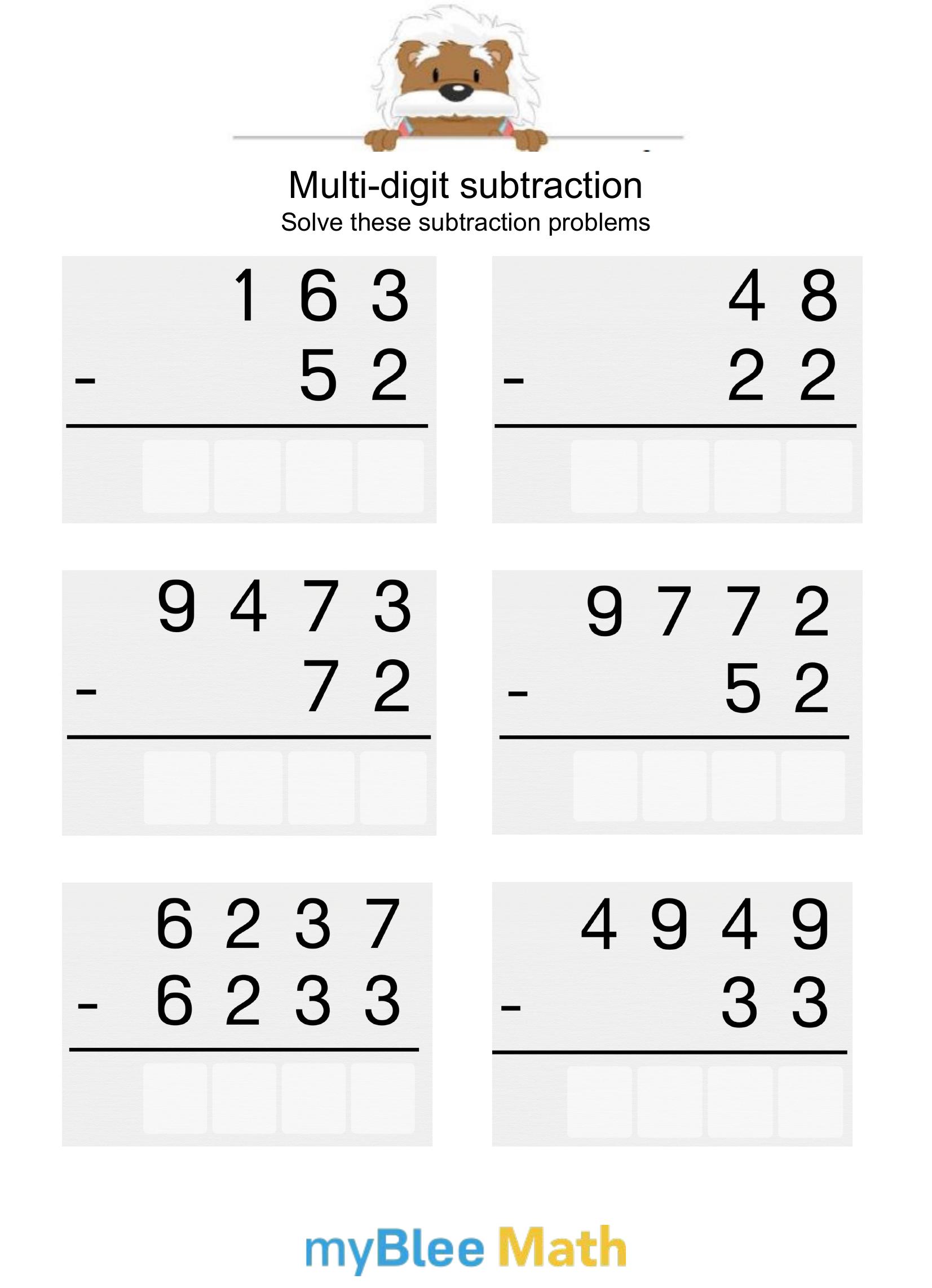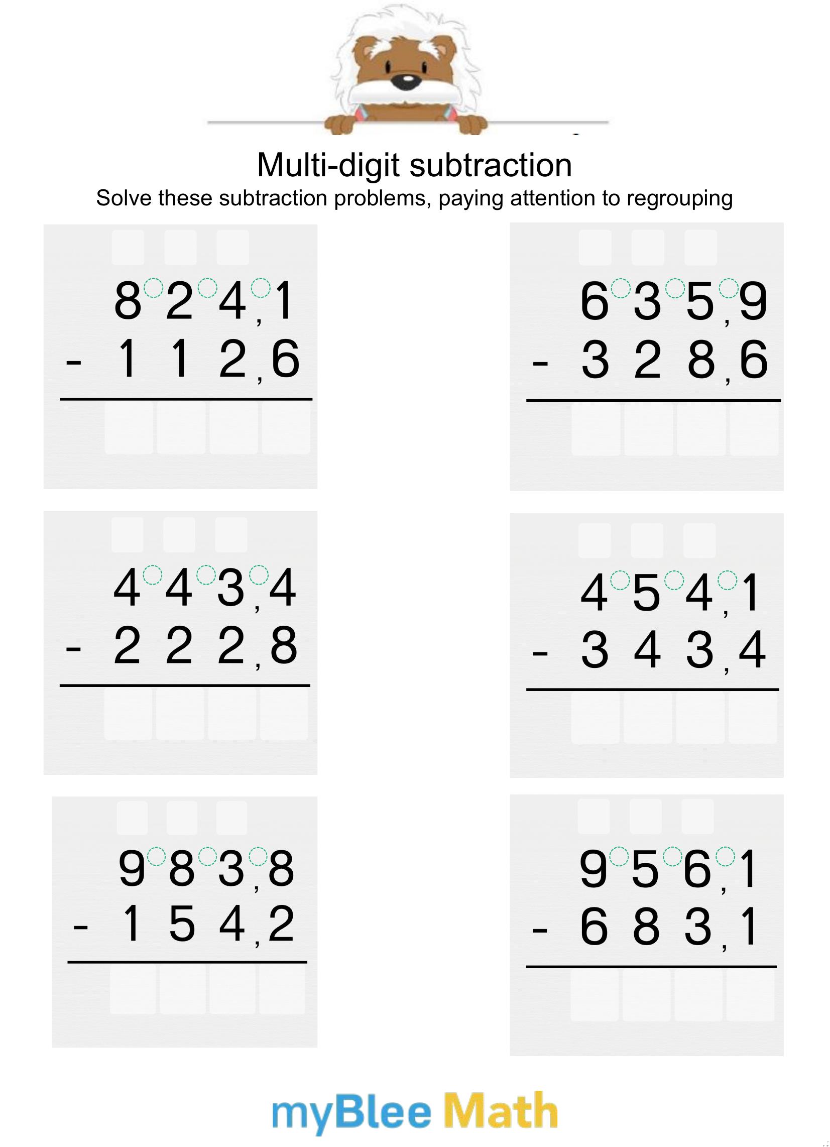 To go further, offer multi-digit subtractions. They are perfect for math exercises for 4th grade or 5th grade students. They strengthen methodology, endurance, and precision. Children often love these exercises because they feel they’re accomplishing something “bigger.”