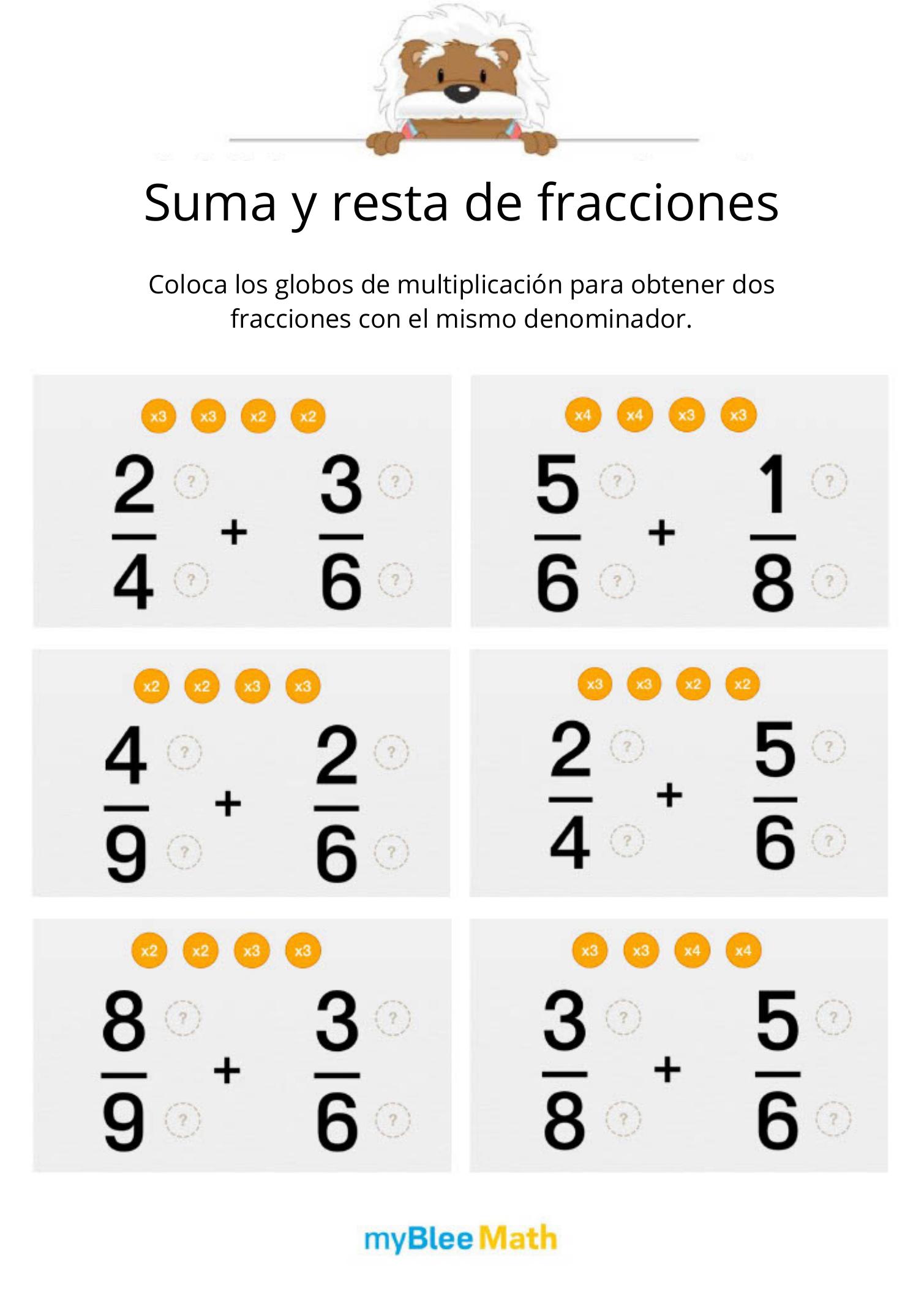 Los ejercicios de suma de fracciones enseñan a juntar partes para formar una cantidad mayor. Su hijo descubre cómo encontrar un denominador común y sumar fracciones de manera sencilla, a su ritmo.