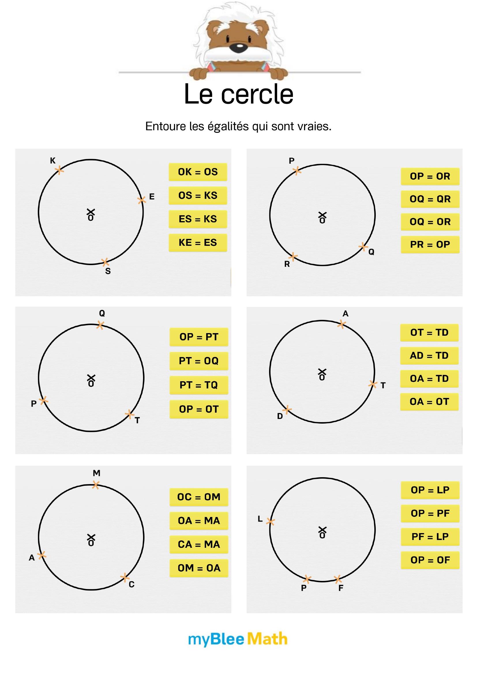 Le but de l'exercice est de trouver, parmi quatre propositions, quelles sont les égalités relative à un cercle qui sont vraies.