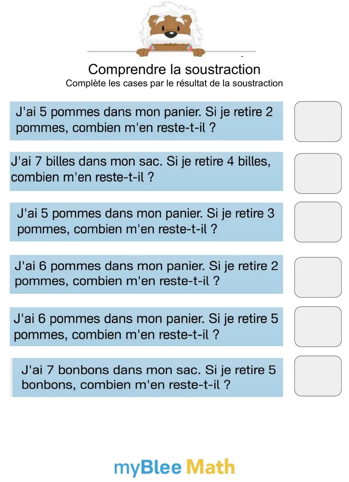 Le but de l'exercice est de résoudre des problèmes simples de soustraction.