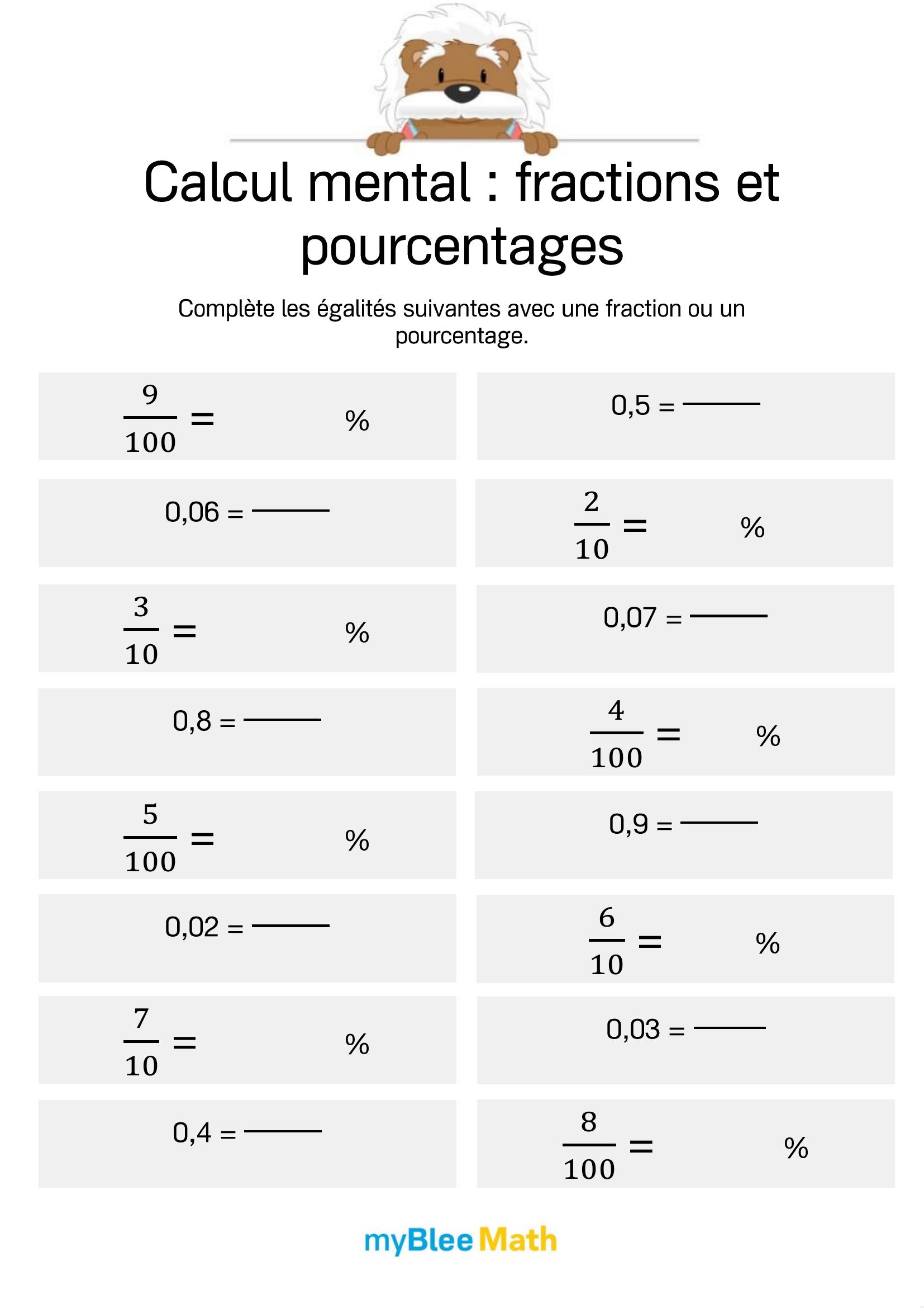 Le but de l'exercice est de compléter les égalités avec des pourcentages, des fractions ou des nombres décimaux. Ici, les calculs concernent les dixièmes et les centièmes.