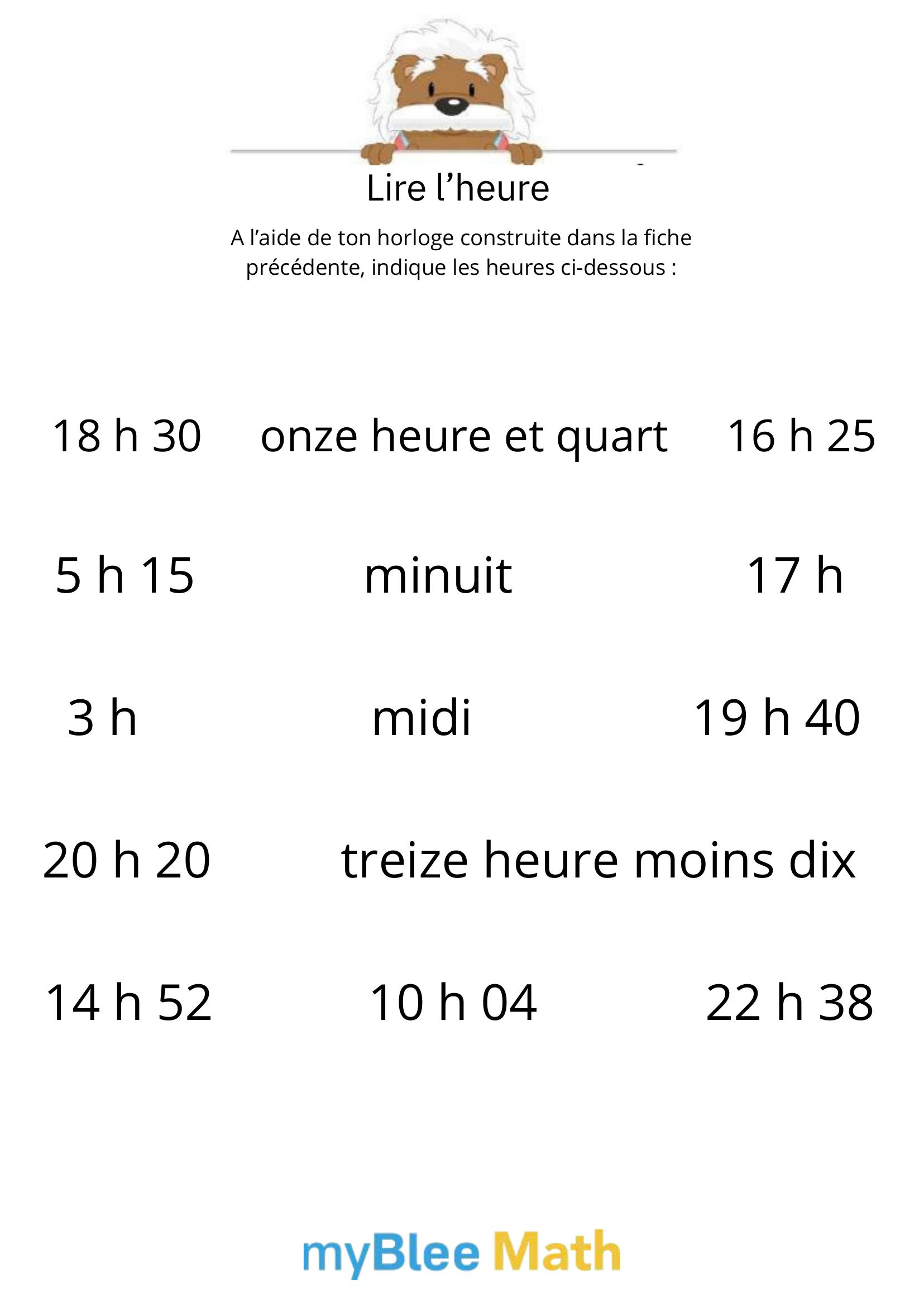 Le but de l'exercice est d'indiquer les bonnes heures en plaçant la petite aiguille et grande aiguille sur l’horloge précédemment construite.