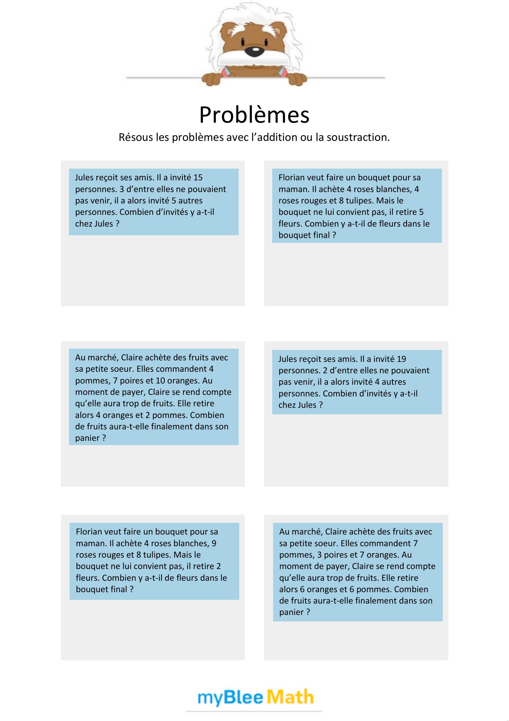 Les problèmes avec additions et soustractions sont parfaits pour comprendre comment manipuler des quantités, comparer des valeurs ou calculer des écarts. Les exercices à venir aideront à identifier rapidement s’il faut ajouter ou retirer une information.