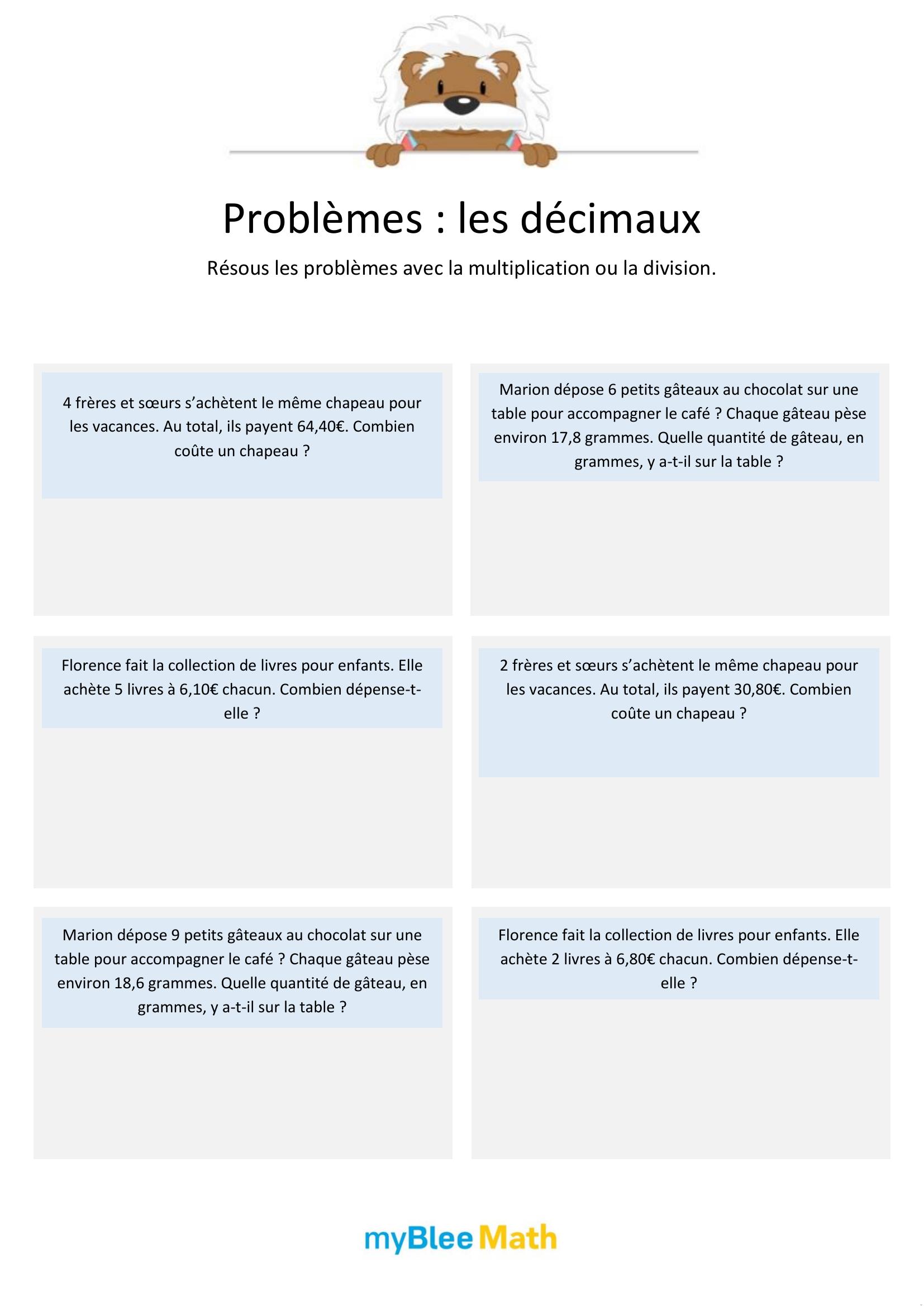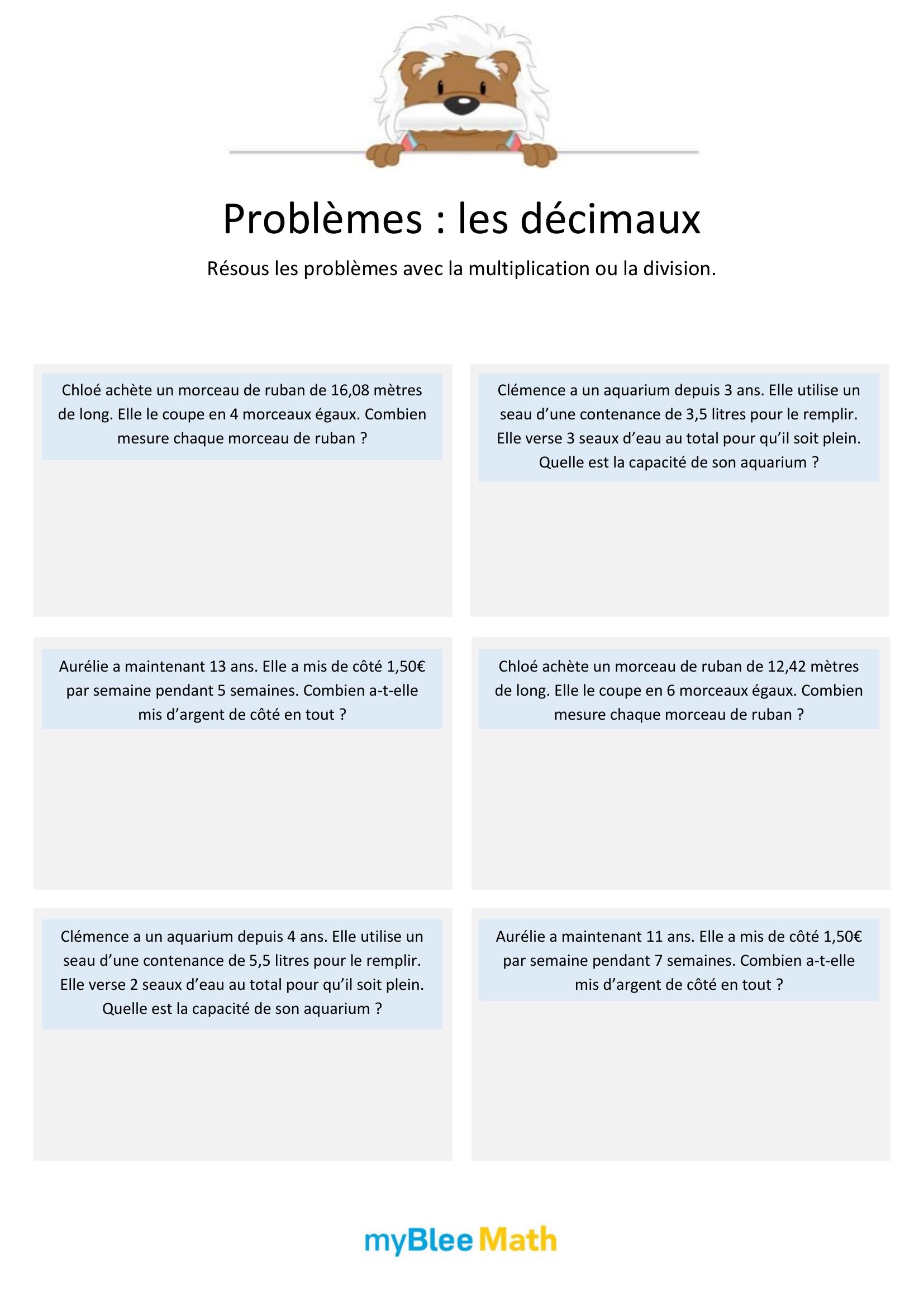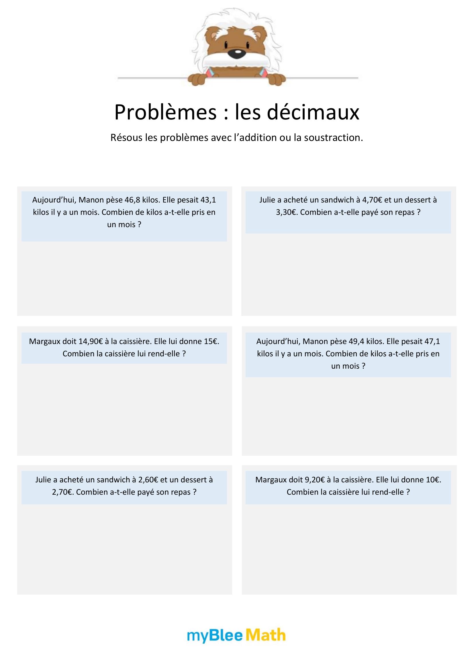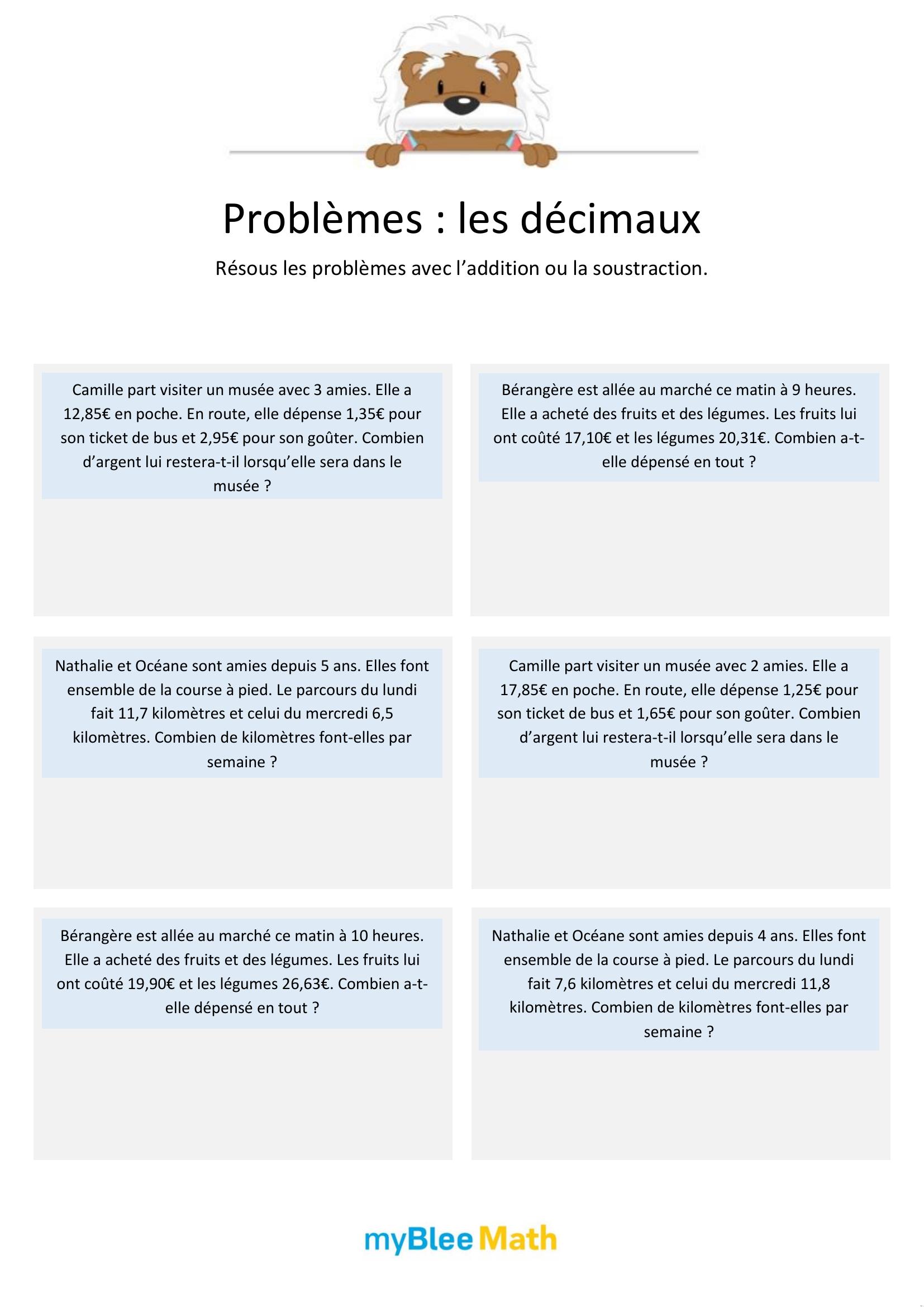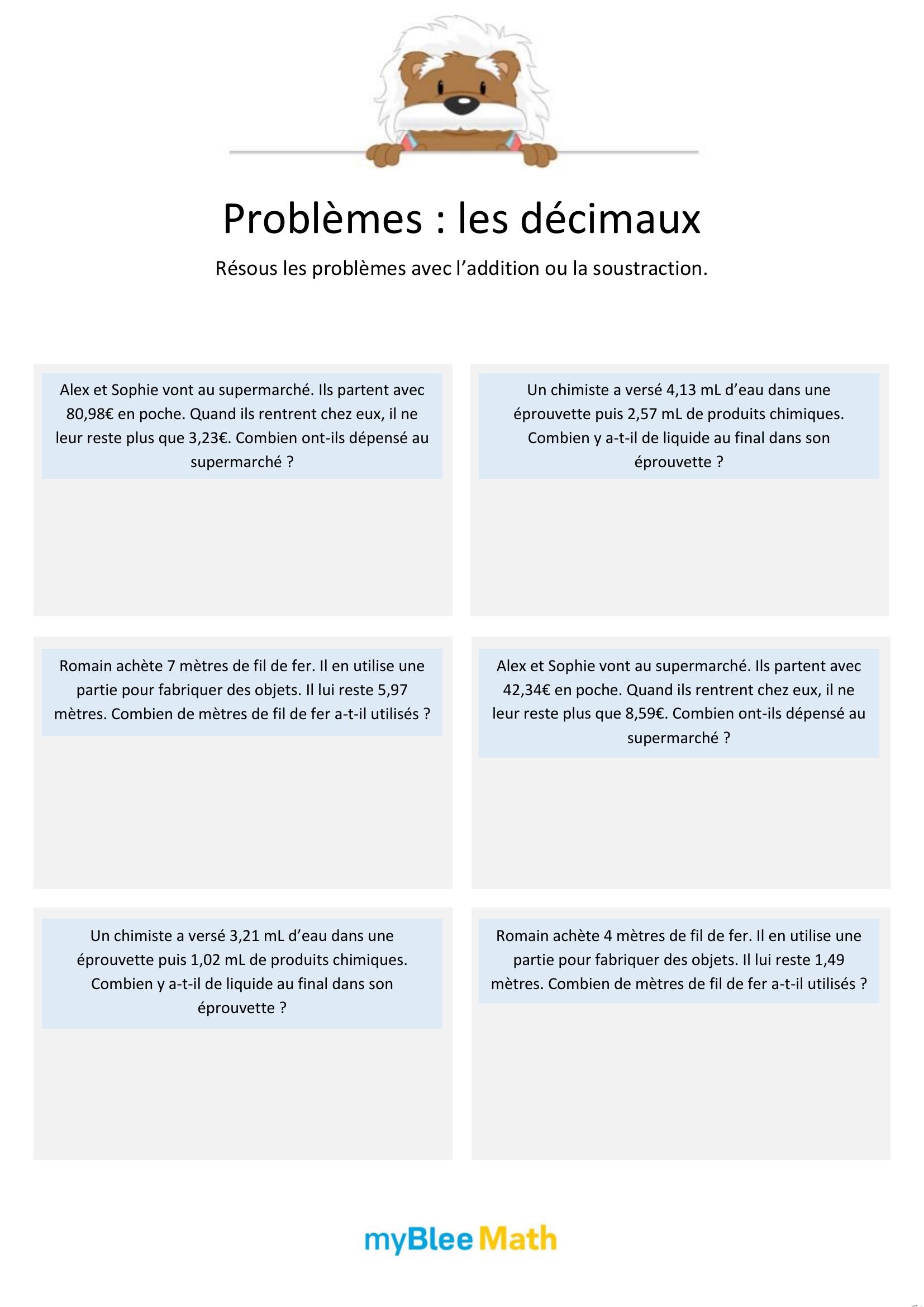 Les problèmes avec des décimaux permettent de travailler des situations impliquant des mesures, des prix, des distances ou des durées. Les exercices suivants aideront à poser correctement les calculs, à comparer des valeurs décimales et à choisir la bonne opération. Ils renforcent la précision et l’aisance dans la manipulation des nombres avec virgule.