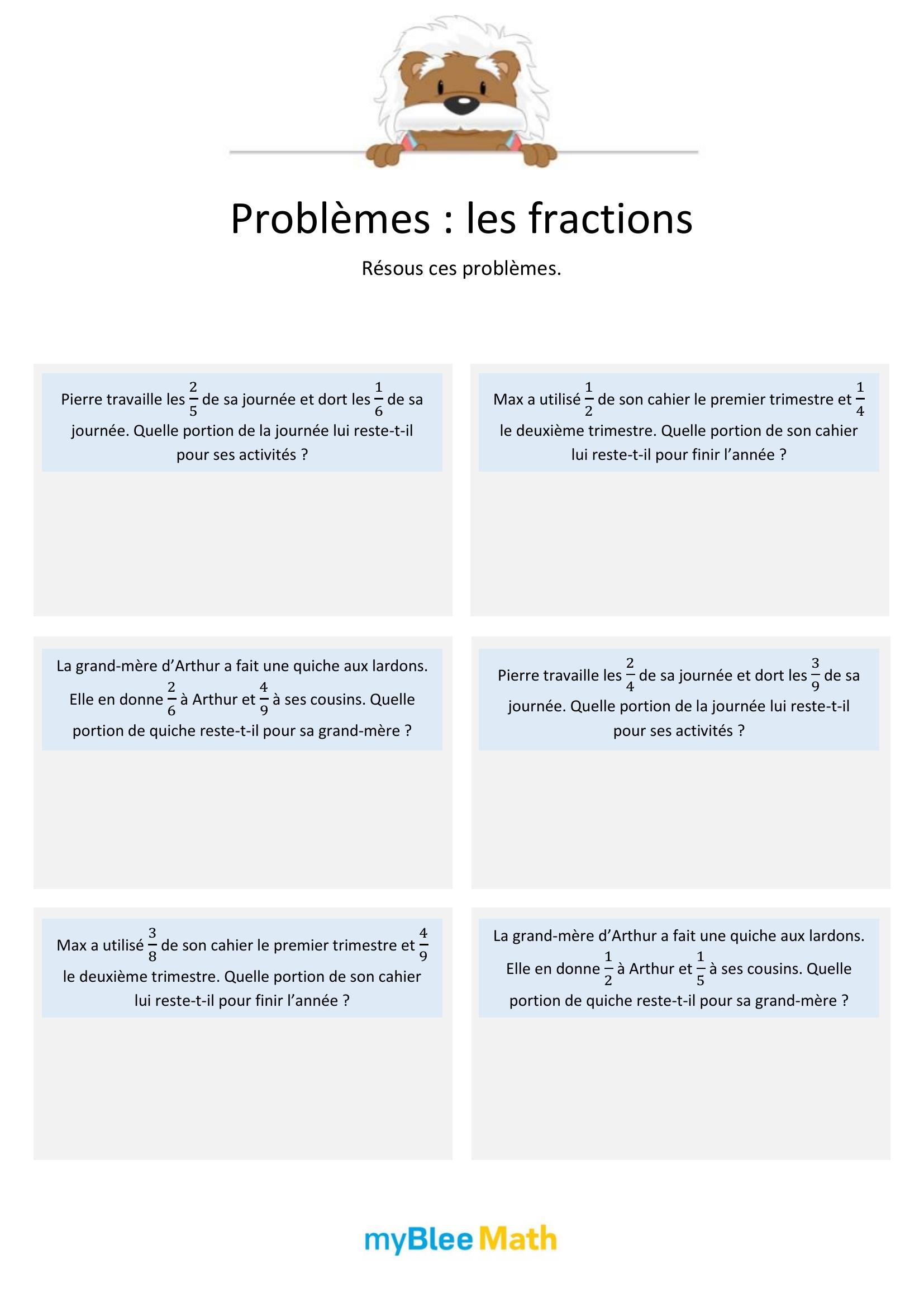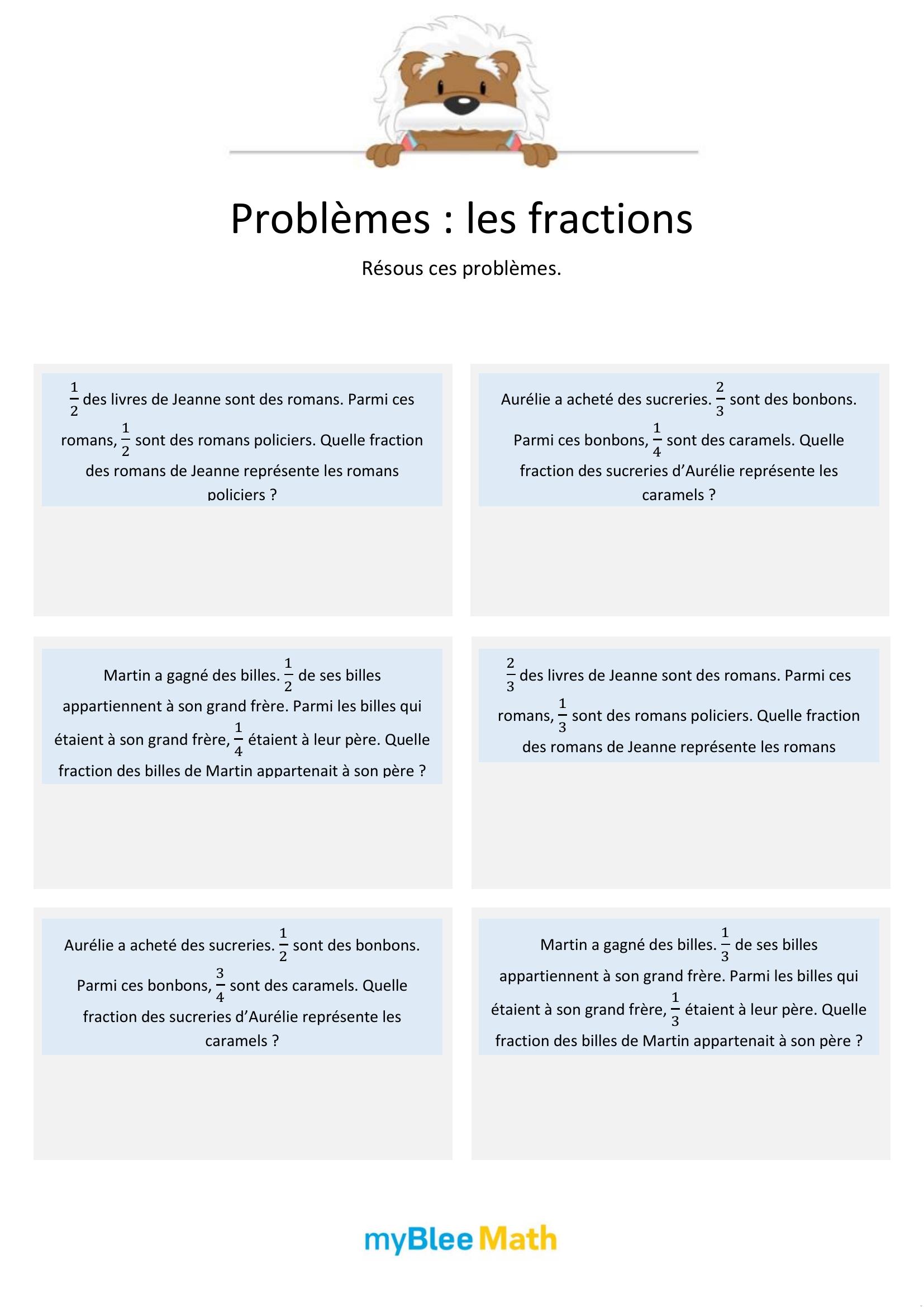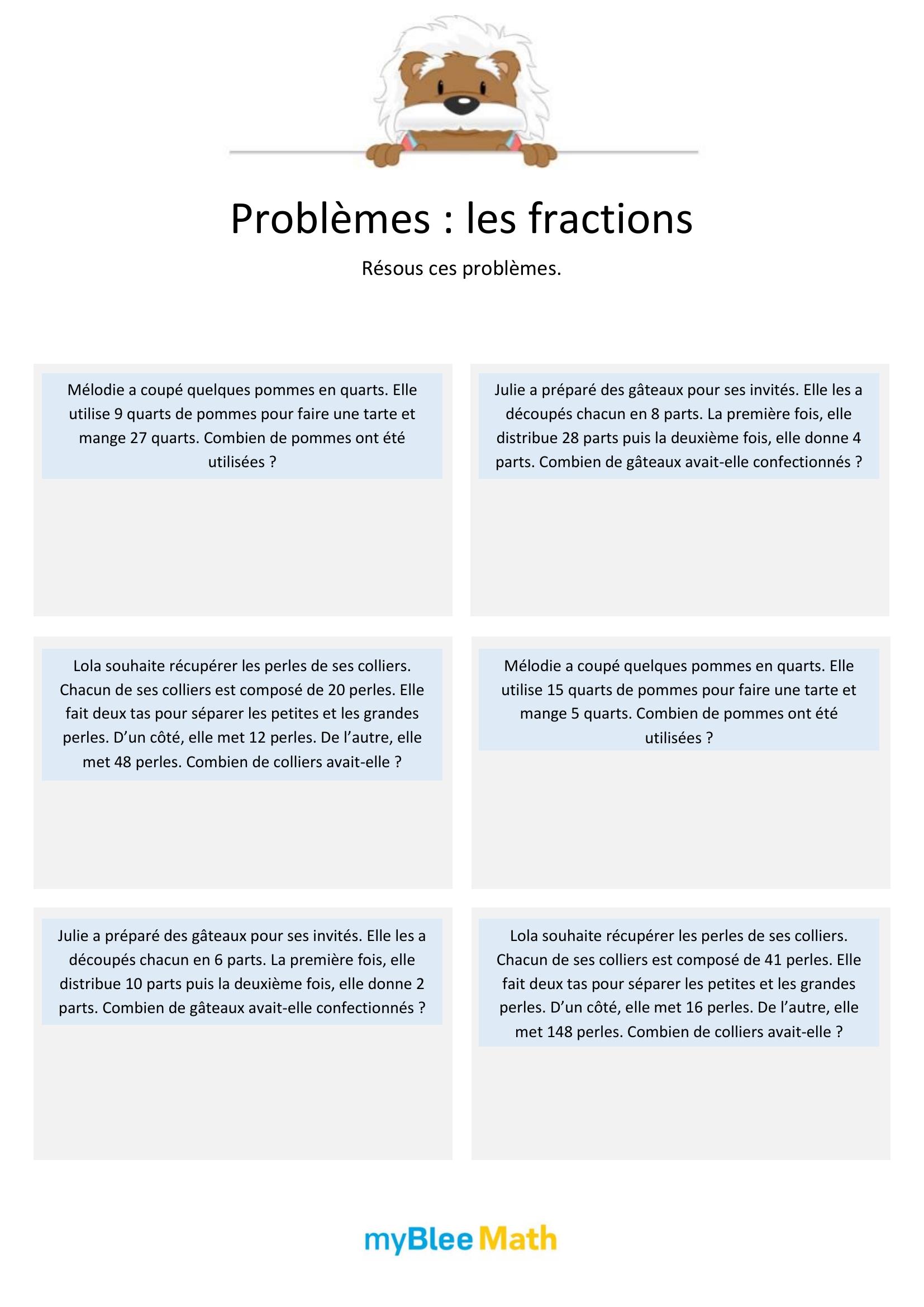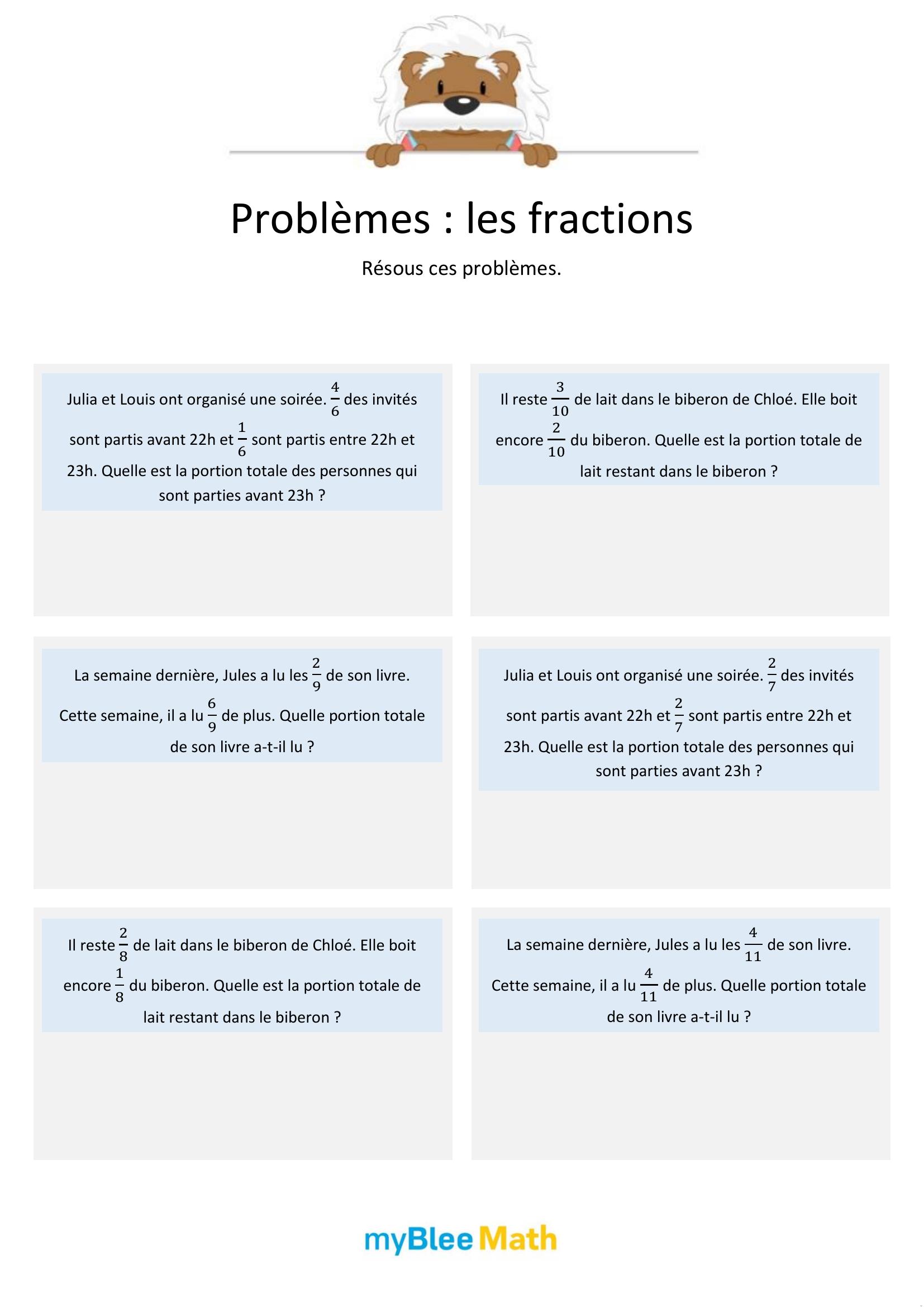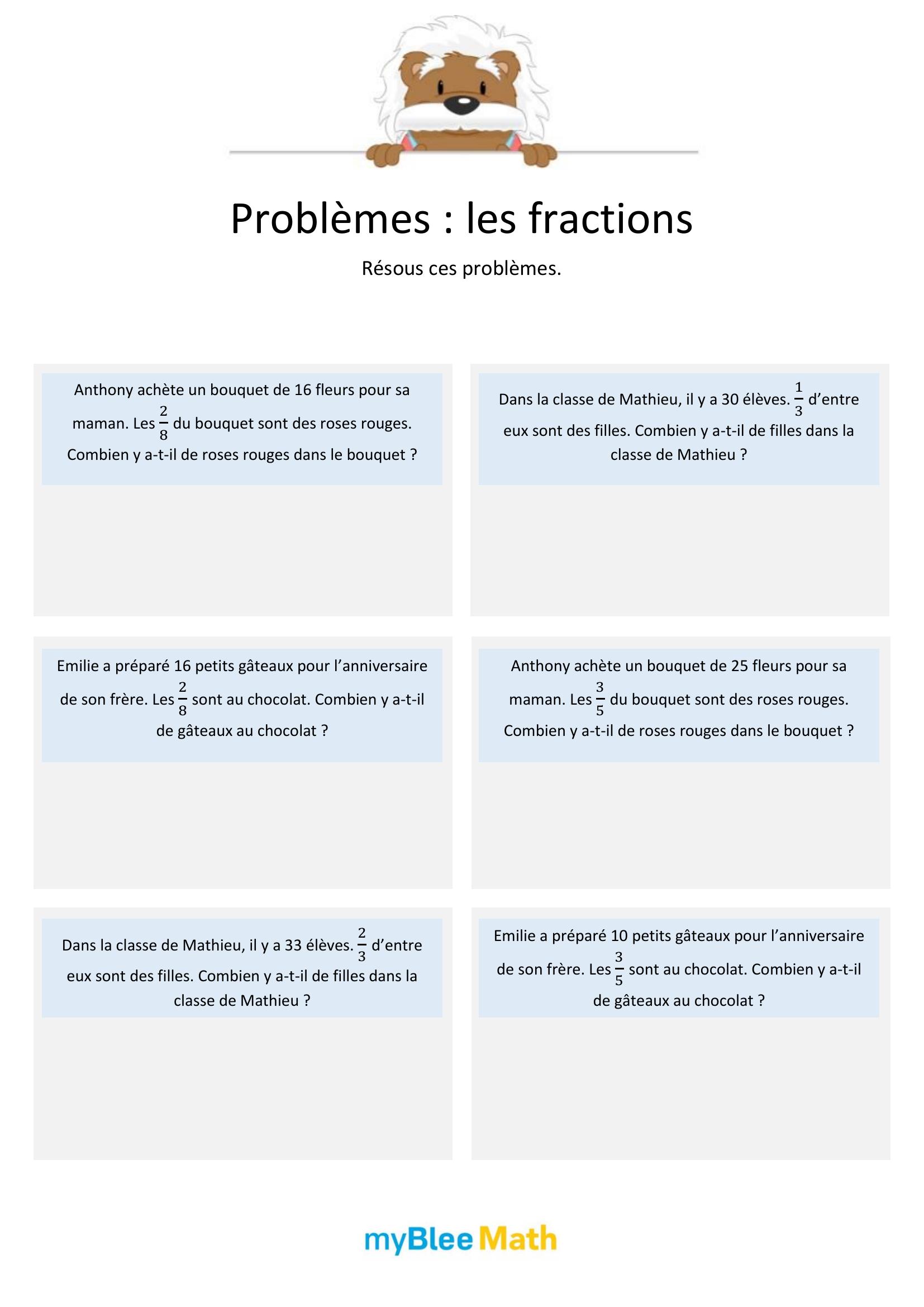 Les problèmes avec des fractions apprennent à manipuler des parts d’unités et à comprendre des situations où les quantités ne sont pas entières. Les exercices à venir permettront de comparer, additionner ou partager des fractions dans des contextes concrets. Ils aident à visualiser les relations entre les parts et à développer une vraie maîtrise de ces nombres.