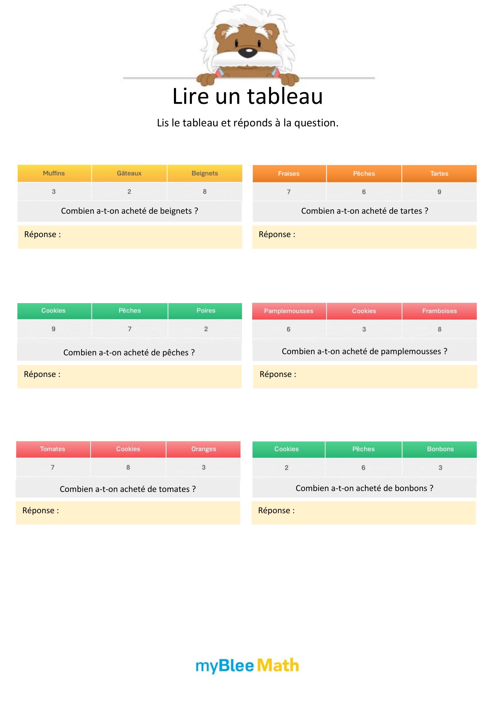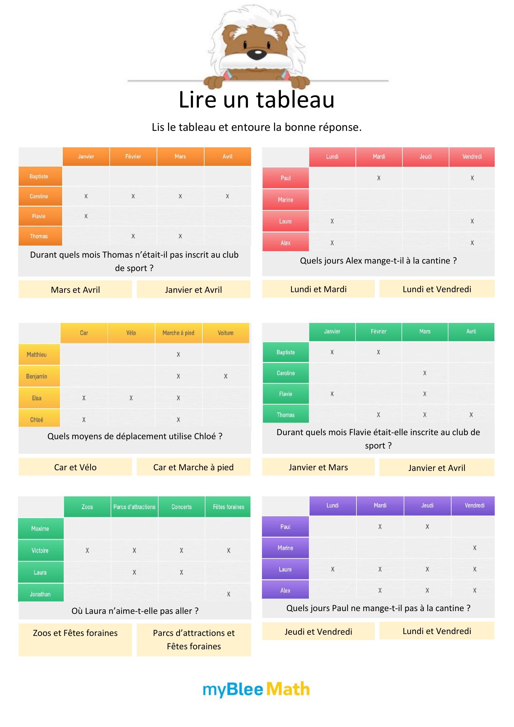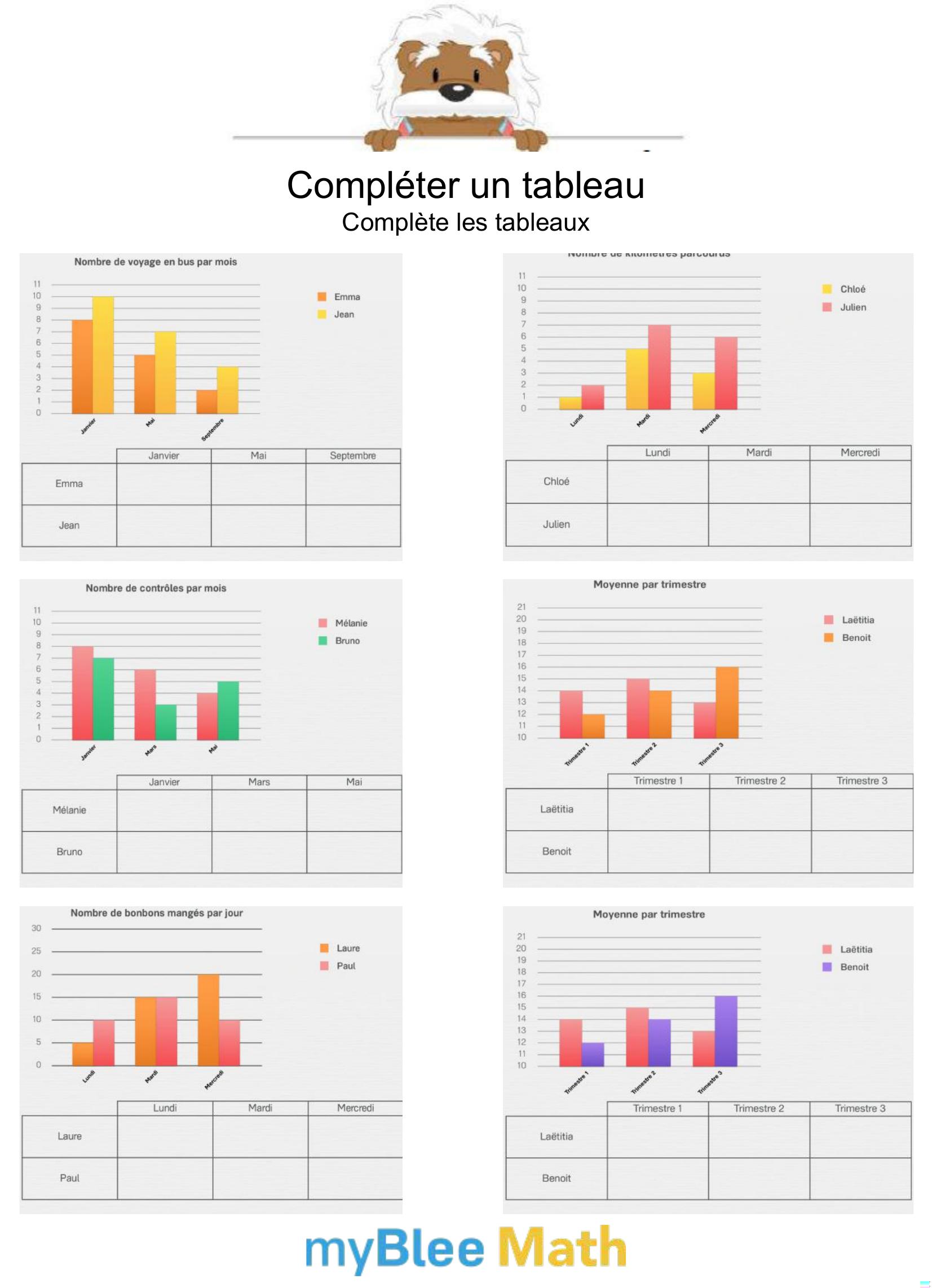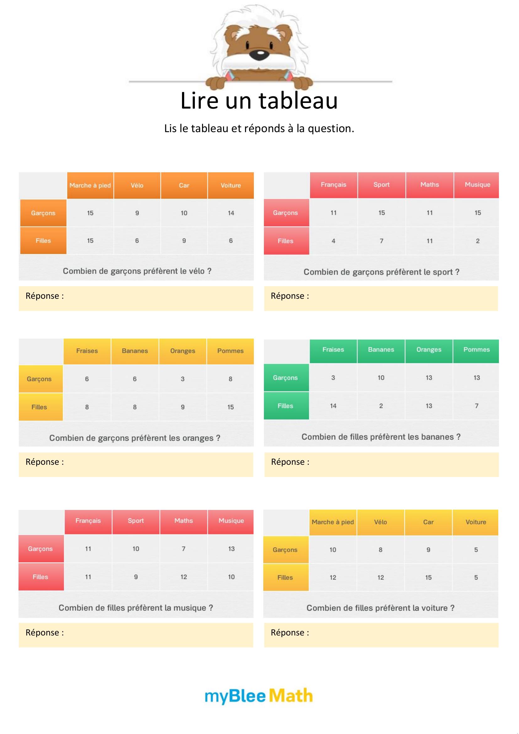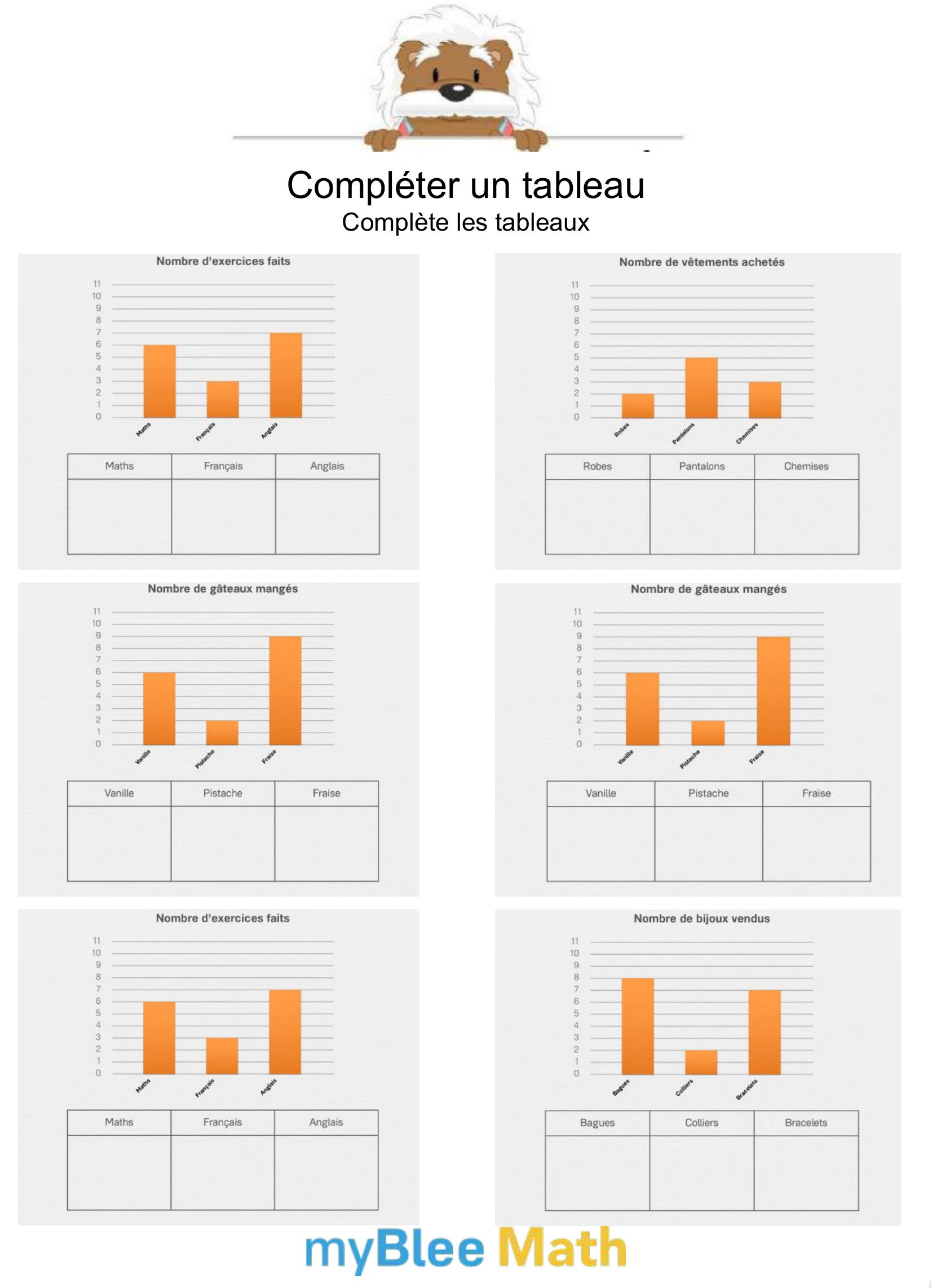 Apprenez à lire et interpréter des tableaux et graphiques avec nos exercices ludiques et progressifs. Des activités claires pour maîtriser ces outils dès le primaire avec myBlee Math.