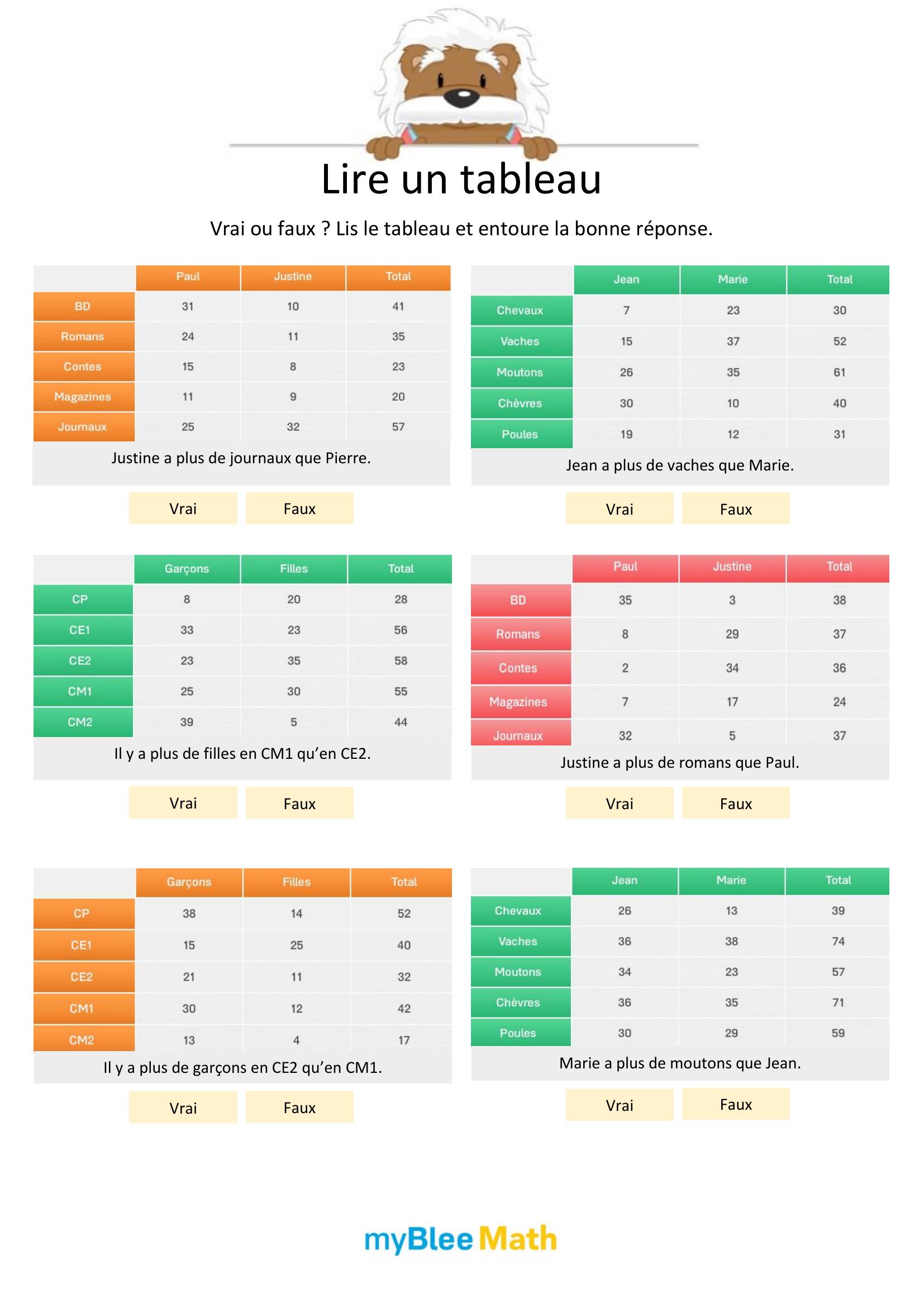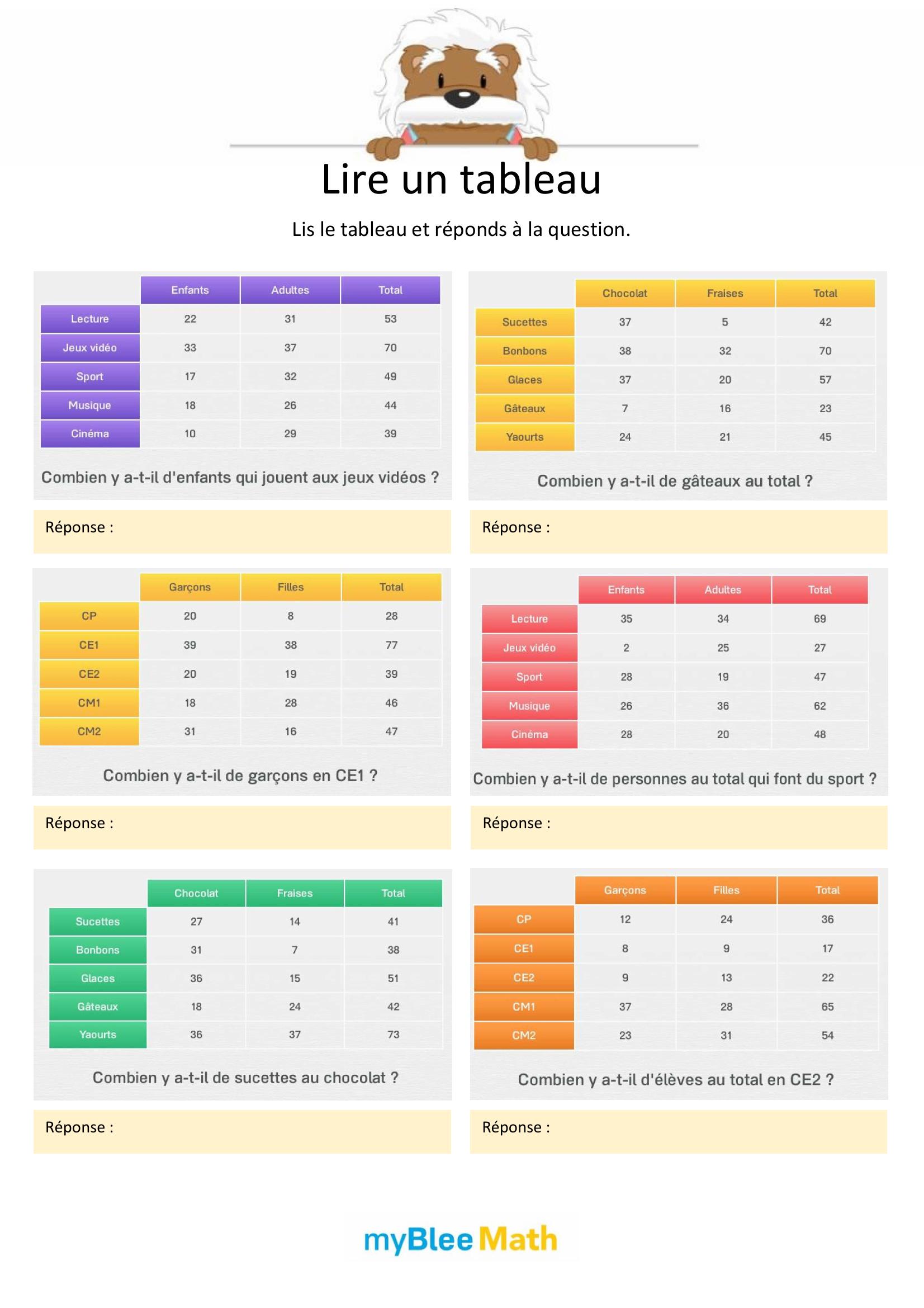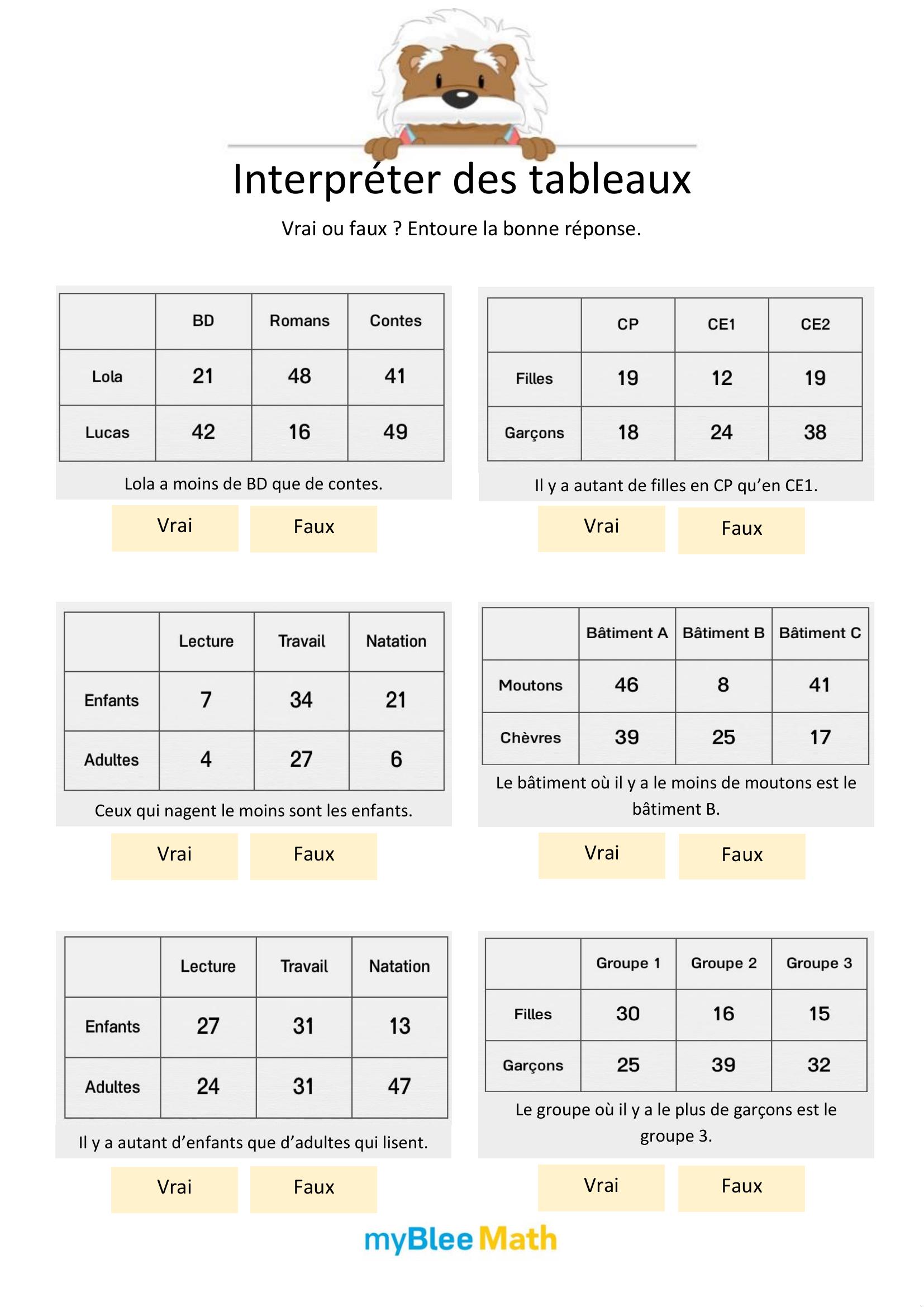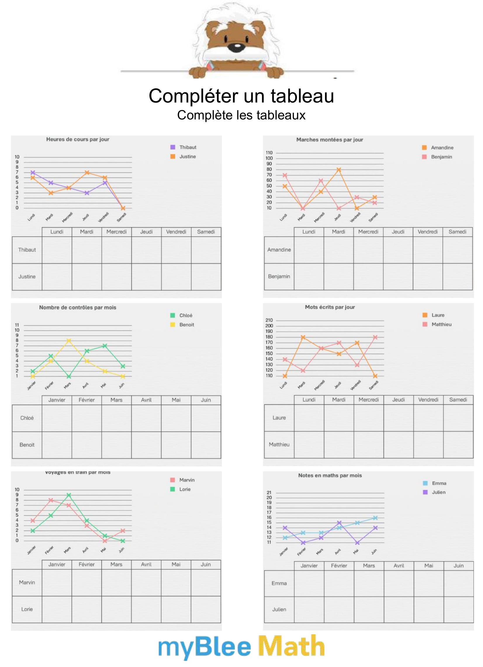 Apprenez à lire et interpréter des tableaux et graphiques avec nos exercices ludiques et progressifs. Des activités claires pour maîtriser ces outils dès le primaire avec myBlee Math.