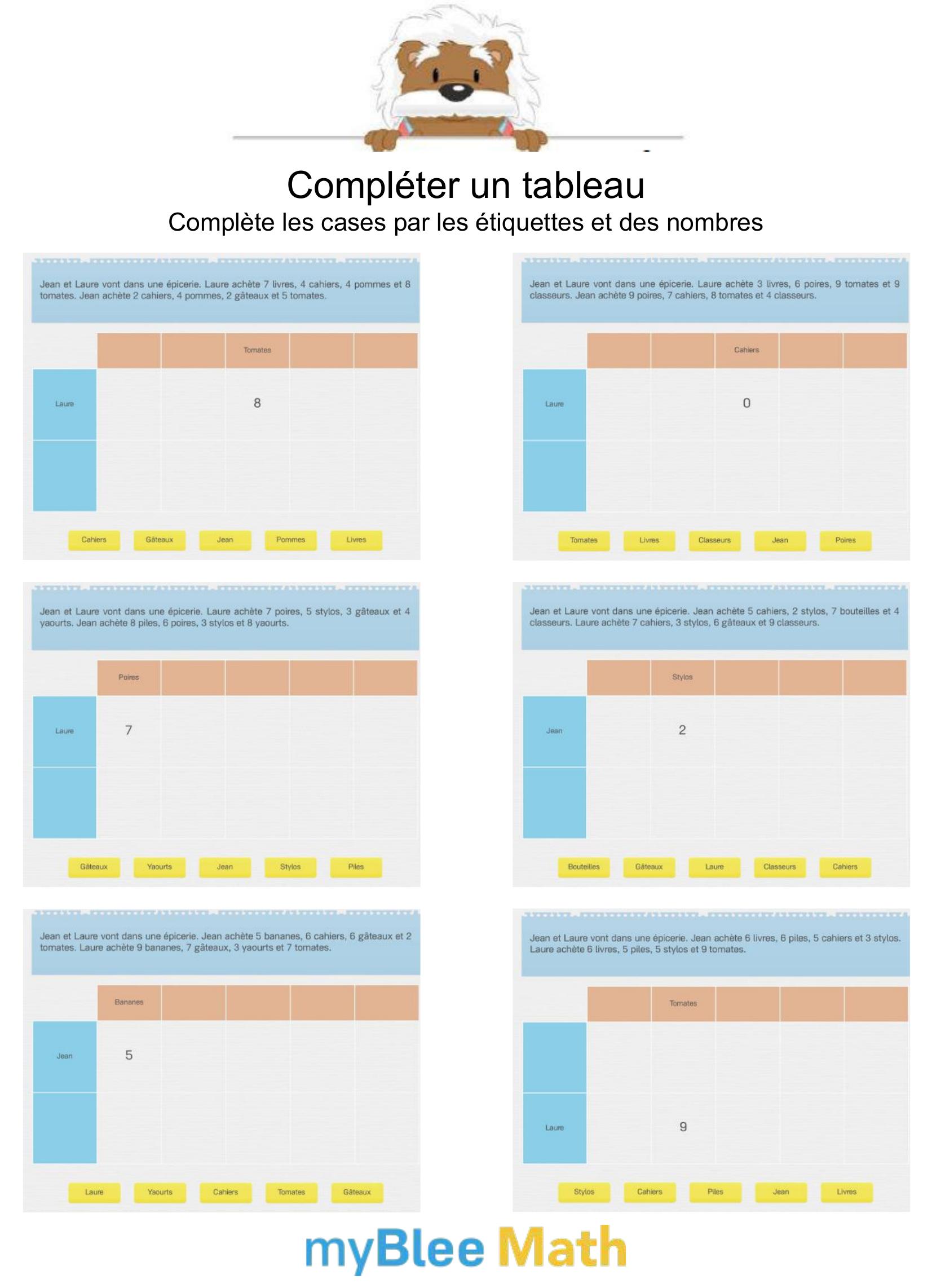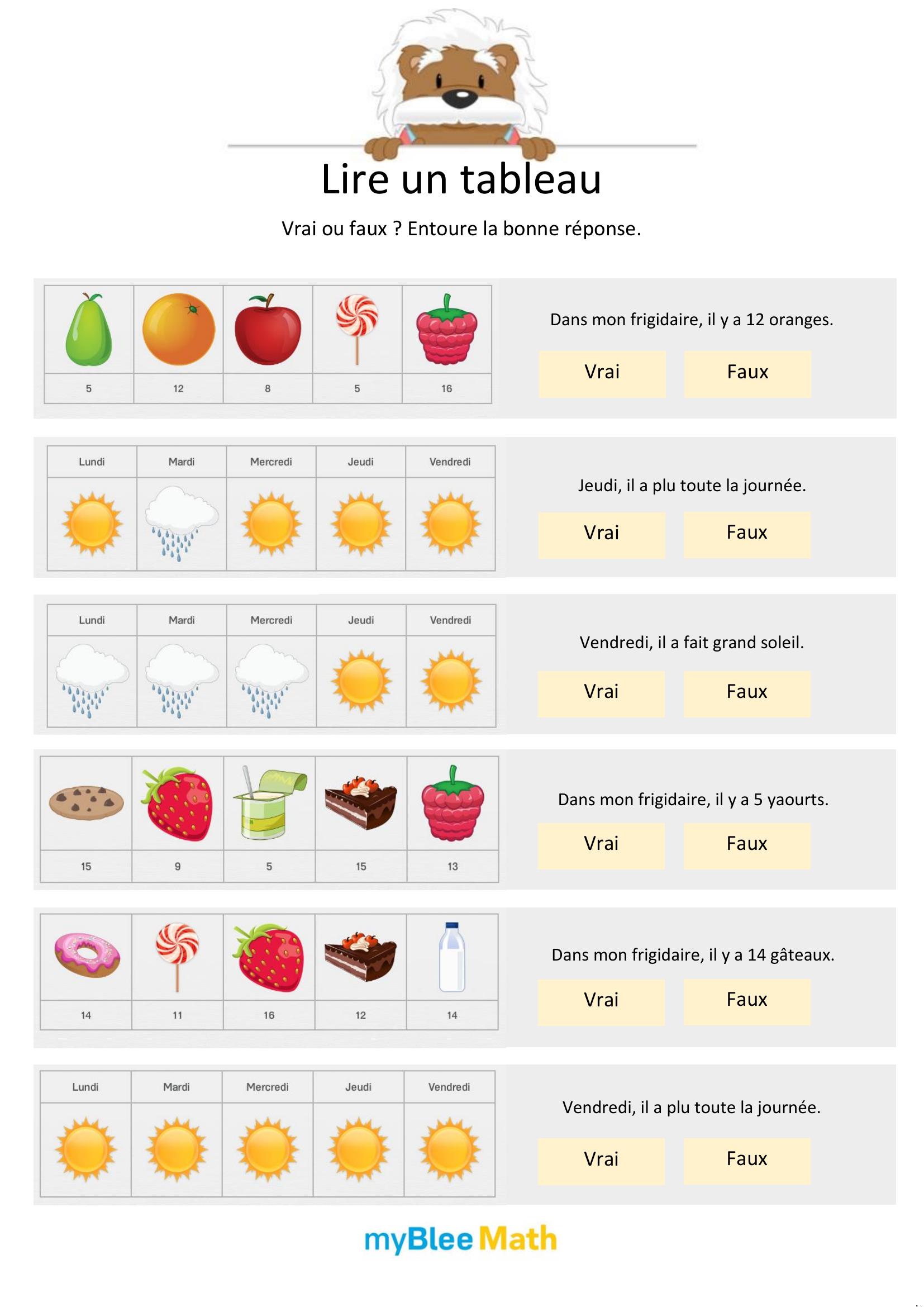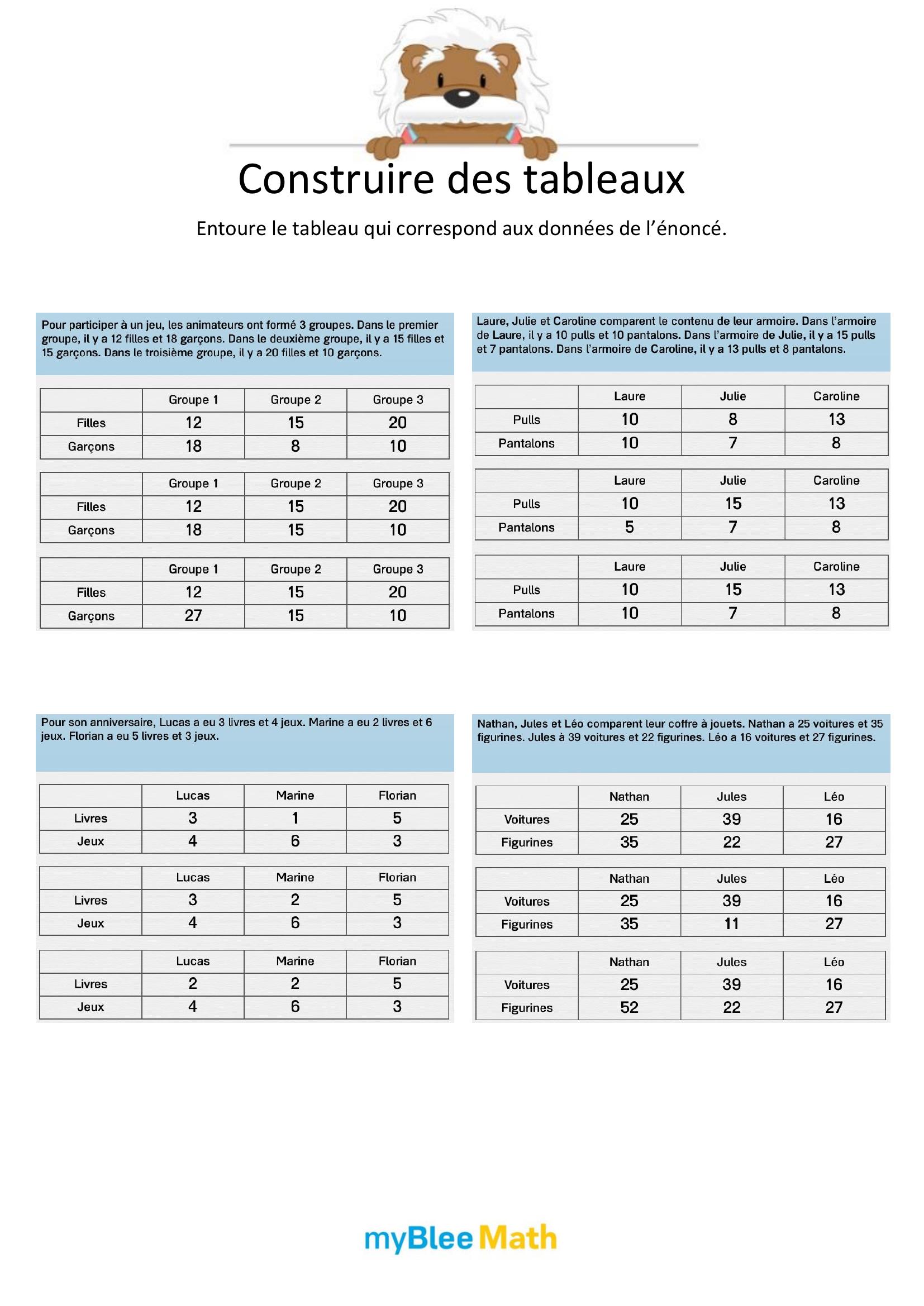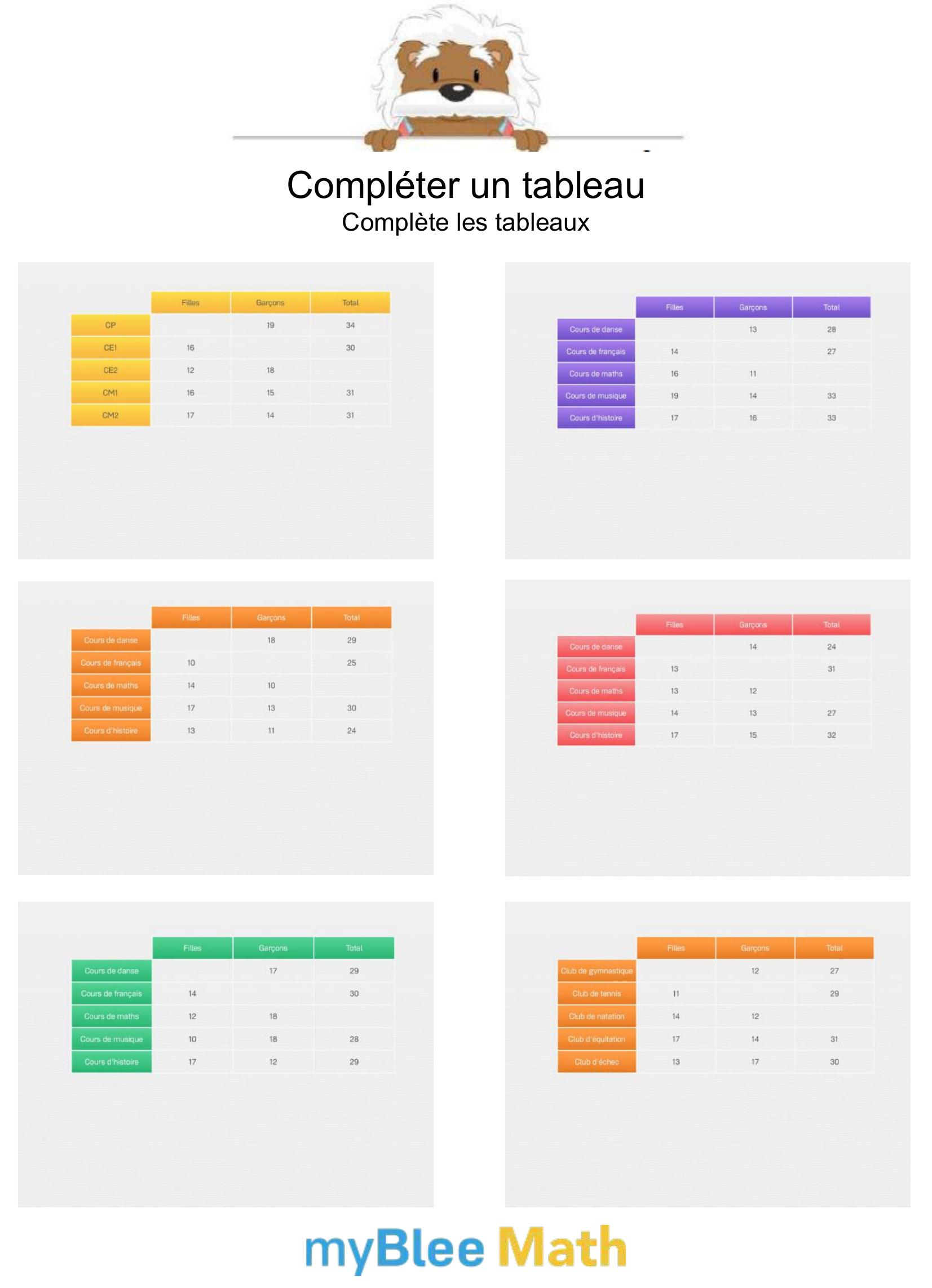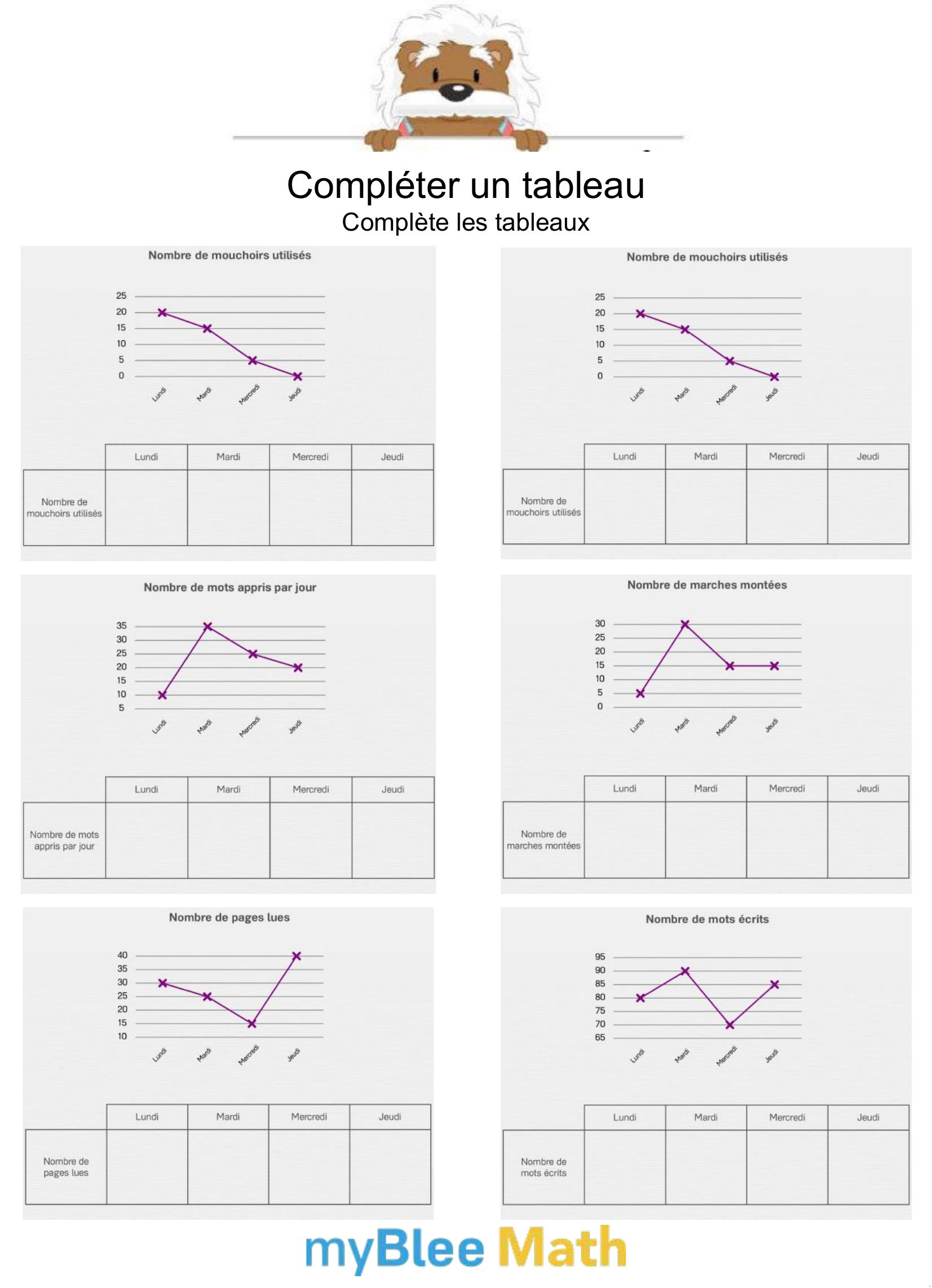 Apprenez à lire et interpréter des tableaux et graphiques avec nos exercices ludiques et progressifs. Des activités claires pour maîtriser ces outils dès le primaire avec myBlee Math.