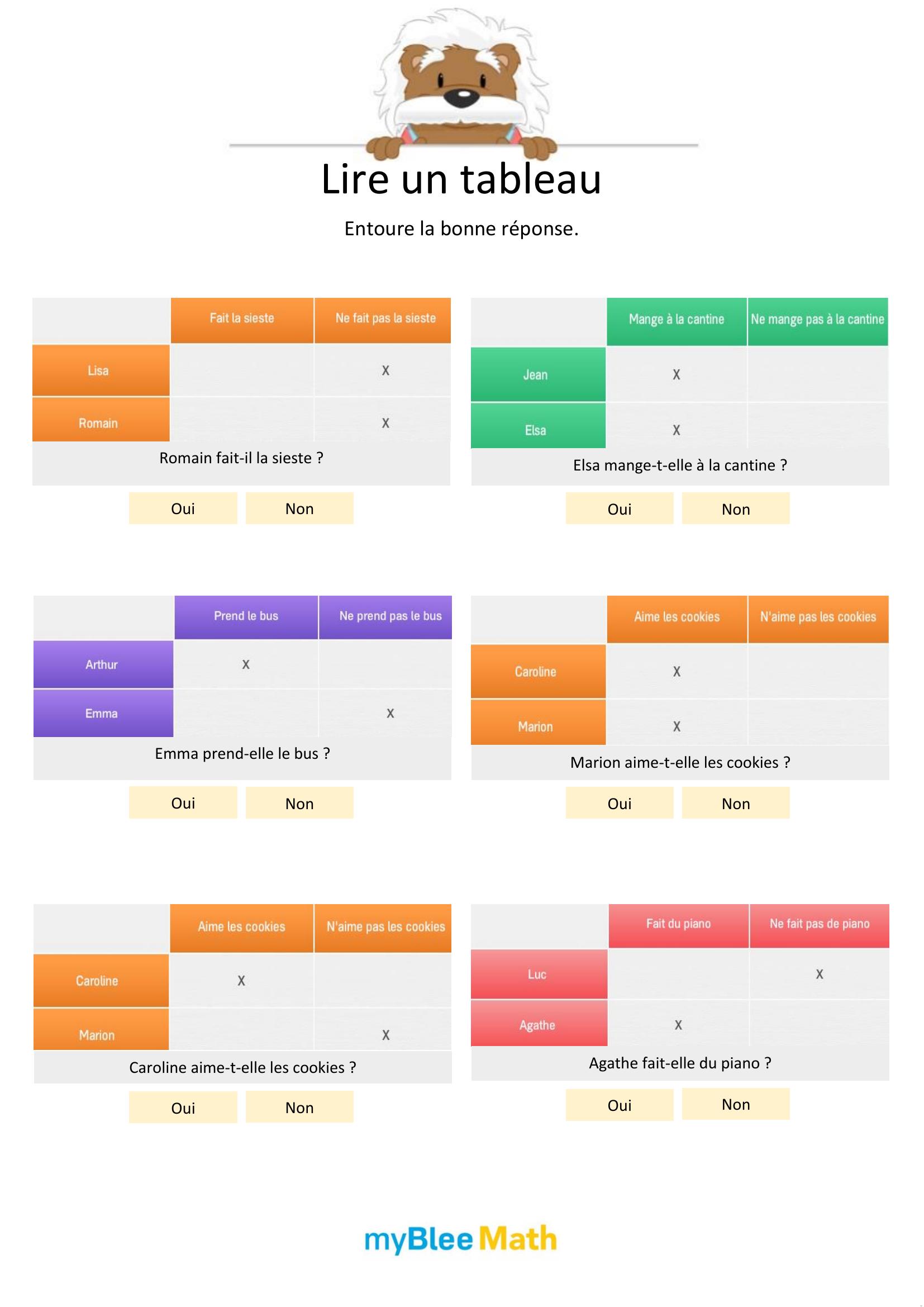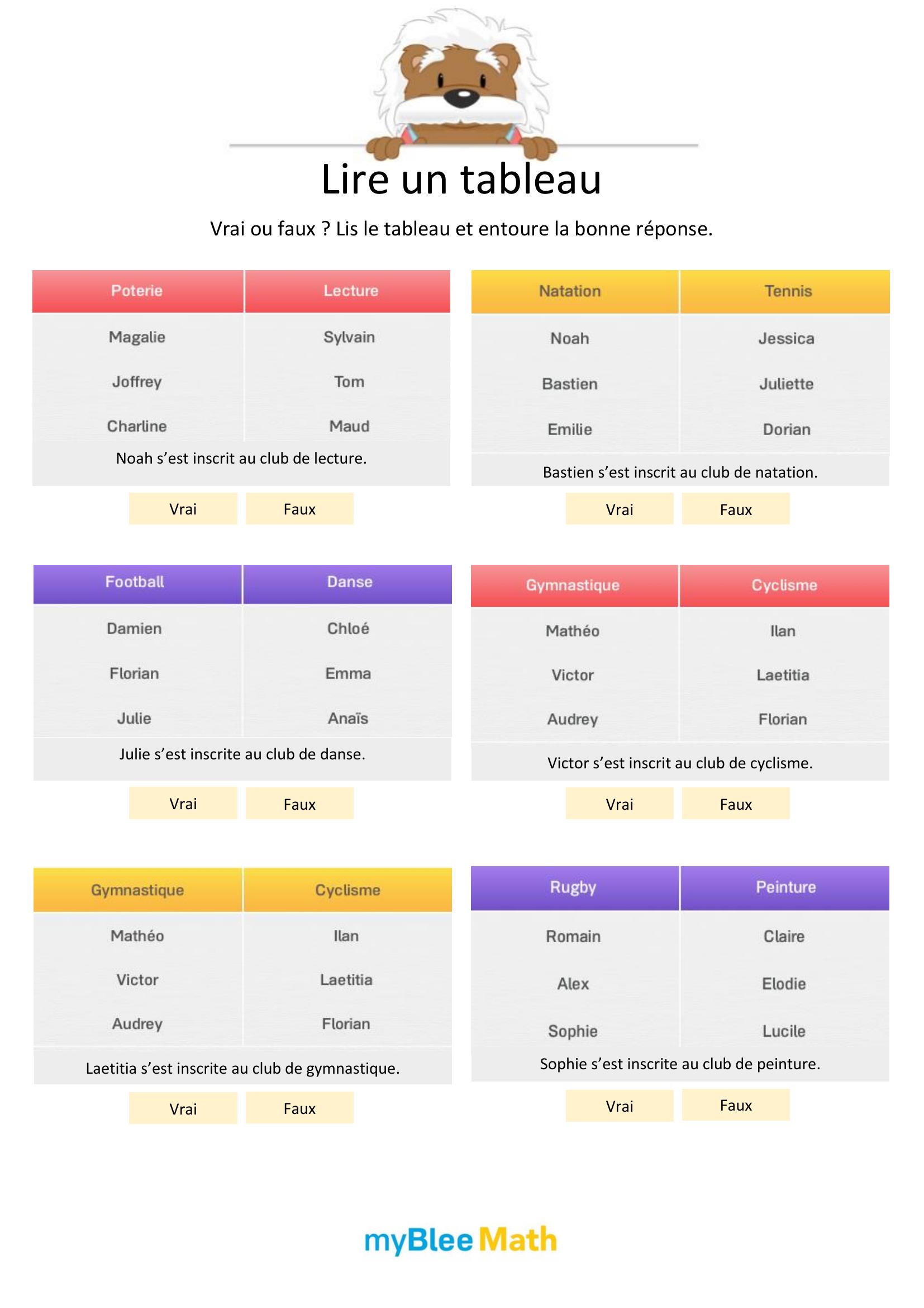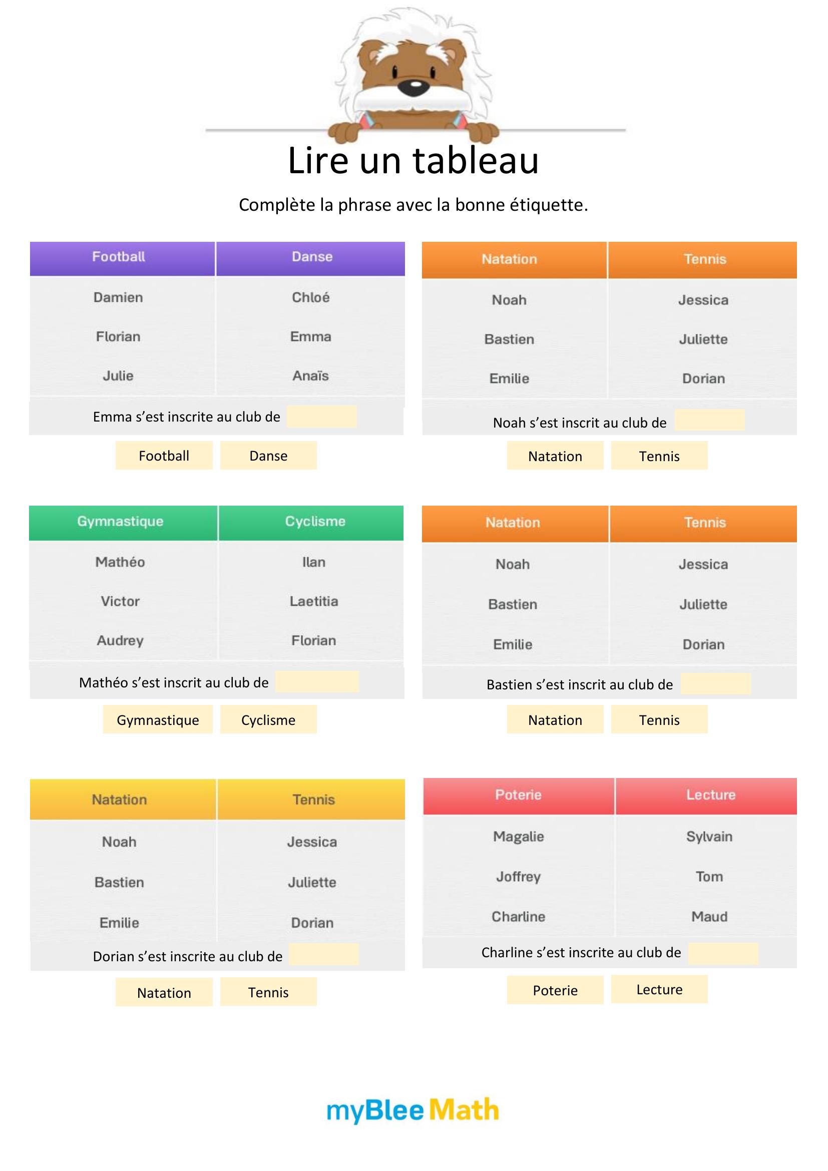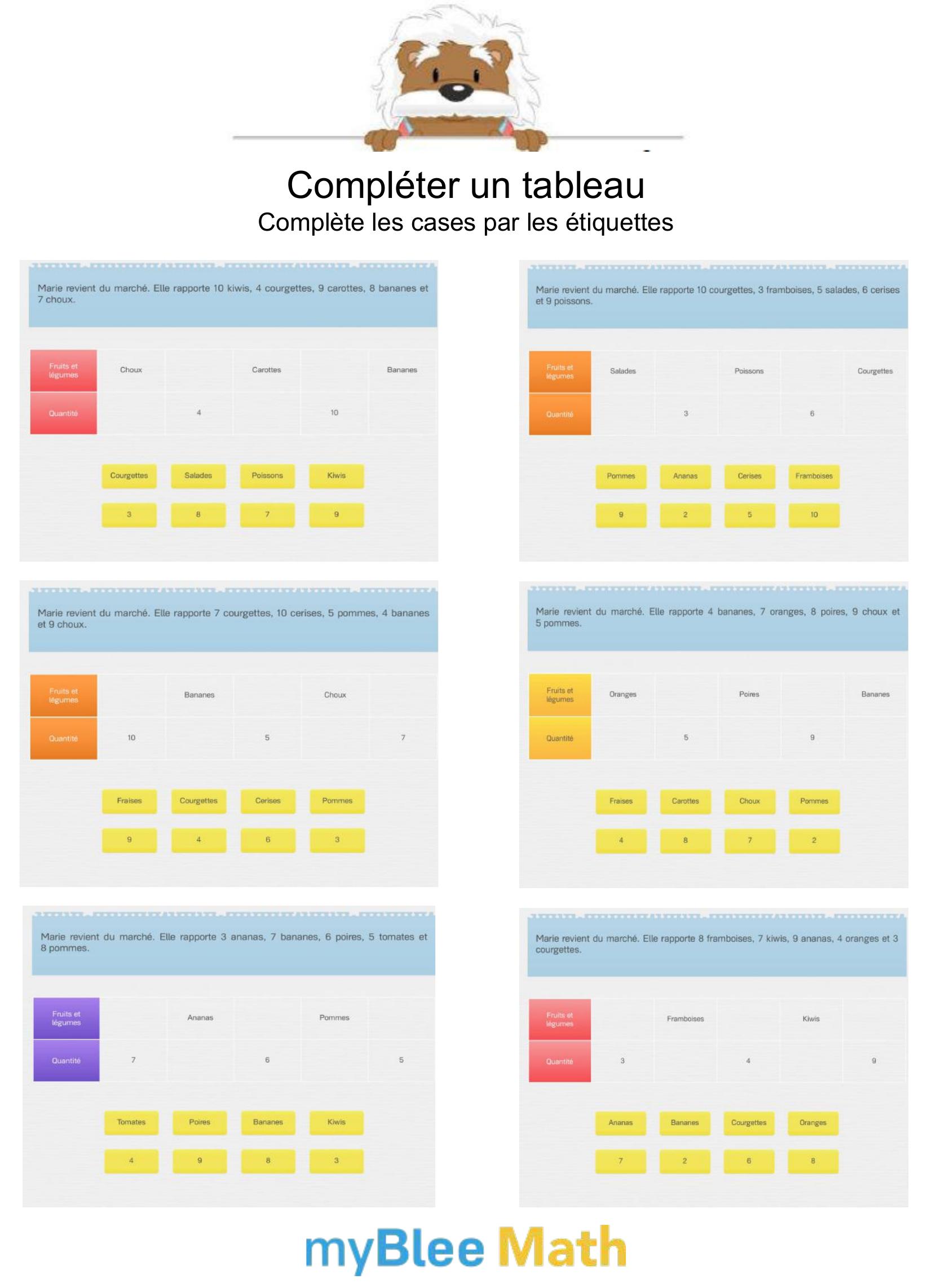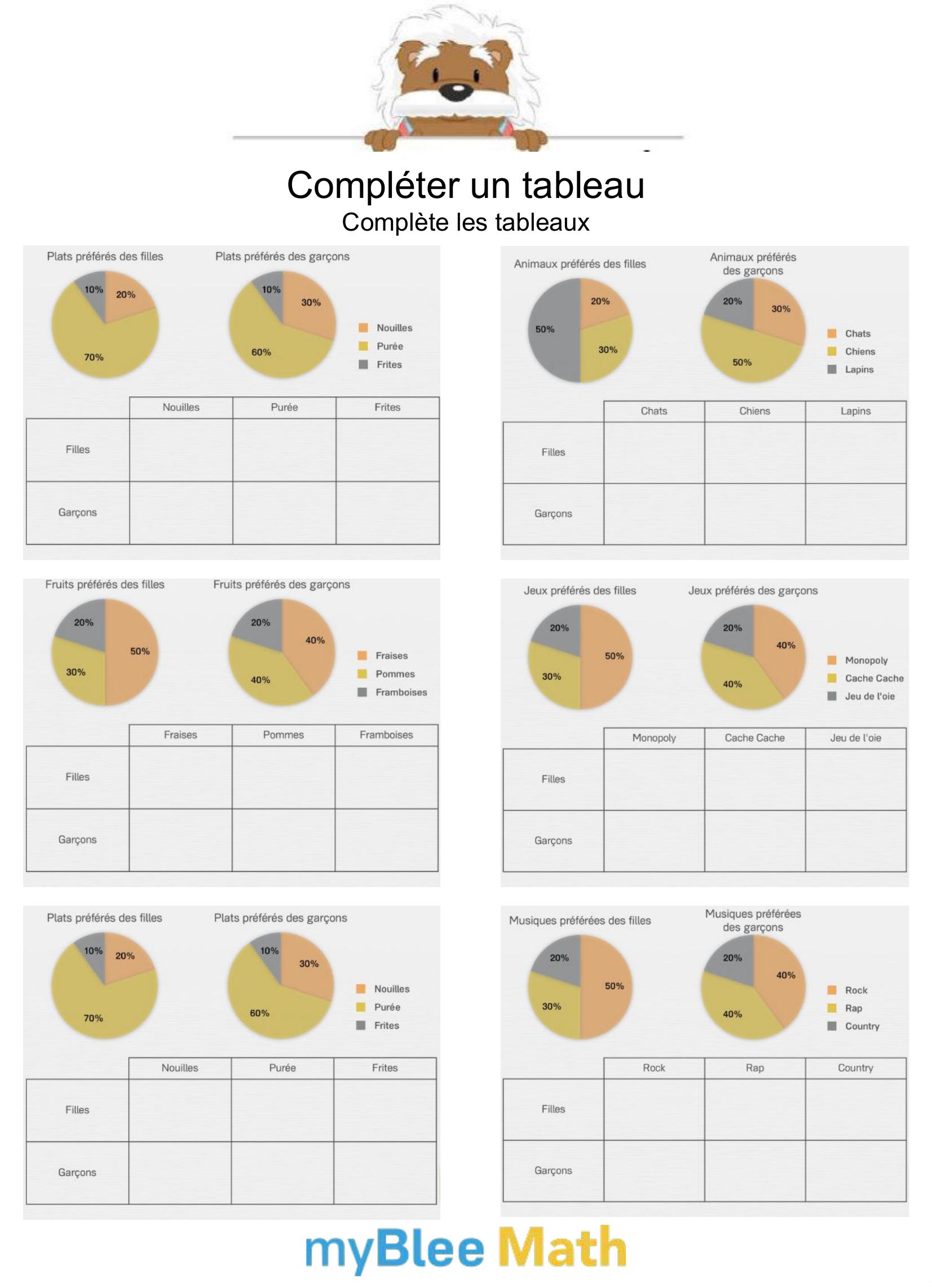 Apprenez à lire et interpréter des tableaux et graphiques avec nos exercices ludiques et progressifs. Des activités claires pour maîtriser ces outils dès le primaire avec myBlee Math.